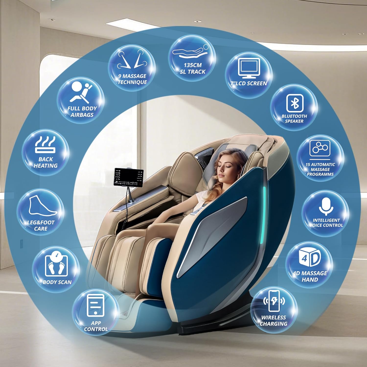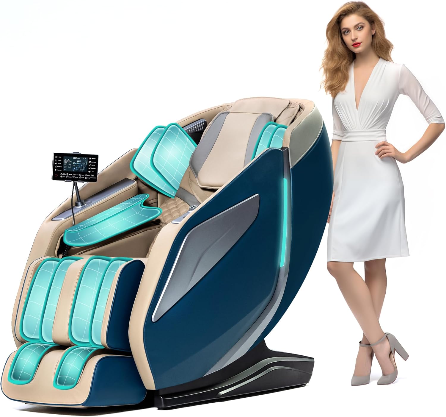 HealthRelife Full Body Massage Chair with Body Scanning, 3D Robotic Hands, Smart Shiatsu Massage Seat Cover with Voice Function, Back Heating (Blue)