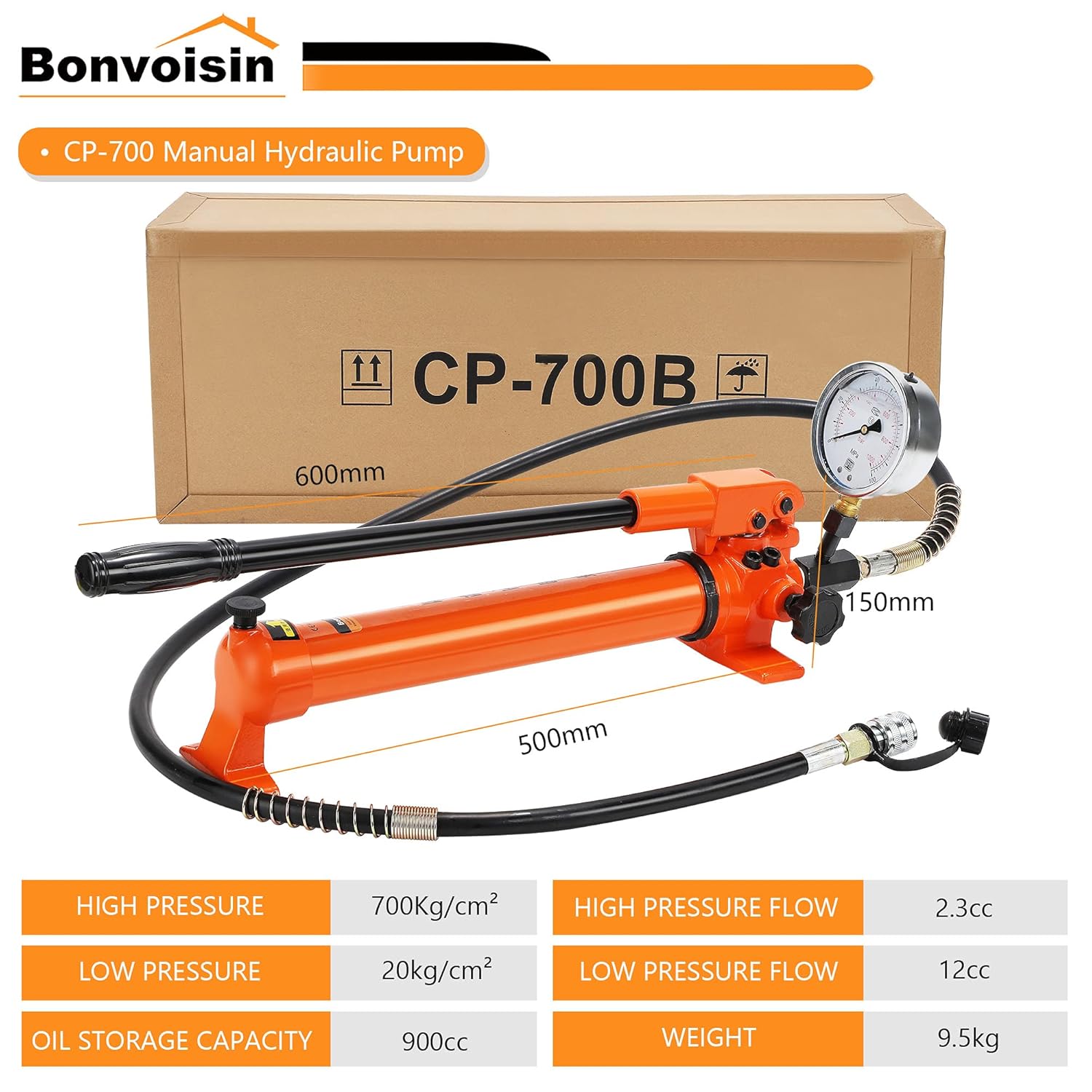 Bonvoisin CP-700 Manual Hydraulic Pump with Pressure Gauge, High Pressure 700 kg/cm2, 900cc Oil Capacity for Hydraulic Tools