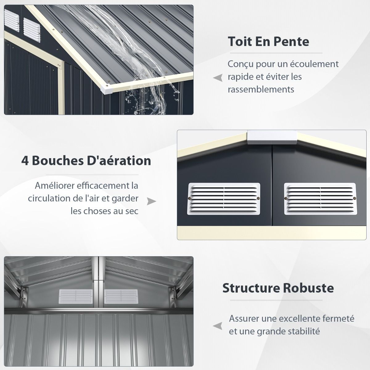 Our garden shed is designed to tidy up your outdoor space. This large shed meets a variety of needs, serving as a tool shed, trash can storage, pet play area, and outdoor relaxation area. Constructed from colored steel, the shed is sturdy and durable. All panels are securely fastened with metal screws, protecting your belongings from wind and rain. Double sliding doors with keyholes allow you to choose the appropriate lock, ensuring the safety of your items. Four ventilation holes enhance airflow and improve storage efficiency. This spacious storage shed occupies 5.29 square meters, meeting all your storage needs. You can easily assemble the shed by following the detailed installation instructions. All parts and accessories are packaged in 3 separate packages; please feel free to contact us with any questions. Features: A sturdy and durable garden shed with ample space. To help you tidy your garden, this garden shed provides 5.29 square meters of floor space to store your long-handled tools, lawnmower, and bicycle. Sliding doors allow for easy access to items. Furthermore, double doors with keyholes allow you to choose the appropriate lock, ensuring the shed's security and preventing accidental entry by small animals. Special Design, Optimized Use: Four ventilation holes increase light and air circulation, helping to prevent odors and reduce moisture buildup. The sloping roof is specially designed to prevent rainwater buildup and rust. These features effectively protect your gardening equipment from wind and rain. Premium Materials, Durable: This outdoor storage shed is constructed from high-quality colored steel plates, ensuring a sturdy structure. Furthermore, metal ground stakes enhance wind resistance and ensure stability. Versatile Use, Suitable for Various Locations: This garden shed can serve not only as a storage shed but also as a pet room, providing a safer and warmer space. Additionally, it can be used as a trash can storage area, keeping your yard tidy. Its minimalist, industrial-style appearance complements any garden style, combining functionality and aesthetics. Assembly Instructions: All accessories and detailed instructions are included in the package. If you have any questions or find any damage during shipping, please contact us immediately. Product Features: Provides 5.29 square meters of storage space. The storage shed allows for easy access to your items. Double sliding doors ensure secure storage. Four ventilation holes effectively reduce sunlight exposure and odors. Sloping roof for rapid rainwater drainage. Durable colored steel sheet creates a sturdy structure. Can be used as a tool shed, pet area, and garbage room. All parts are packaged in 3 or 4 individual boxes. Product Specifications: Color: Gray. Material: Colored steel. Product Dimensions: 277 x 191 x 202 cm (Length x Width x Height). Wind Resistance: 18 m/s. Package Contents: 1 garden shed. 1 set of assembly instructions.