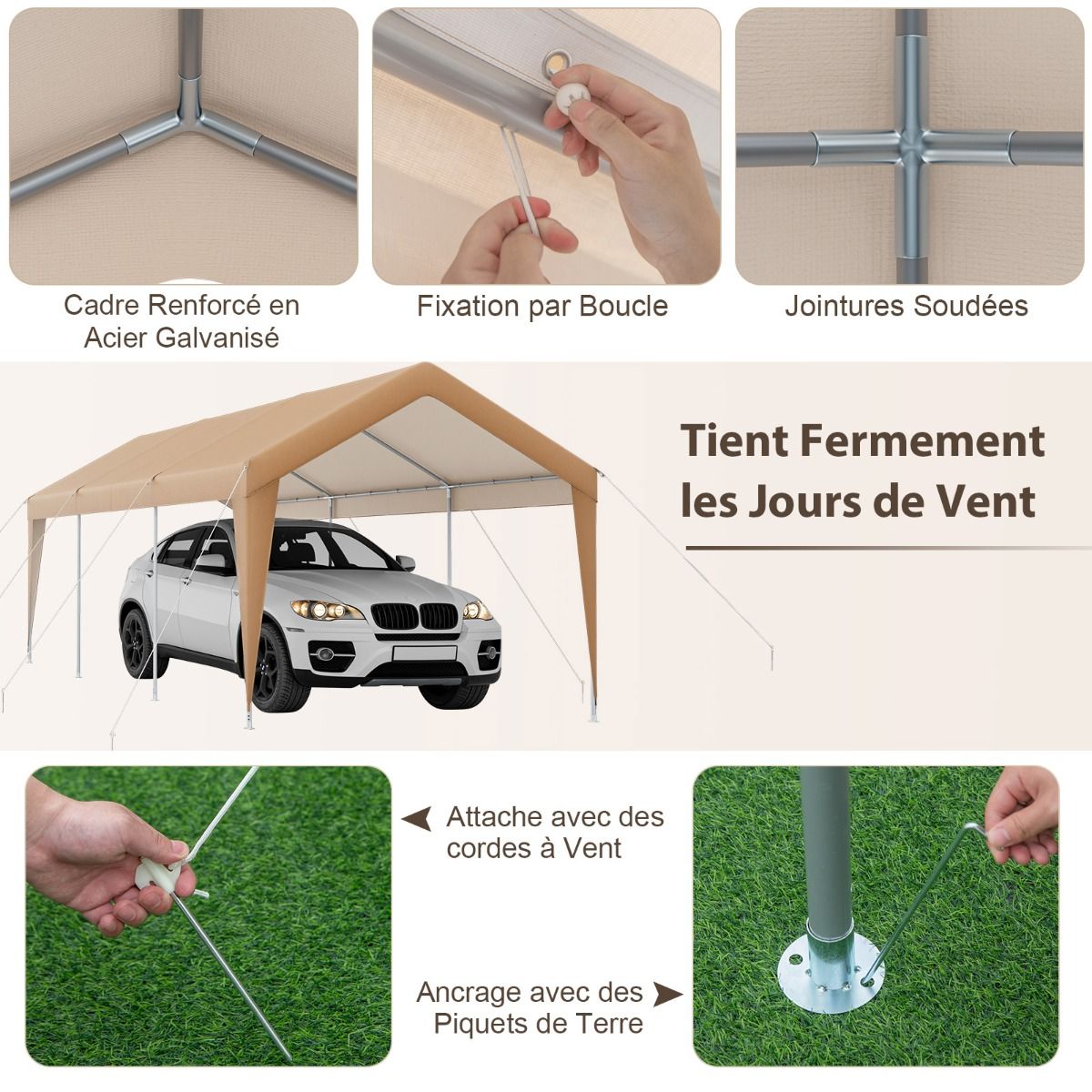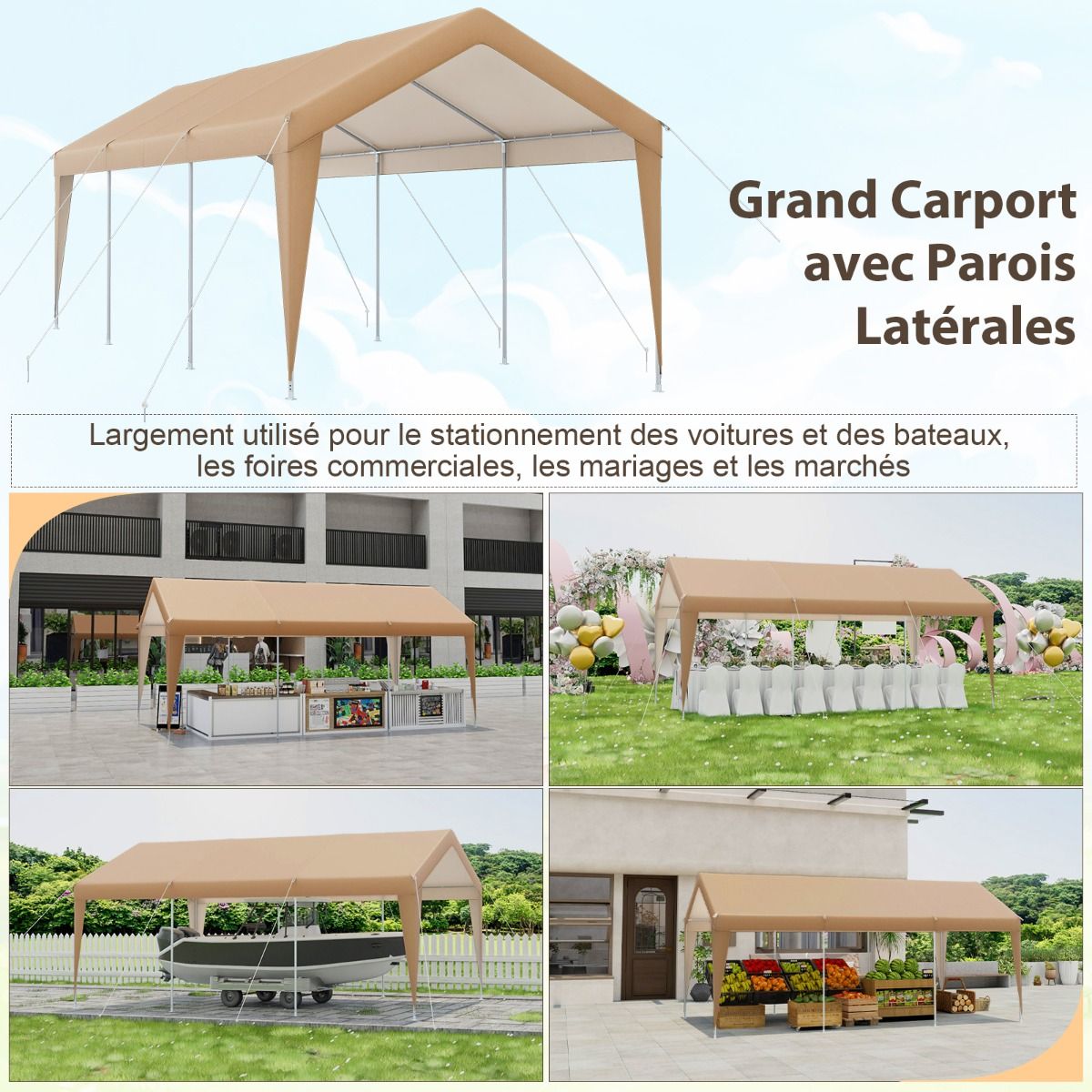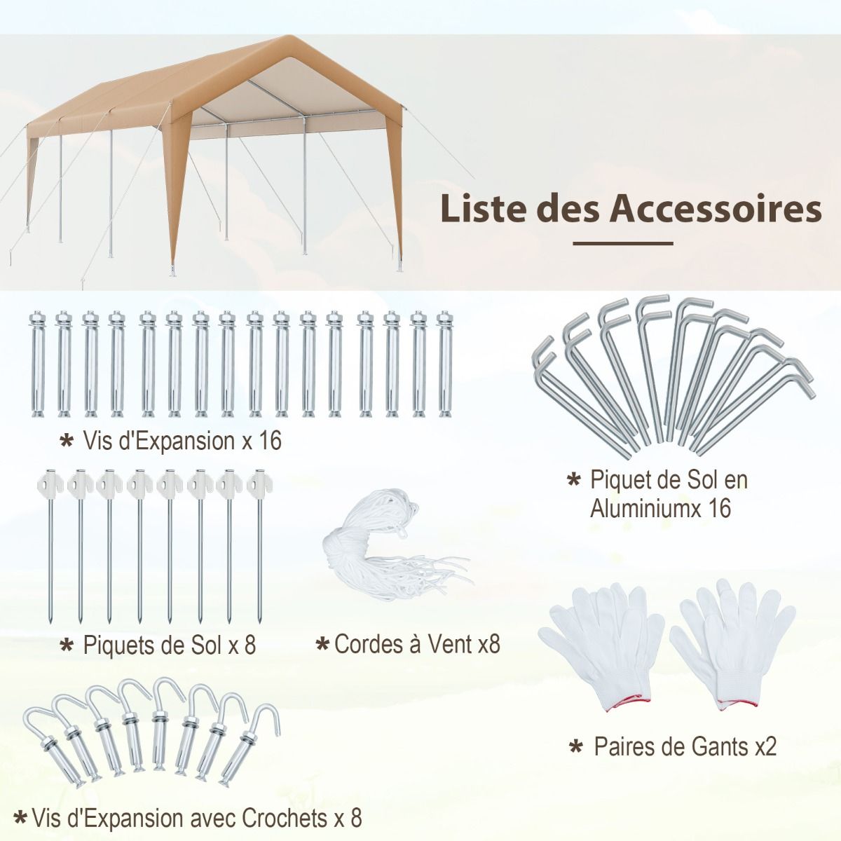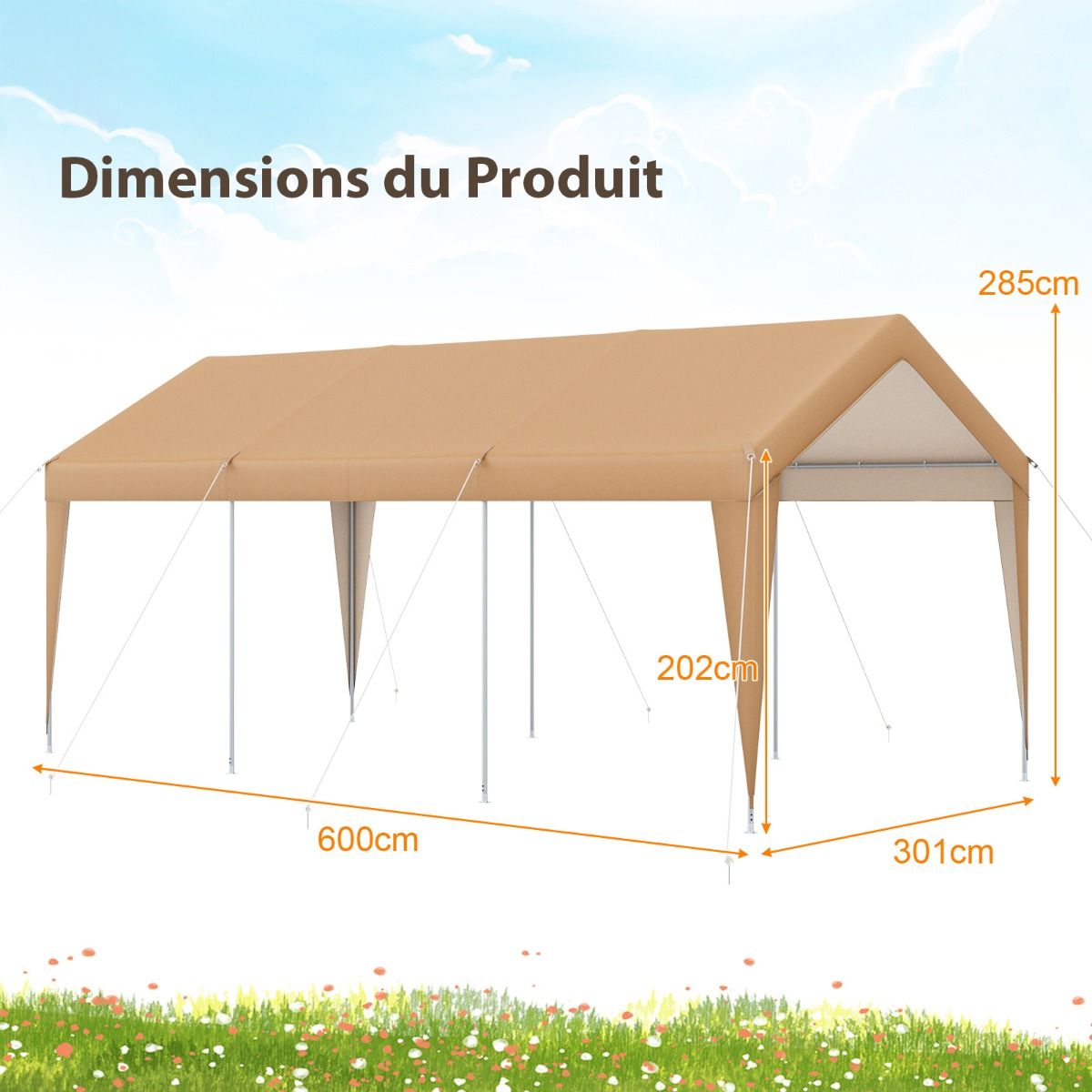 Our carport provides ample parking space for your vehicle, perfect for a variety of outdoor activities. You can use it as a gazebo in your garden or pool area. For enhanced sturdiness and durability, the support frame is made of galvanized metal tubing, effectively preventing rust. The canopy is made of durable, tear-resistant, UV-resistant, and waterproof 180g PE fabric, suitable for all seasons and providing comprehensive protection. We provide all necessary installation accessories. Note: Please clear snow from the carport roof promptly after snowfall to prevent damage. Features: Sturdy Metal Frame: The metal support frame is made of galvanized metal tubing, rust-proof and resistant to deformation. It features triangular reinforcing beams and sturdy connectors to reduce the risk of structural collapse under extreme weather conditions. Weatherproof Awning Fabric: This outdoor awning uses premium 180g double-layer PE fabric, which is not only rainproof, windproof, and snowproof, but also has excellent UPF50+ sun protection, protecting your belongings year-round. Superior Stability: This garage tent comes with a full range of accessories to secure it to various terrains. It comes with 16 aluminum ground stakes and 8 other ground stakes to enhance wind resistance on grass; 16 expansion bolts and 8 hook-type expansion bolts to improve stability on hard surfaces. Multifunctional design: This portable garage tent can be used not only as a protective cover for cars and boats, but also as a garden gazebo on lawns or poolside. It can also be used as a party tent for weddings, celebrations, and other events. Extra-large shade area: The awning measures 301 x 600 x 285 cm, providing ample space for your vehicles, trucks, boats, heavy machinery, etc. Furthermore, all components are secured with elastic ropes and a set of fixing screws for easy installation. Robust and durable: Constructed with 1.2mm thick galvanized metal tubing, it is rust-resistant and sturdy. A triangular reinforcing beam at the top effectively prevents structural twisting. Thick PE canvas protects your vehicle from wind and rain. Includes 2 different ground stakes for securing the metal footboard and windproof rope to grass. Includes 2 different expansion bolts for securing the metal footboard and windproof rope to concrete surfaces. Two roller shutter doors with convenient zippers and fasteners for easy opening and closing (AW10019). The support feet have two positions at the bottom for securing the canvas. The awning is secured with elastic ball straps and Velcro. Specifications: Color: Yellow. Material: Double-layered 180g PE, galvanized metal. Overall dimensions: 301 x 600 x 285 cm (L x W x H). Door dimensions: 204 x 193 cm (W x H). (AW10019) Net weight: 56.5 kg. Package includes: 1 x awning, 2 x gloves, 8 x ground stakes, 8 x wind ropes, 8 x hook-type expansion bolts, 16 x aluminum ground stakes, 16 x expansion bolts, 1 x user manual.