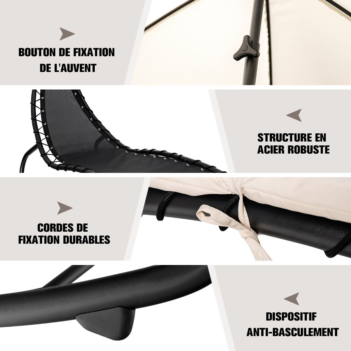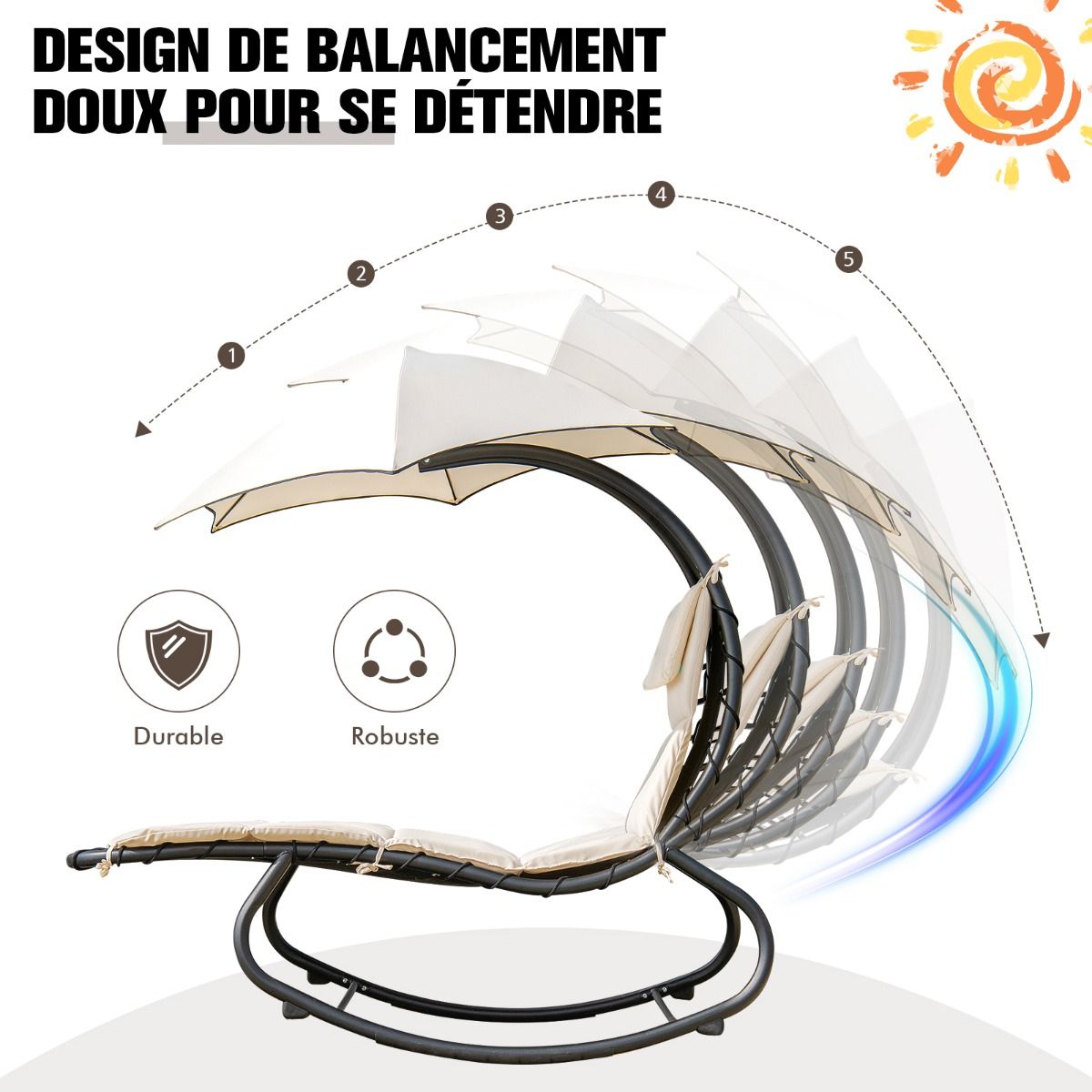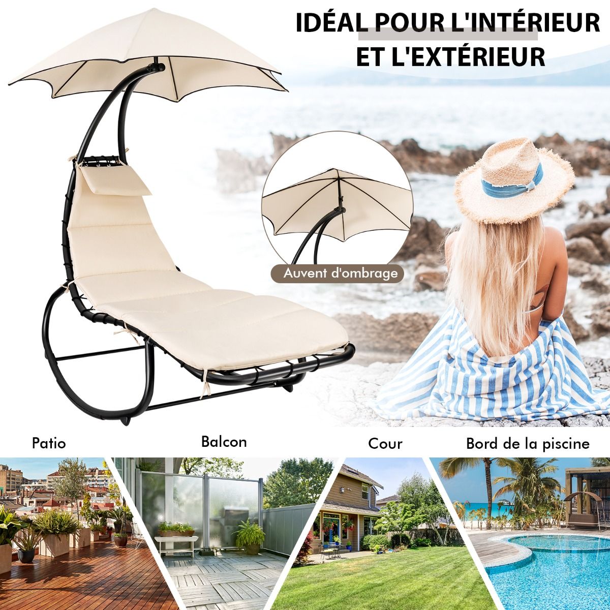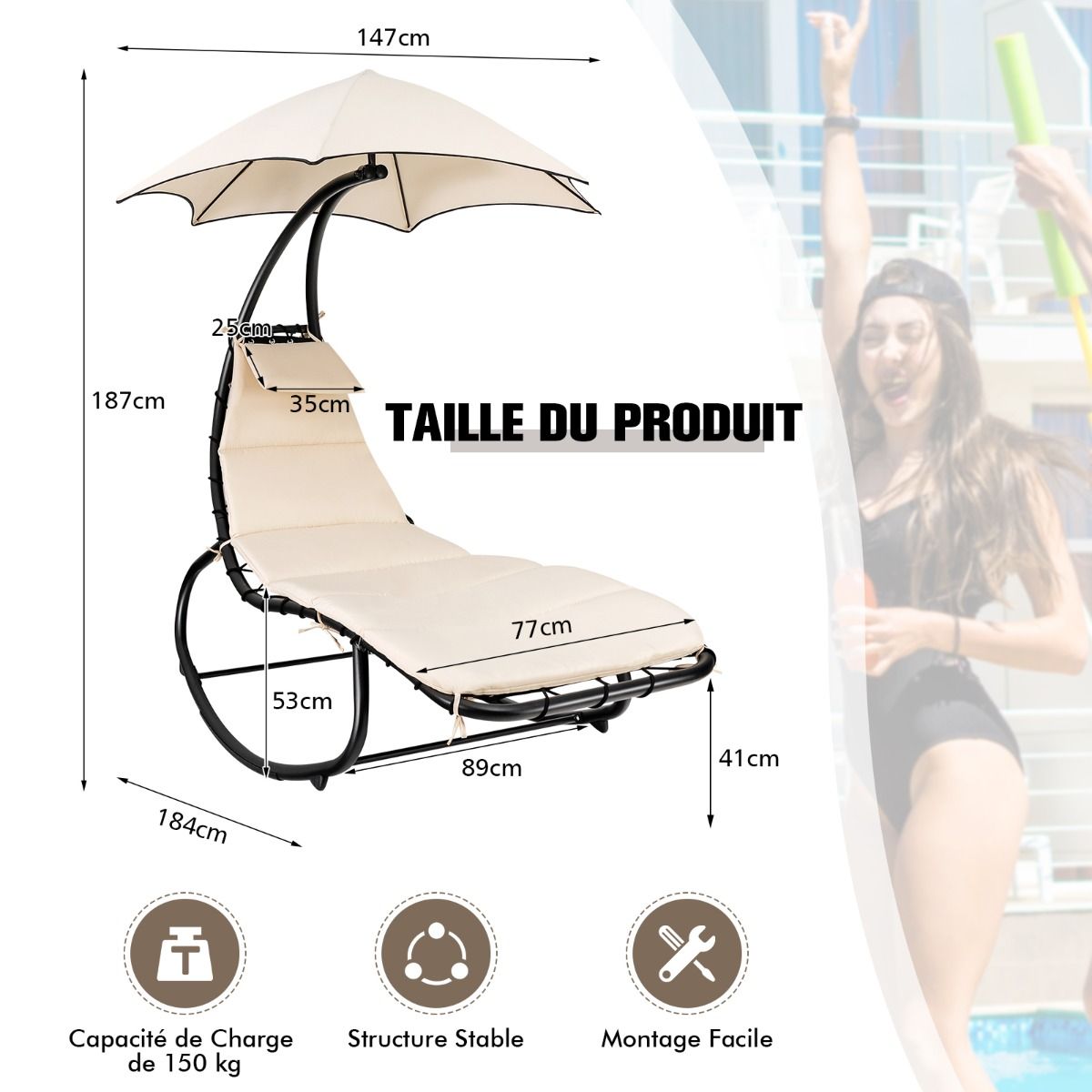 Looking to completely relax in your garden? Our outdoor lounge chair is for you. Its smooth rocking design allows for ultimate relaxation. Furthermore, the curved frame reduces pressure on your lower back and spine. Made with a thick polyester-cotton blend fabric, a fully padded seat, and an extra headrest, it provides a comfortable resting experience. A rust-resistant steel frame and anti-tipping device ensure the lounge chair's stability and sturdiness, supporting a maximum weight of 150 kg. We've also included a sunshade to shield you from the sun. The sunshade can be easily installed and removed using the connection buttons. Clear instructions and all necessary accessories make assembly a breeze. Straps securely fasten the seat to the frame. This lounge chair is perfect for porches, gardens, balconies, patios, patios, poolside, beaches, and more. Product Features: Smooth rocking and curved design. Our lounge chair features a high-quality gliding mechanism that gently rocks back and forth, effectively relieving fatigue after work or study. The curve of this hammock conforms to the natural curve of the spine, preventing fatigue even after long periods of lying down. Fully padded with a headrest, this hammock chair is made of polyester fabric and cotton filling, offering softness, comfort, water resistance, and fade resistance for a comfortable and durable sleeping experience. The headrest design further enhances comfort. Featuring a high-quality, large-area awning, this hammock chair is suitable for both indoor and outdoor use, meeting various needs. Ideal for balconies, patios, porches, patios, poolside, beaches, and other locations. When not in use, the awning can be easily removed by simply rotating the locking knob. The robust and durable structure uses powder-coated steel and breathable fabric. The sturdy steel frame is durable, rust-proof, and corrosion-resistant, supporting up to 150 kg. Furthermore, the bottom anti-tipping device further enhances the overall stability of the hammock. Easy Assembly and DisassemblyFollowing the instructions, you can easily assemble and disassemble the hammock. Sturdy securing ropes help you easily secure the cushion to the frame. In addition, the product includes all the necessary hardware accessories, allowing you to quickly find everything you need and complete the installation. Features: Powerful yet gentle rocking motion for a comfortable sleep experience; perfect for reading and naps; polyester fabric and vertical cotton filling for a soft touch and durability; curved design and thickened headrest for added comfort; high-quality awning effectively blocks strong sunlight; awning with a locking button for easy installation and removal; suitable for porches, gardens, balconies, terraces, patios, poolside, beaches, and other locations; rust-resistant steel frame for durability and stability; can support up to 150 kg; anti-tipping device at the bottom; sturdy securing ropes ensure the cushion is stable; easy to assemble and disassemble. Specifications: Color: Beige; Material: Polyester fabric + cotton + steel; Overall dimensions: 184 cm x 147 cm x 187 cm (L x W x H); Maximum seat width: 77 cm; Seat thickness: 4 cm; Headrest dimensions: 35 cm x 25 cm (L x W); Inner diameter: Sunshade: 147 cm; Net weight: 19 kg; Load capacity: 150 kg; Delivery: Includes: 1 x Hanging sun lounger with sunshade and cushions, 1 x Assembly instructions