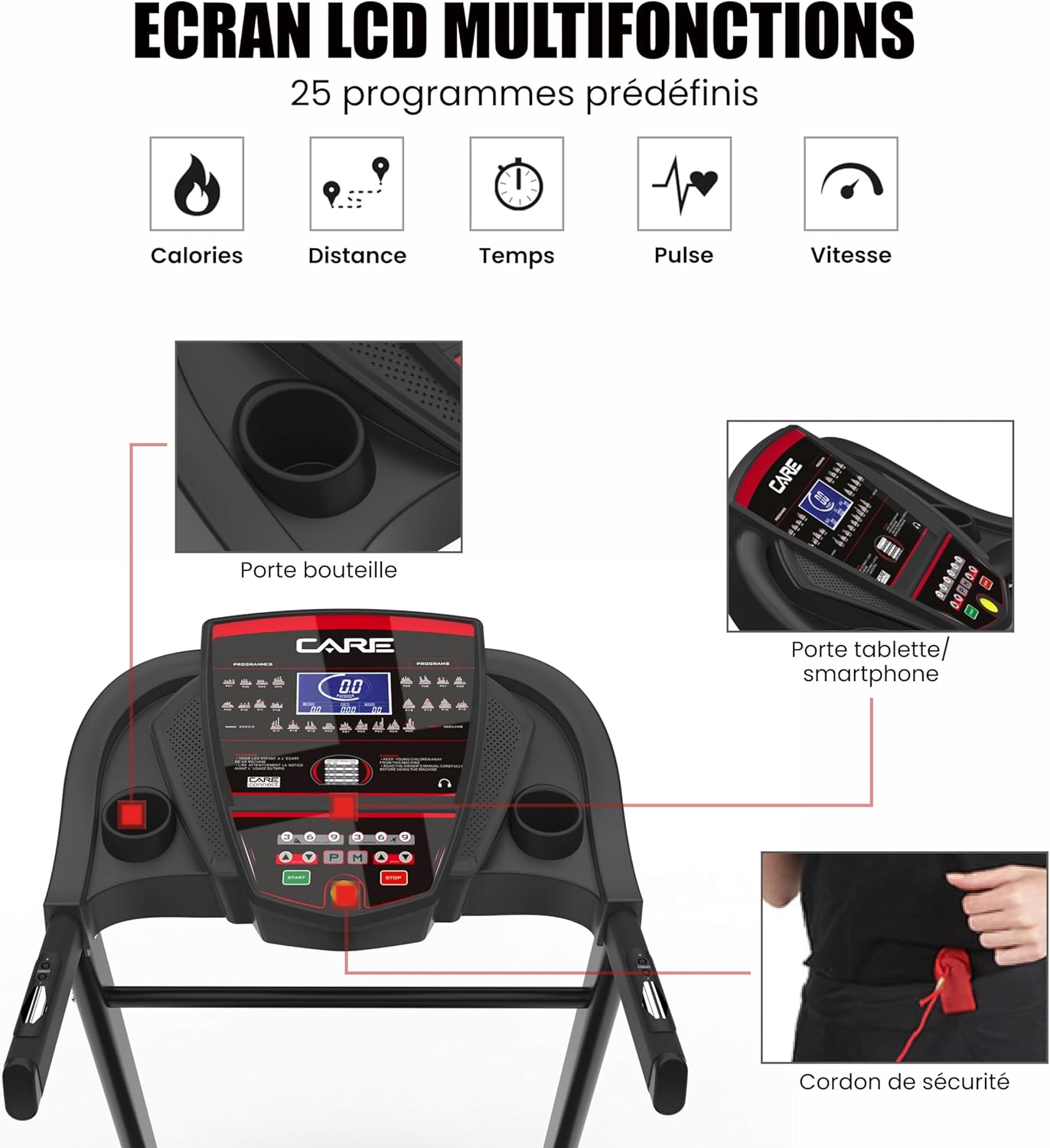 Jogging and Walking at Home: Rediscover the joy and benefits of running without the risks of outdoor exercise. This fitness equipment allows you to adjust your running speed from 1 km/h to 18 km/h, making it ideal for walking, running, and sprinting. Whether you're looking to easily recover from a workout or for regular or high-intensity training, this incline treadmill has you covered, thanks to its quiet yet powerful motor. Electric Incline Adjustment, Extra-Large Running Board: The treadmill boasts an extra-large running board of 140 x 48 cm, giving you a wider range of motion. This foldable treadmill features electric incline adjustment for easy incline control. It's equipped with a 2 hp continuous power motor (maximum 3 hp) and a quick-adjust button, allowing you to easily adjust your running intensity from 1 km/h to 18 km/h. 25 Training Programs and Kinomap App: The treadmill console offers 25 training programs. The extensive program selection allows you to freely switch between cardio and endurance running and track your training progress. The Kinomap app is a personalized training guide that connects wirelessly. Complete workout tracking: Access five integrated functions on the console in seconds, displaying time, distance, speed, calories burned, and heart rate. Built-in speakers add rhythm to your workout. Foldable with wheels: This electric treadmill's quick-folding gas spring system makes it easy to store and saves space.