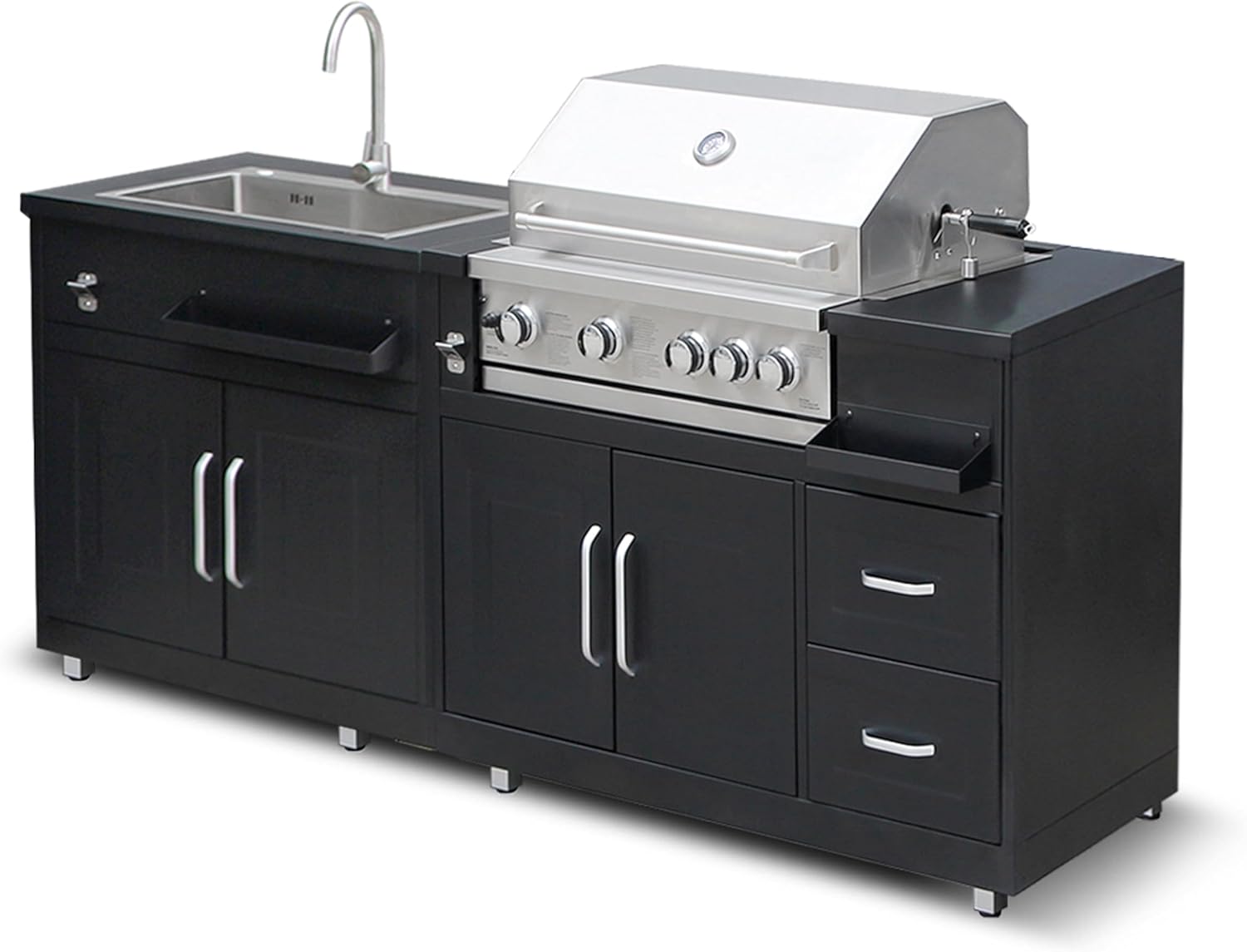 Durable and hygienic stainless steel finish; infrared rotating grill with rear burner for professional rotating cooking; numerous practical accessories (including faucet, drain hose, water hose, and stopper); our set includes a sink and gas grill, helping you transform your outdoor space into a stunning cooking area. The sink is perfectly sized (96 cm high, 81 cm wide, 66 cm deep) with adjustable feet for a perfect fit, and features storage shelves, a sponge tray, and an integrated bottle opener. All components are made of corrosion-resistant and easy-to-clean stainless steel. The gas grill features four tubular burners and one infrared burner with a built-in thermometer for precise temperature control. It also includes drawers for storing cutlery and condiments, and a dedicated space for gas canisters. This summer, these two appliances will bring you unforgettable culinary experiences and wonderful moments with family and friends! Dimensions: 96 cm high, 203 cm wide, 66 cm deep, weight 88 kg.