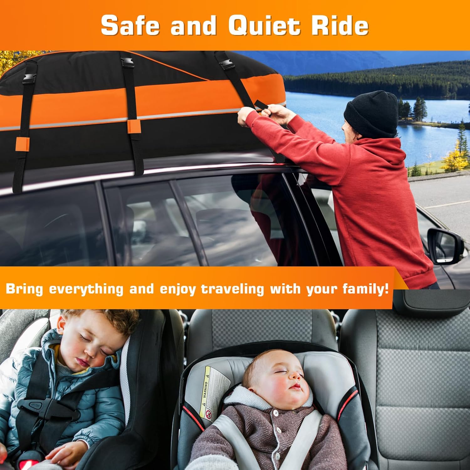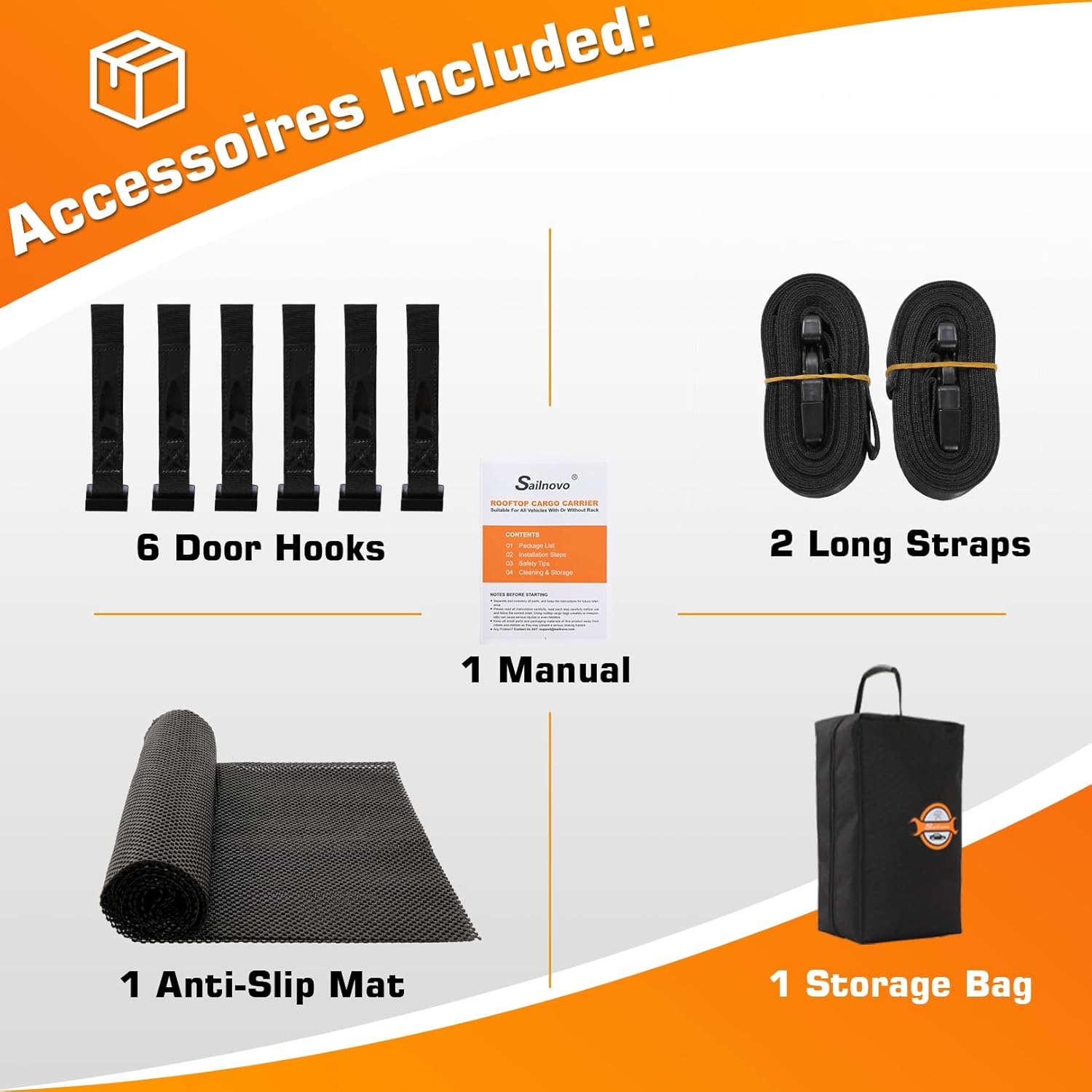 595 Liters Designed specifically to address the limited storage space in your vehicle, its capacity is paramount. Measuring 130 x 99 x 46 cm, this roof bag boasts a massive 595 liters of capacity, easily accommodating luggage for up to six people. Universal Compatibility Equipped with six door hooks and two extra-long adjustable straps, the Sailnovo roof bag fits any size sedan or SUV, regardless of whether it has a roof bar. Easy and quick installation. Superior Waterproof and Tear-Resistant Material Made from military-grade 1000D PVC tarpaulin. Furthermore, we've extended the waterproof curtain and reinforced the waterproof seals and zippers. This waterproof and durable roof bag effectively protects against wind, sand, rain, and snow, safeguarding your belongings from damage. Extremely Secure Design Featuring six reinforced adjustable straps, two extra-long adjustable straps, six door hooks, and a highly stable anti-slip mat, it securely holds your luggage even on bumpy highways. Additionally, reflective strips ensure safe driving at night. The Sailnovo roof box is ideal for family trips and anyone needing extra space. It offers all the features of a roof box without the need for a full-size one! Videos demonstrate how to use the product. Videos guide you through installation. Videos compare several products. Videos show the unboxing process. Seller video included. Completely waterproof, the zippers have a high-strength coating for excellent weather resistance. This roof box is made of durable 1000D PVC material, capable of withstanding rough handling. The overall dimensions are 130cm x 100cm x 46cm, with a volume of 21 cubic feet. Easily accommodates luggage for 6 to 8 people. When not in use, its compact design allows you to fold it up for easy storage. Increases trunk space without compromising passenger comfort. Equipped with 6 door hooks and 2 additional straps, it fits all vehicle types, whether or not a roof rack is installed, and is compatible with SUVs, minivans, station wagons, sedans, hatchbacks, pickups, MPVs, etc. Open the car door and carefully pull the weatherstripping. While pulling the weatherstripping, hook one of the door hooks onto the metal door frame. Gently push the weatherstripping back into place by hand, then close the car door.