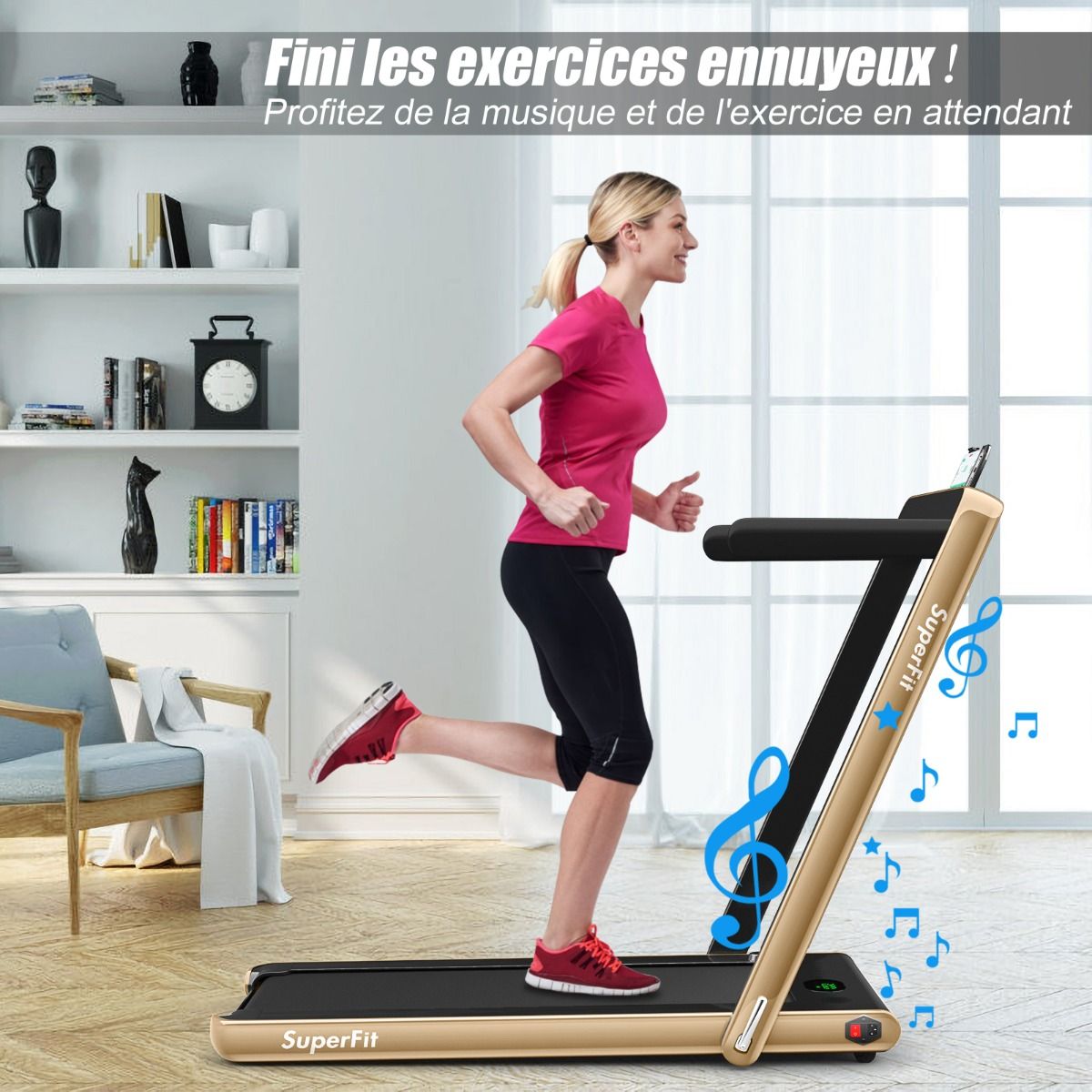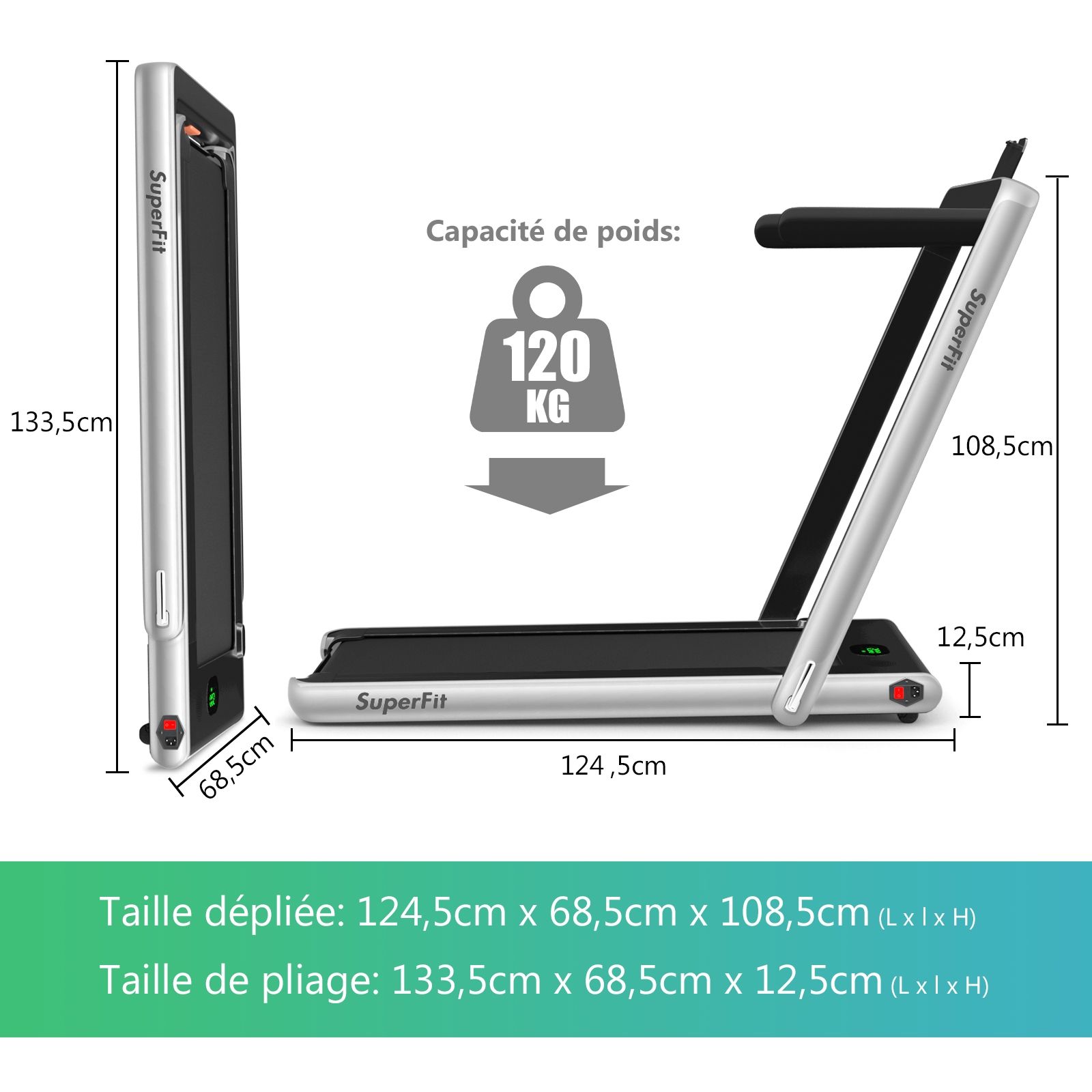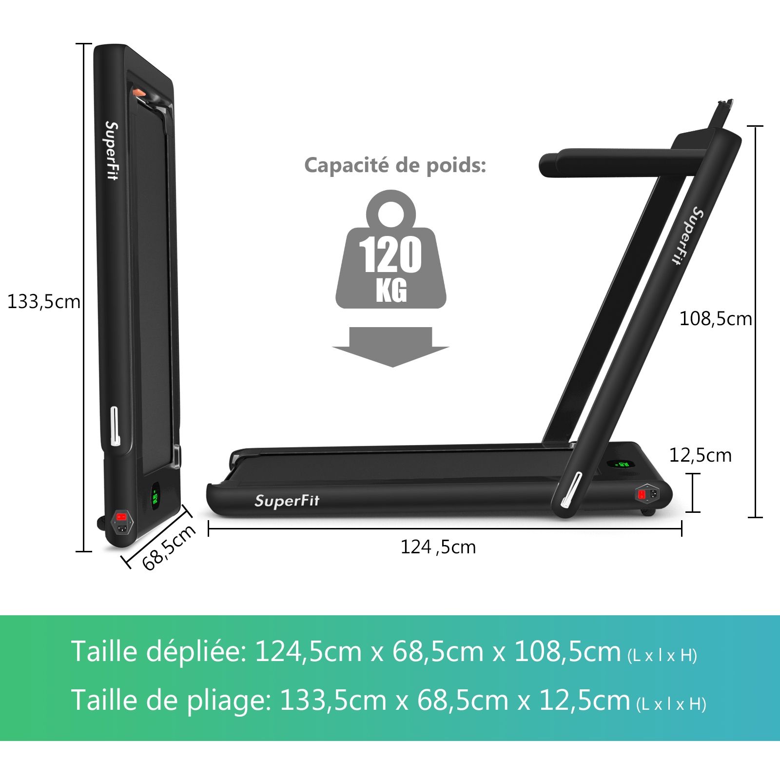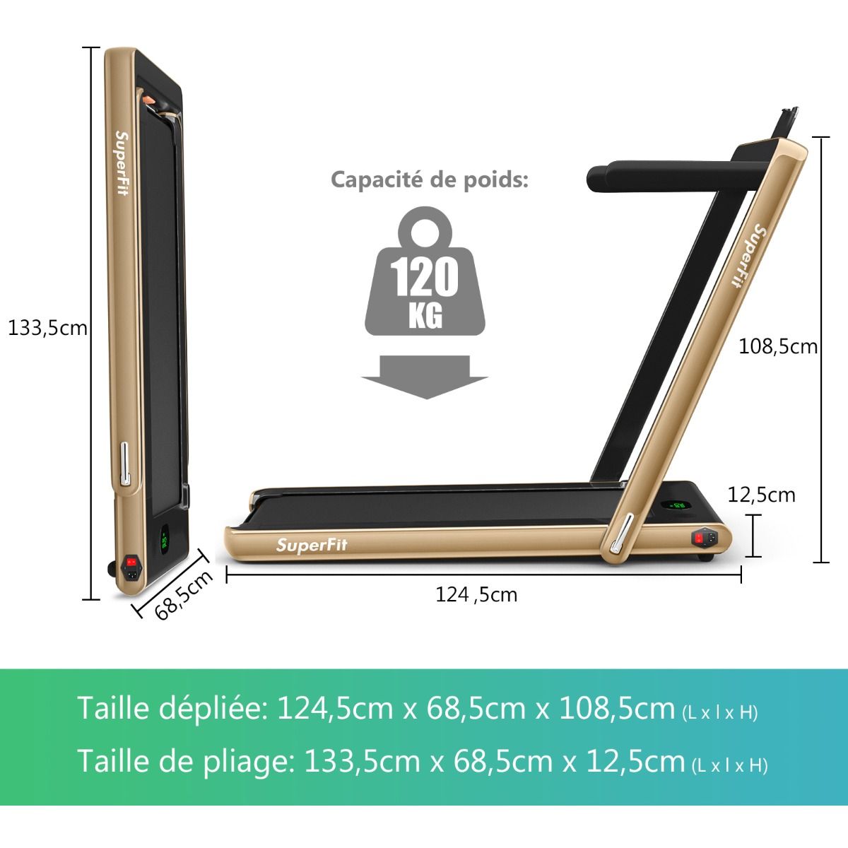 No need to run outdoors in the heat or go to the gym. This folding treadmill is the perfect choice. Sturdy and stable, it features a robust frame and a durable five-layer running belt, ensuring superior performance. The foldable handrails offer two different modes to meet various needs. Whether you're a professional athlete or a beginner, you can find a mode and intensity that suits you. Furthermore, the multi-functional LED display accurately shows your running time, speed, and calorie consumption, allowing you to comprehensively monitor your fitness and conduct targeted training. With this folding treadmill, you can take action now and start a healthier life. Product Features: 2-in-1 folding multi-functional treadmill offering two modes to meet different training needs. With the handrails folded, it can be used as a treadmill. It can be placed under a table, with speeds from 1 to 4 km/h, allowing you to enjoy a more relaxed running experience. With the handrails raised, the running speed ranges from 1 to 12 km/h, perfect for workouts. Quiet Motor and Stable Structure: The treadmill is equipped with a powerful yet quiet 0.75 horsepower motor with an inductor filter. It operates relatively quietly and won't disturb neighbors, making it ideal for office or home use. In addition, the sturdy and durable iron frame provides excellent stability. The multi-layered running belt effectively absorbs impact, ensuring a more comfortable running experience. The high-density textured running belt also provides stronger grip and safety. Bluetooth speaker and LED display: Time, speed, distance traveled, and even calorie consumption are clearly displayed on the LED screen. You can track your progress and fitness status in real time. Running is no longer boring: The treadmill is equipped with Bluetooth technology, allowing you to play your favorite music. Phone holder and easy installation: The phone holder securely and stably holds your phone. This way, you can watch movies or chat with friends while exercising. Furthermore, 95% of the components are pre-installed, making installation simple and quick. Using the remote control, you can quickly adjust the speed and stop the treadmill. Ultra-portable design, easy to store. This treadmill has a compact and foldable design, with folded dimensions of only 132 cm x 70 cm x 12.5 cm (L x W x H), easily stored under the bed or sofa, taking up minimal space. In addition, built-in wheels make moving it even easier and more convenient. Powerful Features: Compact size and foldable design for easy storage; Stable and durable steel frame ensures a long product lifespan; Bluetooth functionality makes running more fun and motivating; Two different modes to meet various situations and needs; Equipped with wheels for easy movement and transport; LED display shows your fitness level and progress accurately in real time; Durable and non-slip running belt designed specifically for running and exercise. Specifications: Colors: Green, White, Black, Red, Gold, Black/Silver, Blue; Material: ABS + Iron; Net Weight: 34.66 kg; Maximum Load Capacity: 120 kg; Unfolded Dimensions: 124.5 x 68.5 x 108.5 cm (L x W x H); Folded Dimensions: 133.5 x 68.5 x 12.5 cm (L x W x H); Walking Speed: 1.0-4.0 km/h; Running Speed: 1.0-12.0 km/h; Peak Motor Power: 0.75 hp; Noise Level: Below 60 dB Running area dimensions: 40 x 100 cm (L x W) Package includes: 1 x 2-in-1 treadmill, 1 x remote control, 1 x phone holder, 1 x instruction manual, 1 x power cord, 1 x safety key