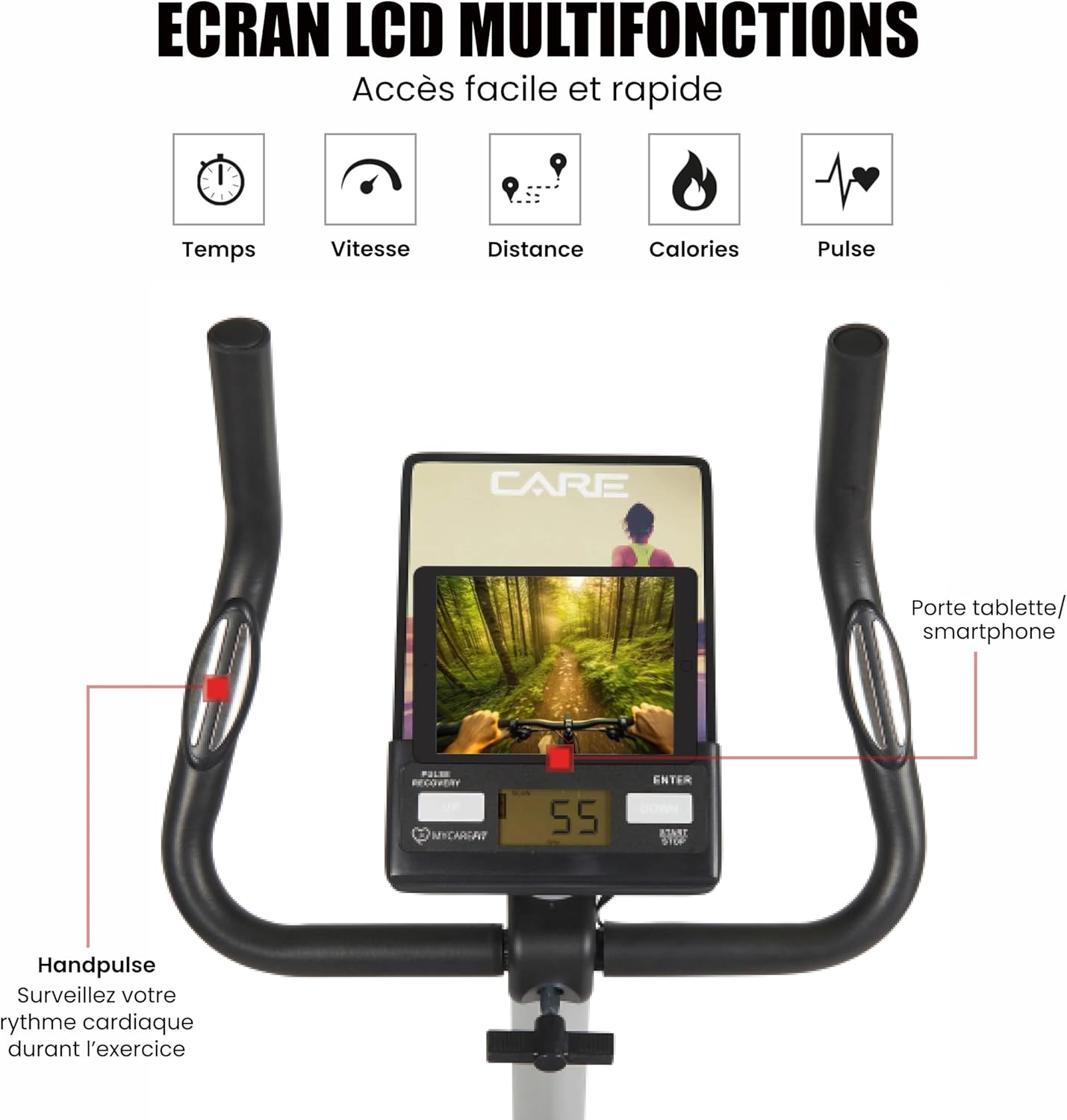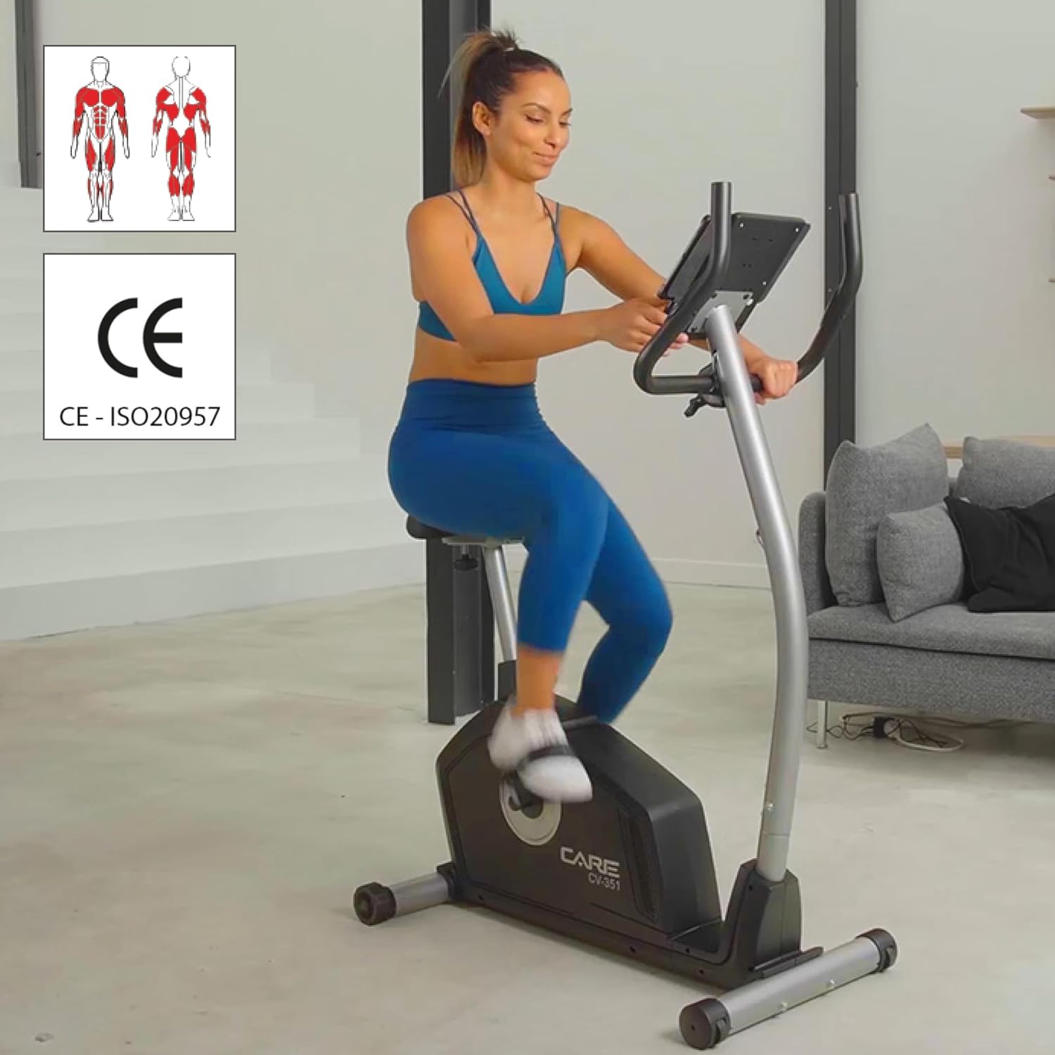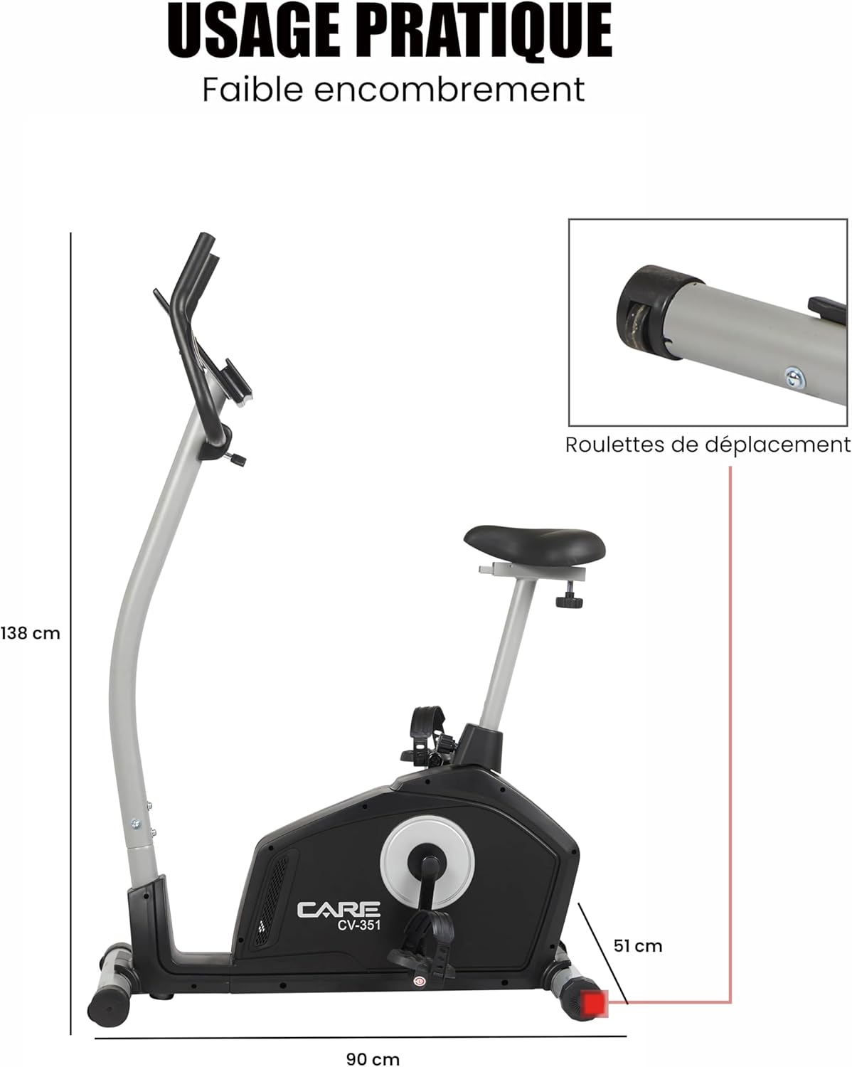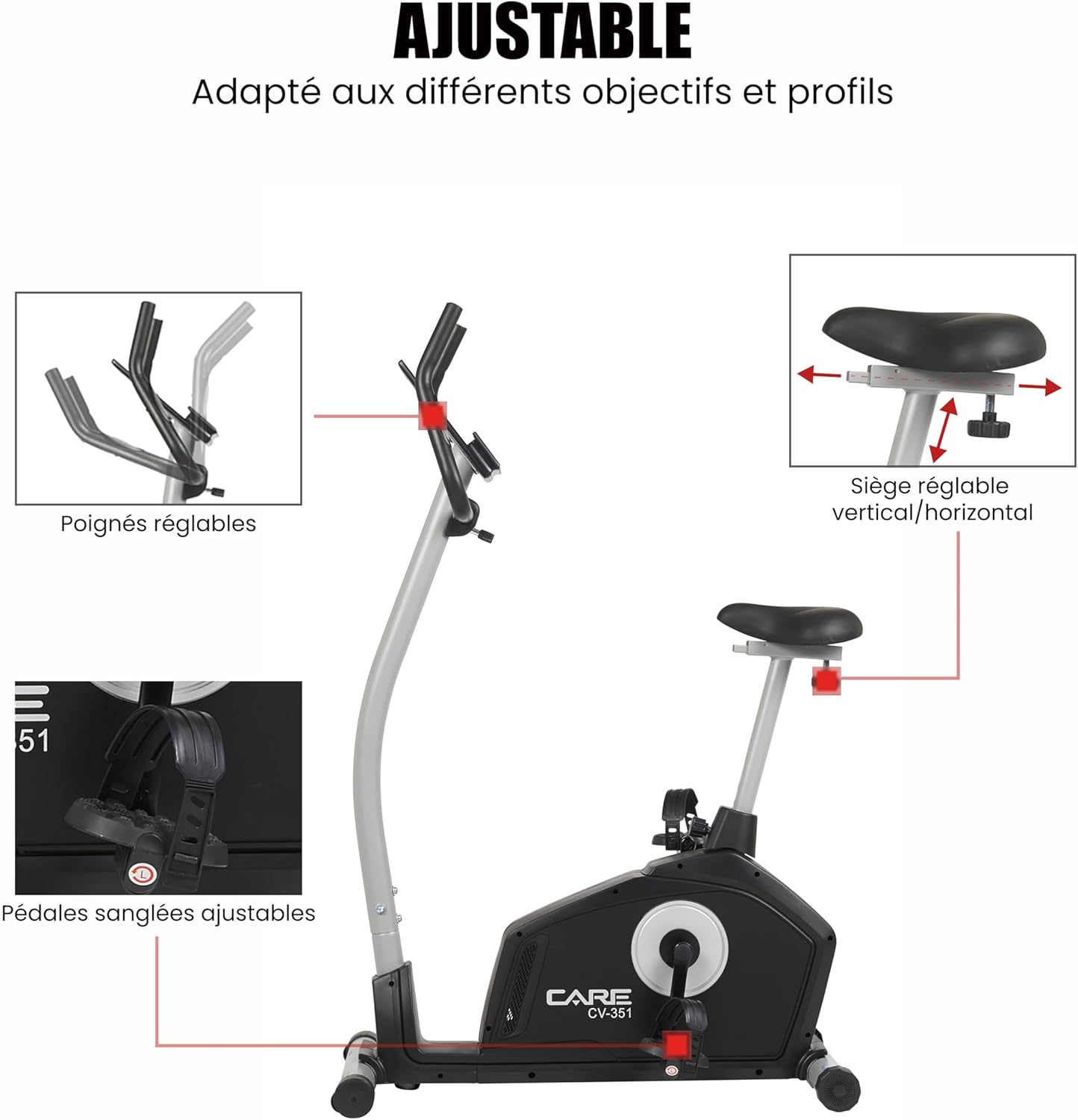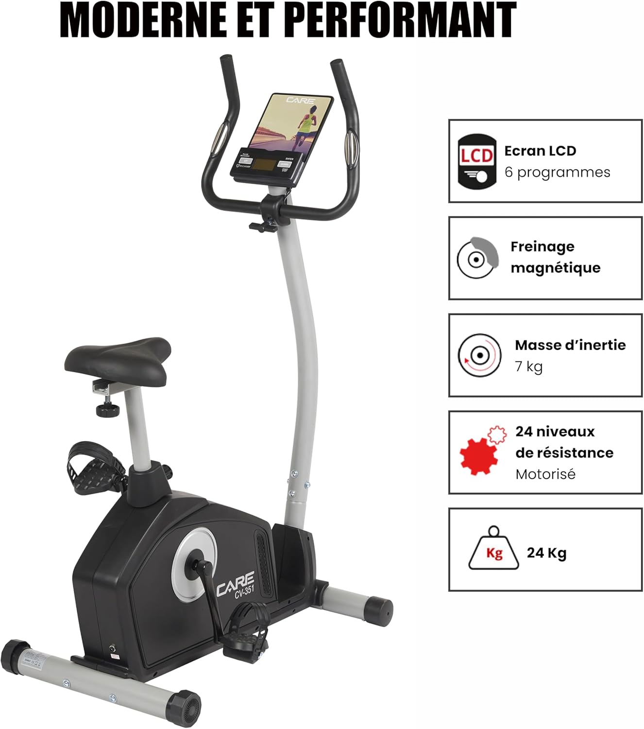 Spinning Bike: The CV-351 Electric Indoor Spinning Bike helps you improve your fitness: shaping, burning fat, improving cardiovascular health, and strengthening muscles for a comprehensive workout. The CV-351 is a sturdy and stable home fitness machine that is efficient and comfortable. Muscle Training: The CV-351 exercise bike features a 16-level magnetic resistance system. To monitor your performance, the control panel displays: time, distance, speed, calories, RPM, power, temperature, heart rate measured by touch sensors integrated into the fixed handlebars, and recovery status. Smart Home Coach: This fitness equipment features an LCD screen with 7 built-in programs: 6 preset programs, 1 manual program (French version not guaranteed), 4 custom programs, 5 heart rate (HRC) settings, 1 constant power display, and 1 calorie counter. It is compatible with the MY CARE FIT app, allowing you to monitor your performance through the "Street View" simulation function and simulate workout scenarios anywhere in the world, from the streets of New York to Paris. Work out at home: This exercise bike features triathlon handlebars and a comfortable, height/depth adjustable saddle, allowing you to find the most ergonomic riding posture to suit your body type. Weighted pedals and straps ensure proper foot placement and stability for more efficient workouts. Additionally, this exercise bike includes transport wheels and a tablet/smartphone holder. Maximum user height: 190 cm. The CV-351 exercise bike is a high-performance bike ideal for high-intensity workouts and detailed fitness tracking. This fully-featured bike features a 16-level magnetic resistance system, 7 training programs, and a Handpulse touch-sensitive heart rate sensor. Its ergonomic and comfortable design provides a smooth riding experience and enhances workout results. The bike's control panel has 7 built-in functions to track all your workout parameters, including estimated calorie consumption, cadence (revolutions per minute), speed, distance, and heart rate. You can also use the Kinomap app to travel the world, running or cycling across different continents. The CV 351 features a low-slung frame, allowing for easy leg movement during exercise. Its preset and customizable workout programs let you enrich your training and optimize your physical performance. A 10kg flywheel ensures extremely smooth pedaling.