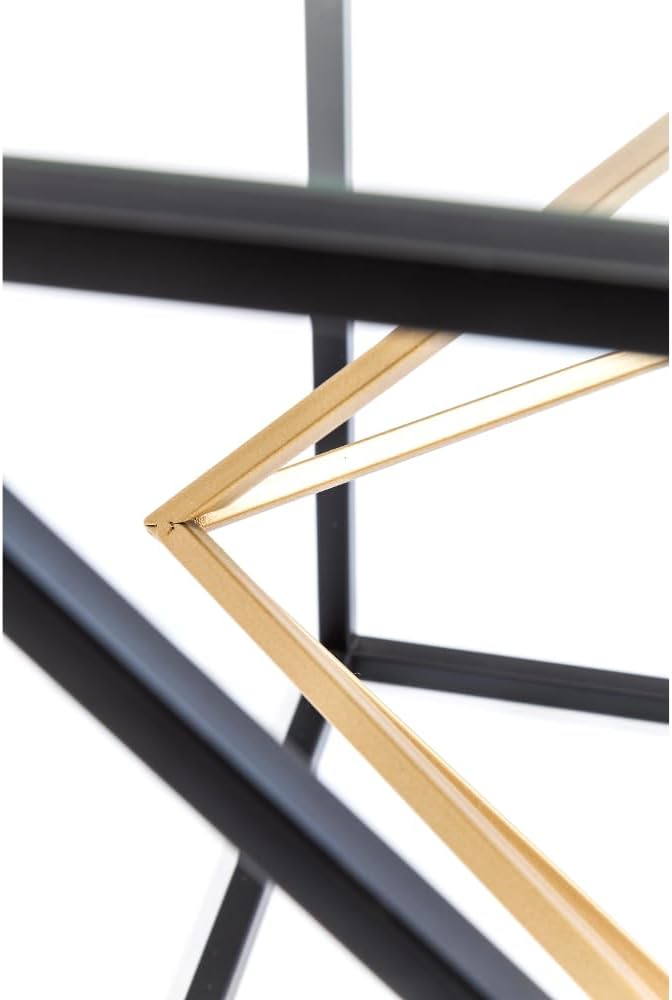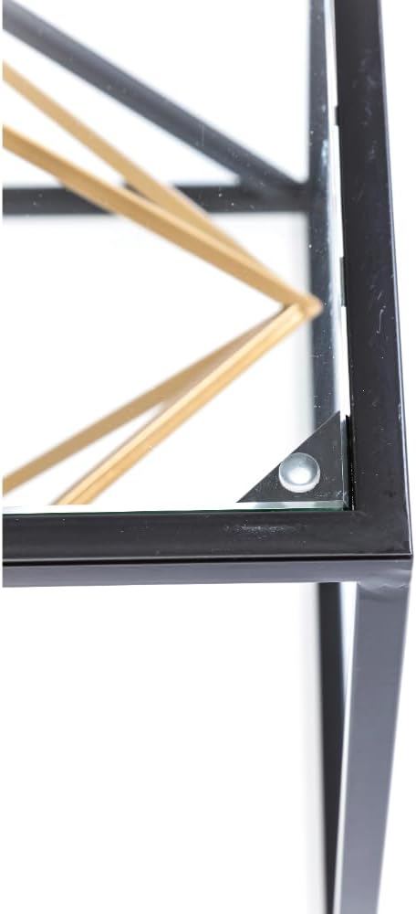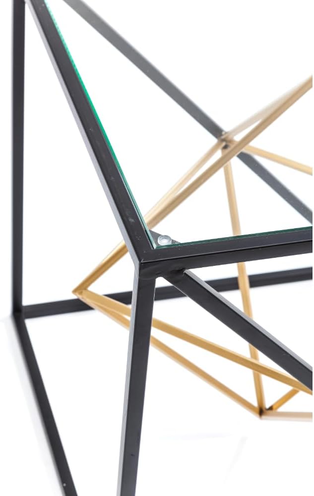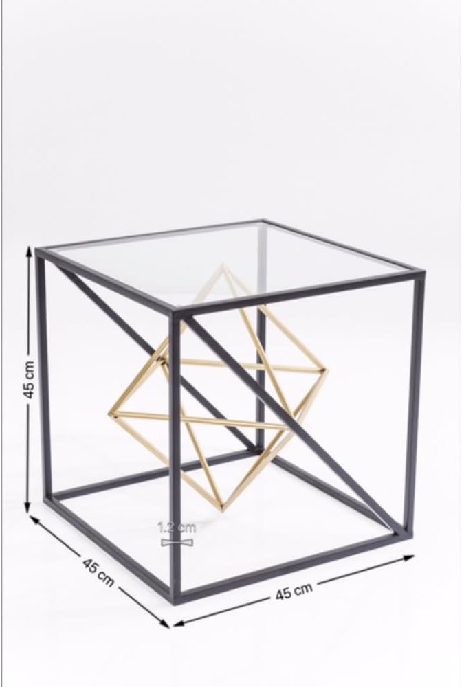 Modern Design: Square side table, made of glass and steel with a black frame. Eye-catching: A hanging gold cube that combines artistry and practicality. Style Statement: Perfect for a sofa or bedside table. Easy to Care: The glass tabletop is ideal for storing perfumes and beauty products. Versatile: Adds beauty to any room. Product Description: This lightweight, stylish, and highly practical side table is an ideal storage solution for apartments. Its cube shape and glass tabletop are not only aesthetically pleasing but also serve as a bedside table or a side table next to a reading chair, convenient for placing drinks and snacks for guests. Red wine stains? No problem, the glass tabletop is easy to clean. Safety Warning: Handle with care, avoid placing heavy objects on the glass tabletop, and keep away from children and pets.