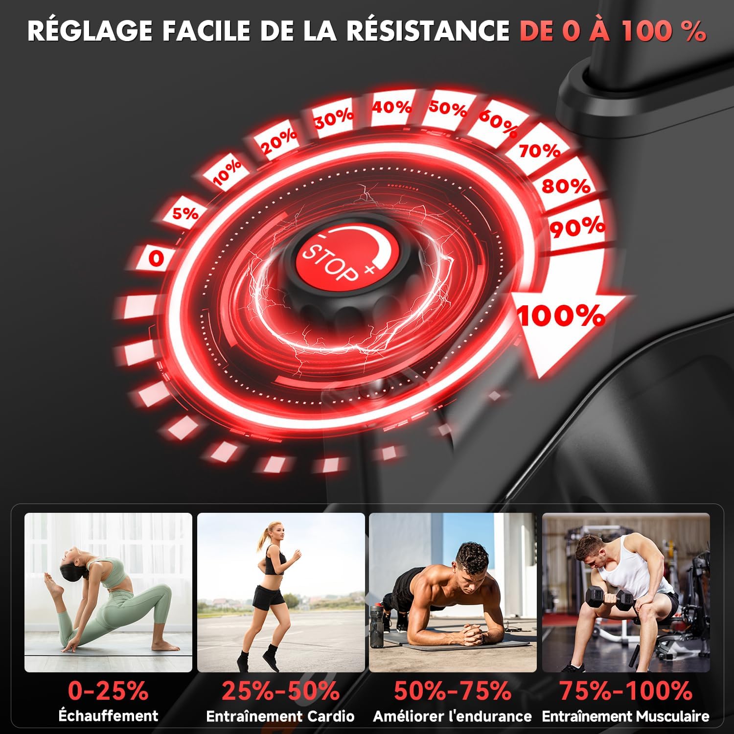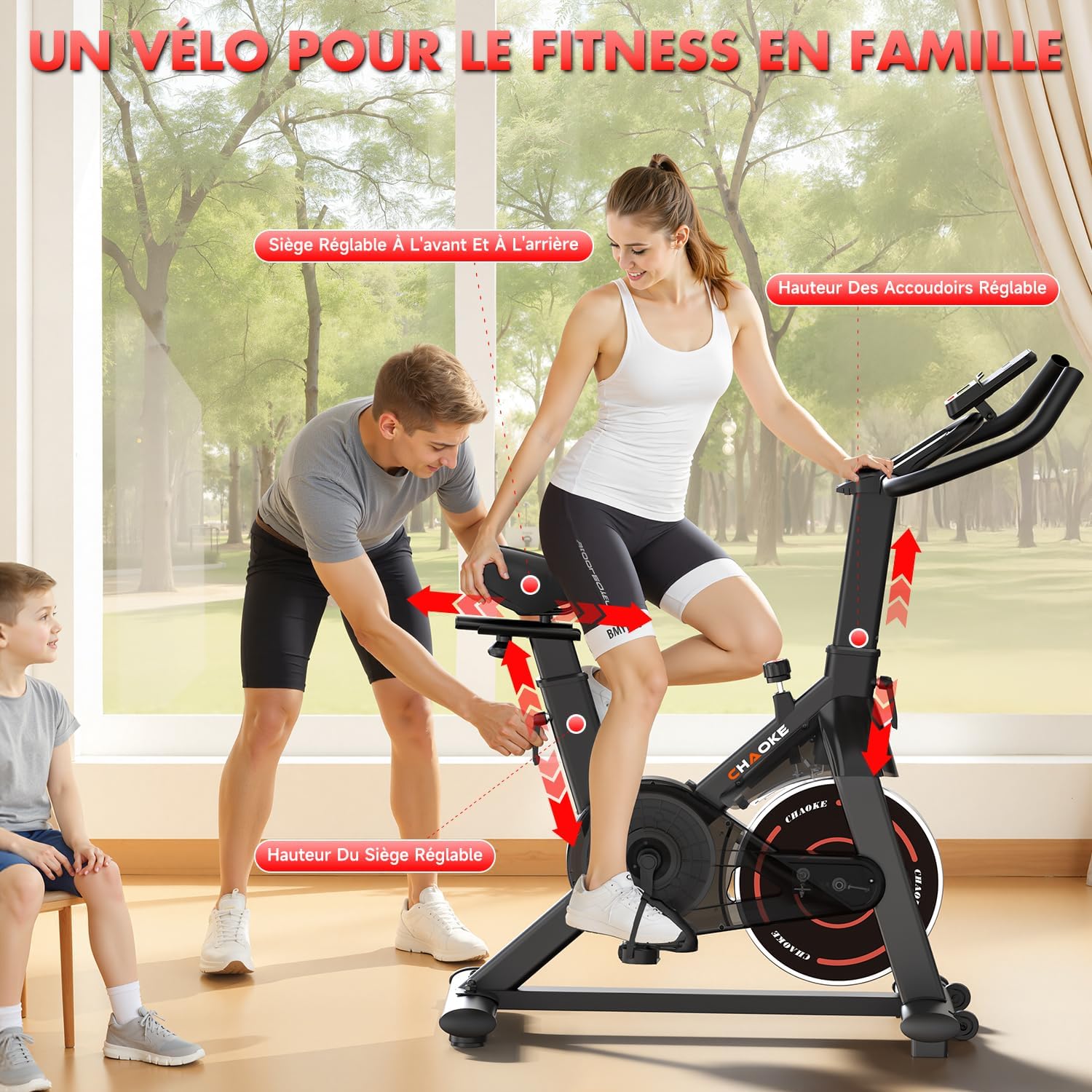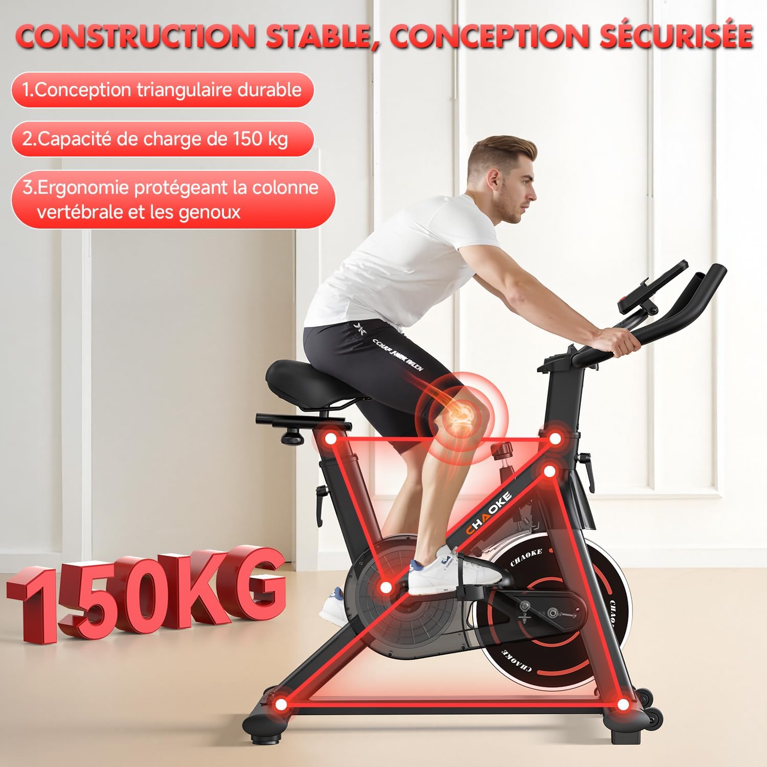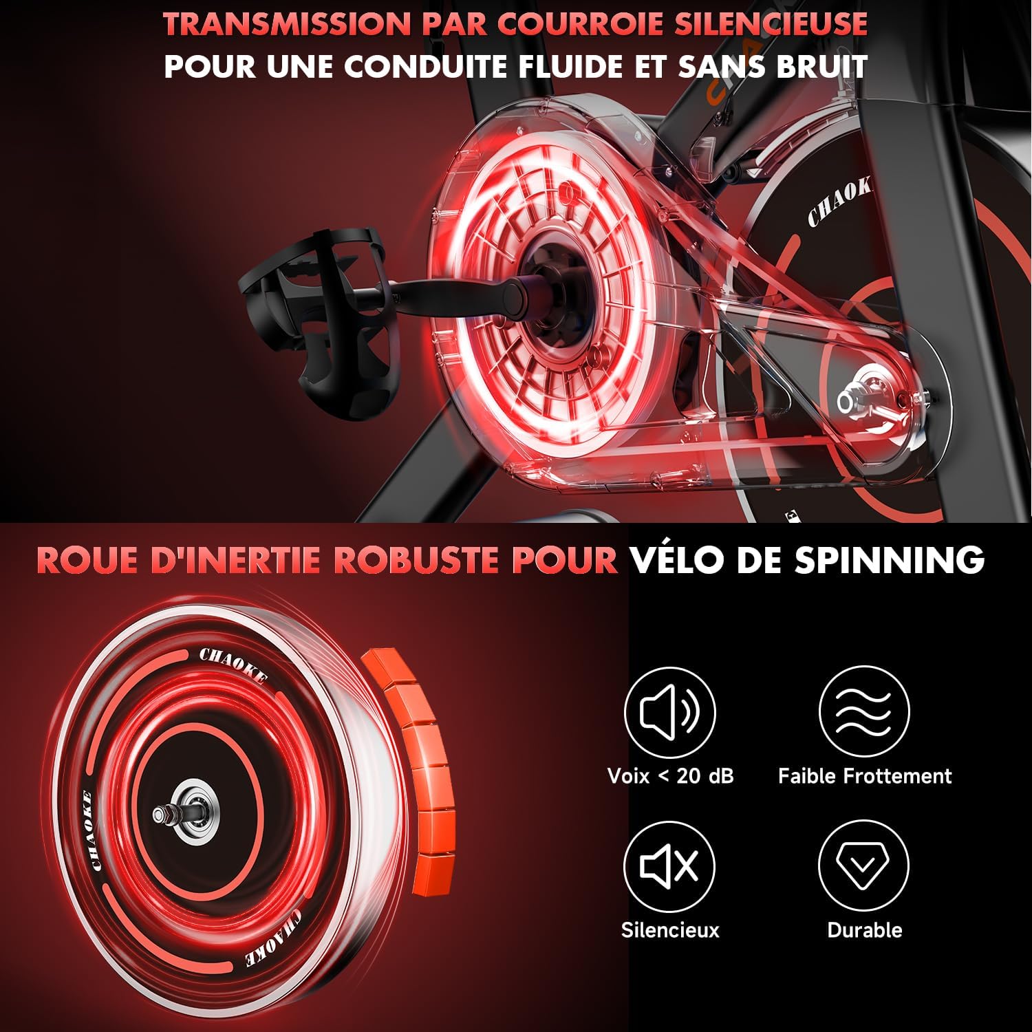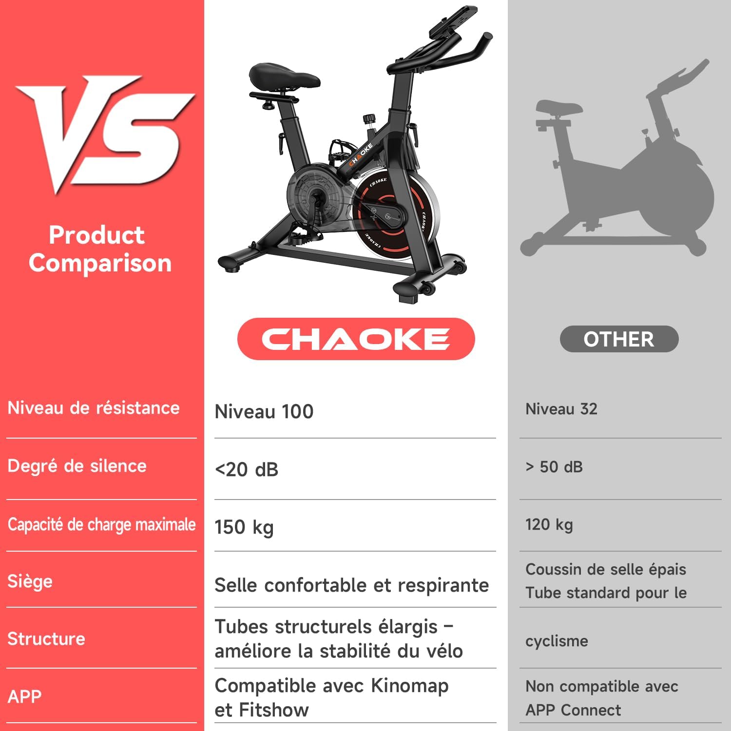 CHAOKE: CHAOKE is a leading global brand in the smart exercise bike industry. We are committed to providing high-quality products and reliable services for individuals and fitness professionals. With innovative design and advanced smart technology, CHAOKE allows you to train efficiently at home without leaving your house. Recognized by athletes and coaches worldwide, CHAOKE has become a significant player in the smart fitness field. Technical and Structural Advantages: CHAOKE exercise bikes feature a reinforced triangular frame and H-shaped base design, ensuring superior stability even during high-intensity training. Its 3mm thick steel frame, forged under 1200 tons of pressure, boasts unparalleled robustness. The ergonomic overall design effectively protects your knees and ankles, ensuring comfort during every workout. ECD RD Assessment and Comprehensive Fitness Training: A high-definition LCD screen displays important workout data in real time: time, speed, heart rate, distance, and calories burned. Easily track your training performance and adjust your training plan. The built-in tablet or smartphone holder allows you to stay connected or enjoy entertainment during your workout. From visual to automated applications, the CHAOKE exercise bike features a new generation of magnetic resistance system, combined with dual magnets and friction plate brakes, delivering an ultra-smooth and quiet pedaling experience no noise, no jerking. With a noise level of only 5 decibels (most models are 20 decibels), you can train anytime, anywhere without disturbing those around you. Resistance range 0% to 100%: This professional exercise bike offers a continuously adjustable resistance range from 0% to 100%. With its classic braking system, you can achieve precise, progressive intensity adjustments. Resistance adjustment is easy and convenient, suitable for beginners and experienced users alike. Professional performance: This bike features a new, robust flywheel, ensuring a stable structure and extremely smooth pedaling. Suitable for users 140 to 190 cm tall, with a maximum weight capacity of 150 kg (330 lbs). It features a professional nut-type pedal adjustment system, a convenient water bottle cage, and a height-adjustable locking button. The adjustable, soft, and breathable saddle ensures optimal comfort during your workout. Chaoke is committed to providing customers with high-quality products and comprehensive services. We offer a five-year warranty.