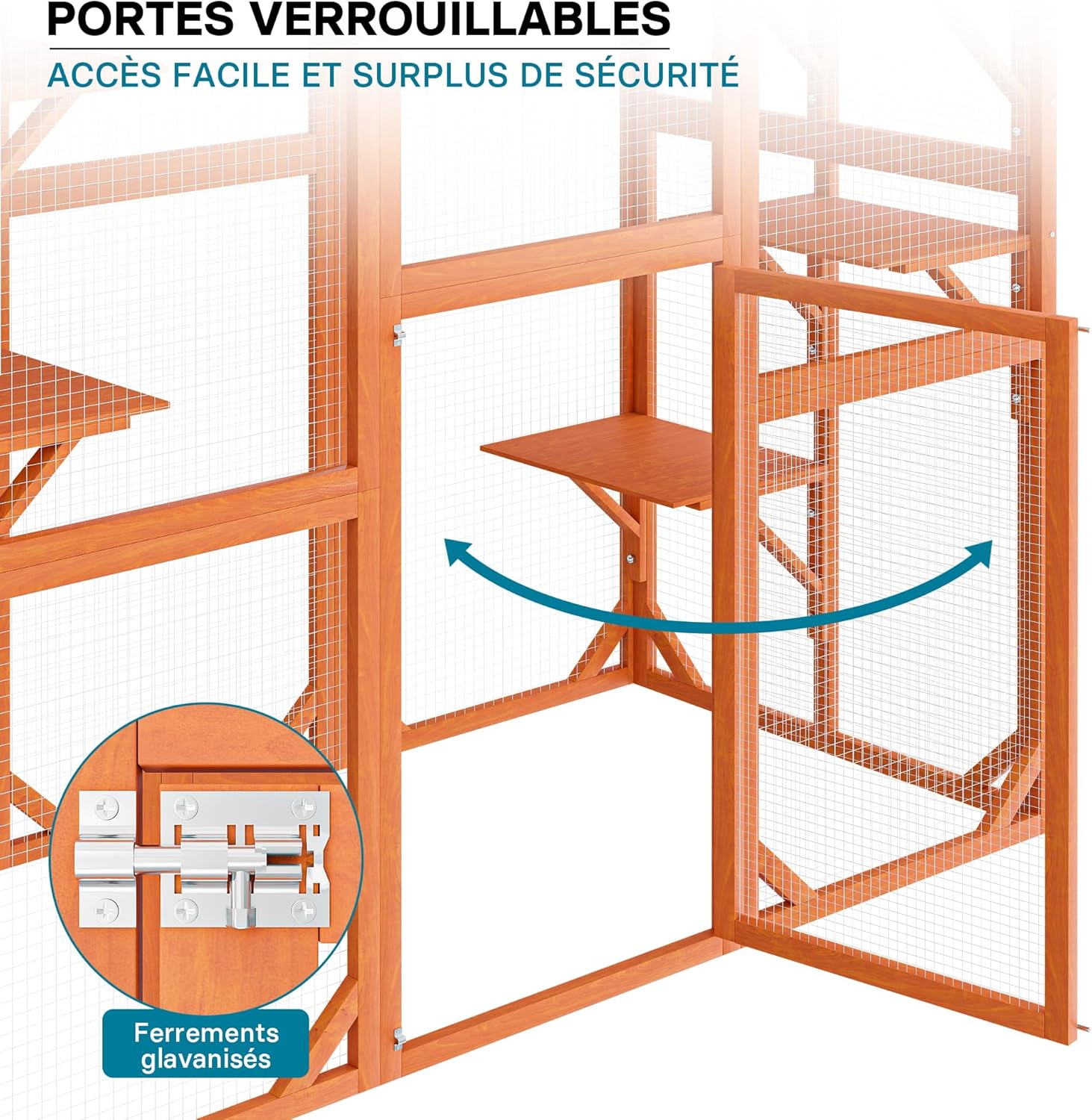 [Outdoor Cat House] This outdoor cat house from Wiltec provides your cat with a safe and comfortable outdoor space where they can enjoy outdoor activities while preventing escape. Designed for gardens, backyards, or patios, its practical dimensions of 168 x 82 x 166.5 cm allow it to blend seamlessly into any outdoor environment. [Durable and Sturdy] Constructed from high-quality cedar wood and coated with a waterproof varnish, this outdoor cat house withstands various weather conditions. Galvanized wire mesh enhances security, while an asphalt roof protects your cat from rain, snow, and sun. [Six Comfortable Resting Areas] The cat house features six resting areas at different heights, allowing your cat to safely relax and observe its surroundings. These areas provide optimal comfort and satisfy their natural curiosity. [Easy Assembly] Thanks to pre-drilled mounting holes and clear instructions, this cat house can be quickly and easily assembled. This simple assembly system is easy even for inexperienced users, allowing you to quickly create a safe and comfortable space for your pet. [Lockable Door, Enhanced Security] For optimal security, this cattery features an externally lockable door. This allows you to easily monitor your cats while ensuring they have a secure, enclosed space, giving you peace of mind to enjoy your time outdoors in the garden or on your patio without worrying about them escaping. The sturdy metal mesh, with 12mm mesh openings and 0.75mm thick wire, effectively prevents predators from entering and keeps curious cats away. It also ensures proper air circulation. Six comfortable rest areas allow your pets to enjoy their favorite relaxation time and observe their surroundings. The externally lockable door provides easy access to the cattery while enhancing security. Cats cannot open this door on their own. The waterproof and windproof asphalt-coated roof protects your cats from wind, rain, snow, and strong sunlight. Features include: sturdy galvanized steel wire mesh, six rest areas, an externally lockable door, and an asphalt-coated roof.