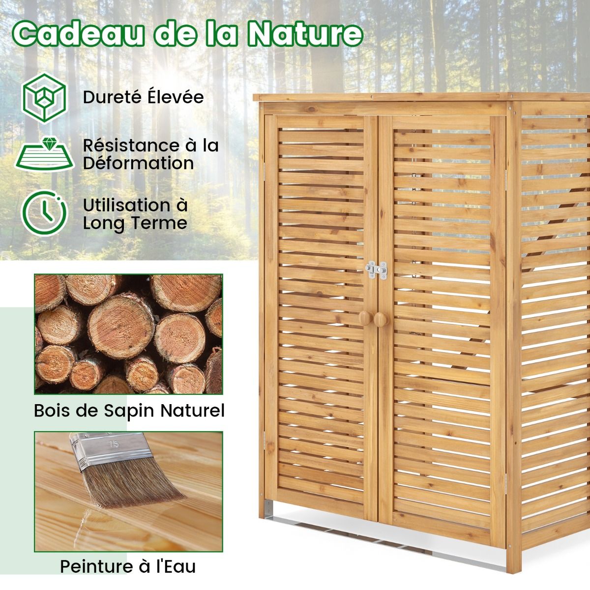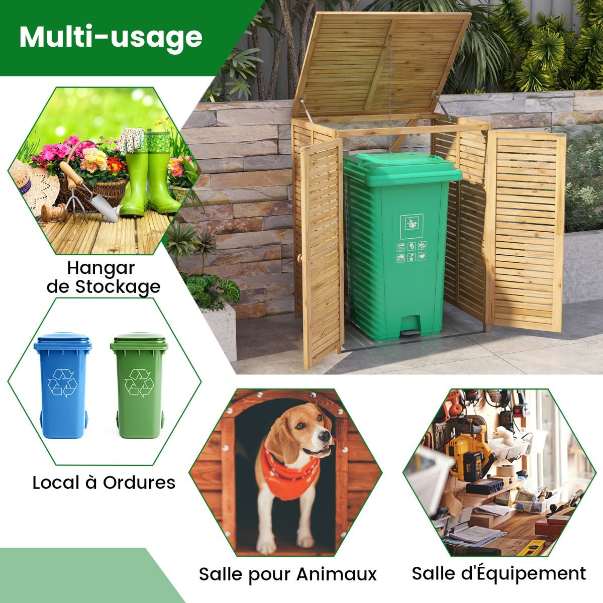 This trash shed features a front door and a flip-up lid for easy emptying and retrieval of trash. A clever metal chain connects the shed lid to the trash can lid, automatically opening when someone enters. A latch ensures security, while ventilation effectively prevents odors. Constructed from cedar wood and coated with water-based paint, the shed is durable and suitable for outdoor use. Its 120-liter capacity is sufficient for most outdoor trash cans. Product Features: Sturdy and durable, innovative lid design for easy use. The lid is equipped with two pneumatic levers for easy and quick opening and emptying. A metal connection between the trash can lid and the shed lid prevents you from opening both lids simultaneously and getting your hands dirty. Double-door ventilation design. This outdoor trash shed features a lockable front door for easy access and provides privacy for storing unsightly items such as tools. Furthermore, the slatted design promotes air circulation and effectively prevents odors. Cedar wood construction: This wooden storage shed is made from high-quality cedar wood, which is resistant to warping and durable. In addition, the wooden surface is coated with water-based paint, making it easy to maintain and long-lasting. Painting and versatility: The natural-colored frame can be painted in various colors to match your preferences or the style of your outdoor space. Furthermore, this multi-functional outdoor storage shed can also be used as a tool shed, privacy fence, or pet house as needed. Recommended bin size: This 120-liter large-capacity storage shed can accommodate bins measuring 78 x 65 x 75-106 cm (L x W x H). Please measure your bin dimensions before purchasing. Durable and robust, features: Made of natural cedar wood for long-term use; water-based paint for easy maintenance; hinged lid with a high-quality smooth gas spring; metal chain securing the inner and outer lids together for linked opening; lockable door with metal latch for secure storage; ventilation design reduces odors; easy-open door with convenient handle; meets various needs such as storage, trash, or equipment concealment; can be painted to match your personal style or different occasions. Specifications: Color: Natural wood; Material: Cedar wood; Overall dimensions: 86 x 70 x 114 cm (L x W x H); Single door dimensions: 35 x 110 cm (L x W x H); Total capacity: 120 liters; Net weight: 13.5 kg. Included: 1 wooden trash can cover; 1 user manual.