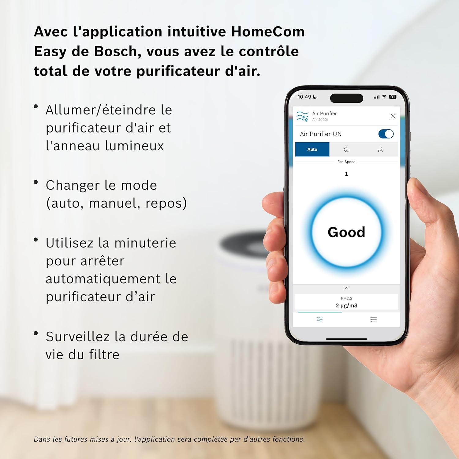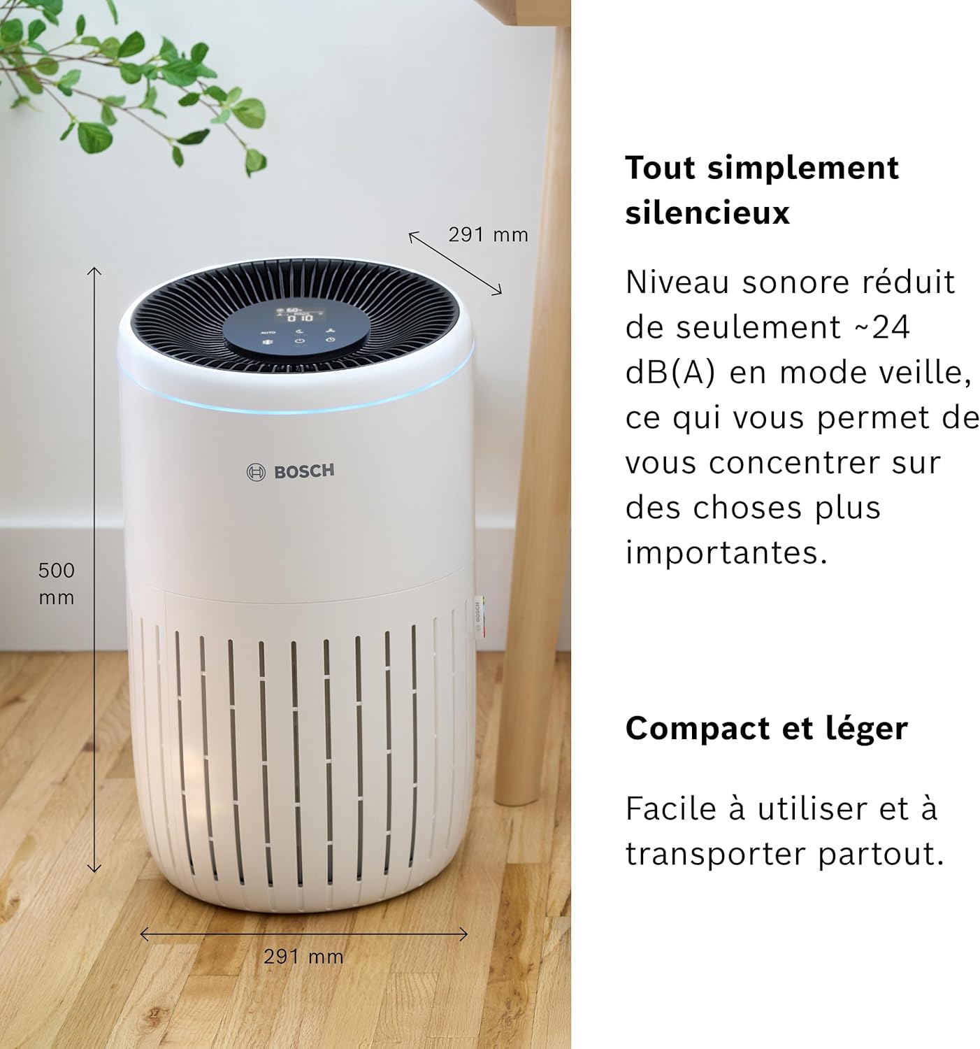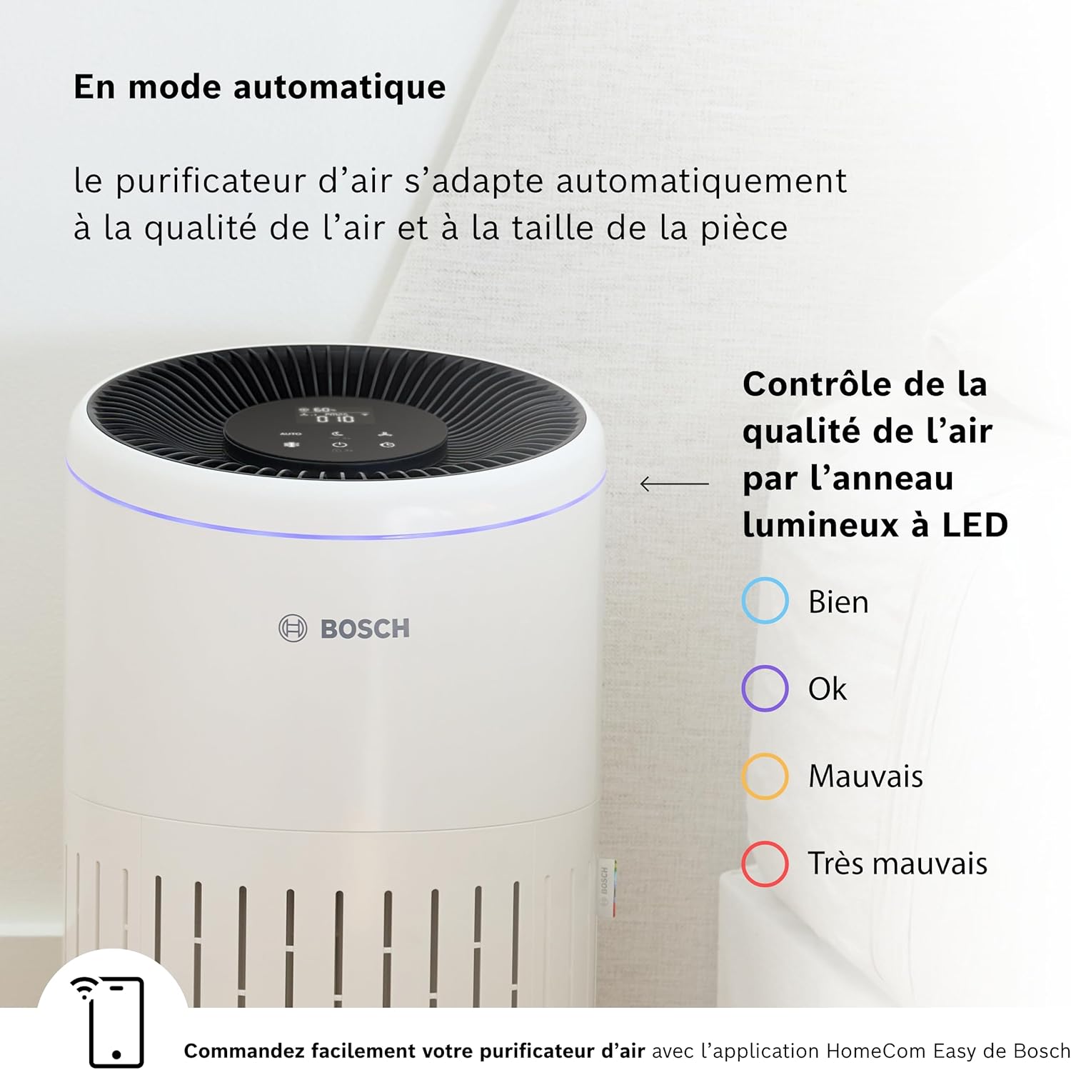 Enhance your home health: The Bosch Air 4000i is an easy-to-use air purifier with a 3-in-1 filter and LED display, capable of purifying the air in rooms up to 62.5 square meters. Easy to operate: Easily control the air purifier using your smartphone, intuitive display, or voice control within the smart home ecosystem. You can adjust settings, set timers, or monitor air quality. Clean air at your fingertips: Thanks to its pre-filter, HEPA high-efficiency filter layer, and activated carbon filter, the Air 4000i effectively removes airborne pollutants such as pollen, dust, viruses, pet dander, and odors. Convenient, efficient, and powerful purification: In Auto mode, the Air 4000i automatically adjusts its purification performance based on air quality and room size. The Clean Air Delivery Rate (CADR) is 300 cubic meters per hour. Perfect sleep: Activate Silent Mode to reduce the air purifier's noise level to below 25 decibels (A) and turn off the indicator lights, allowing you and your family to enjoy a peaceful sleep. 1. Pure Air Mode 2. Auto Mode 3. Silent Mode 4. Manual Mode 13-in-1 Filter: 2. Pre-filter 3. HEPA High-Efficiency Filter Layer 4. Activated Carbon Filter Layer As Bosch Home Comfort, we are committed to creating the most comfortable home environment for you.