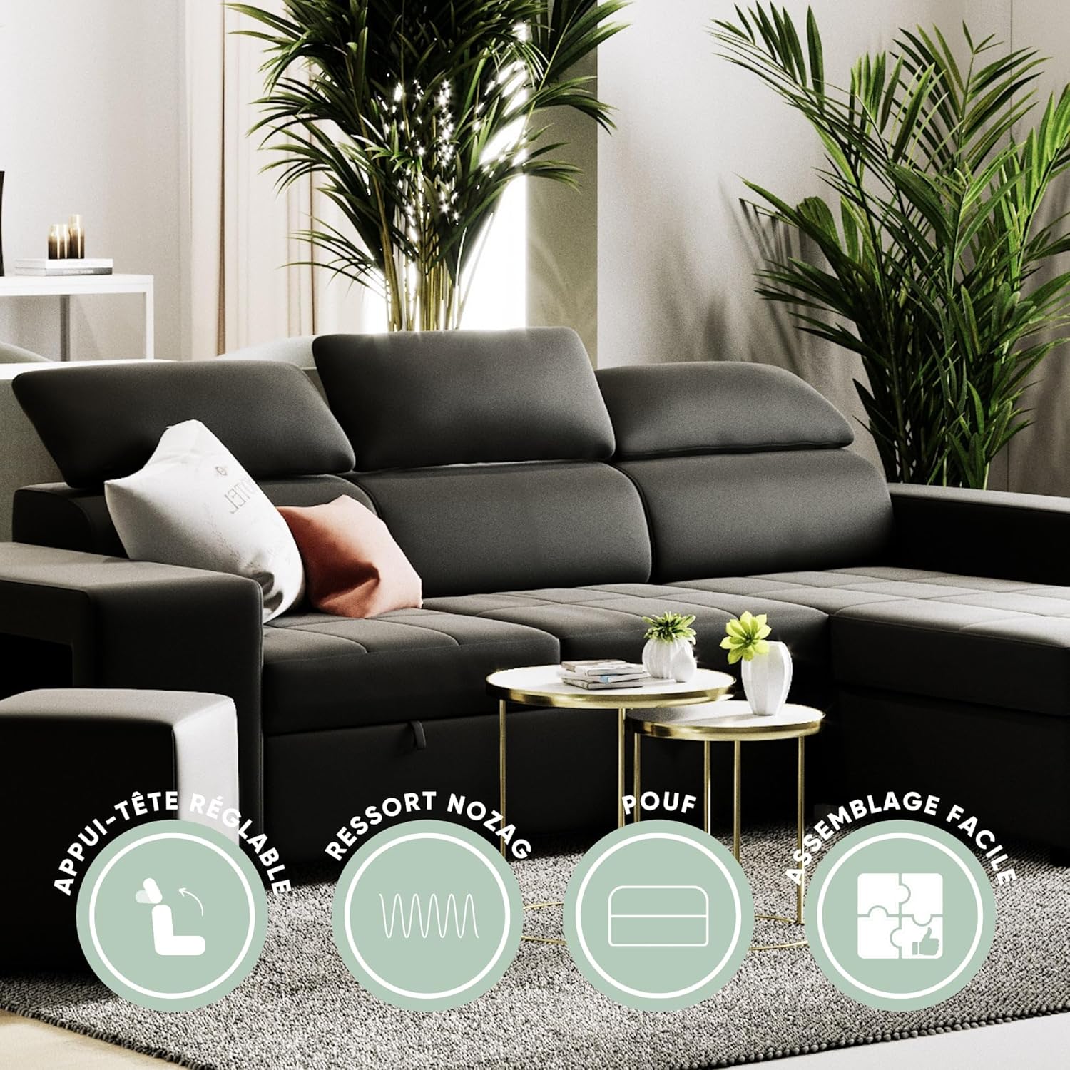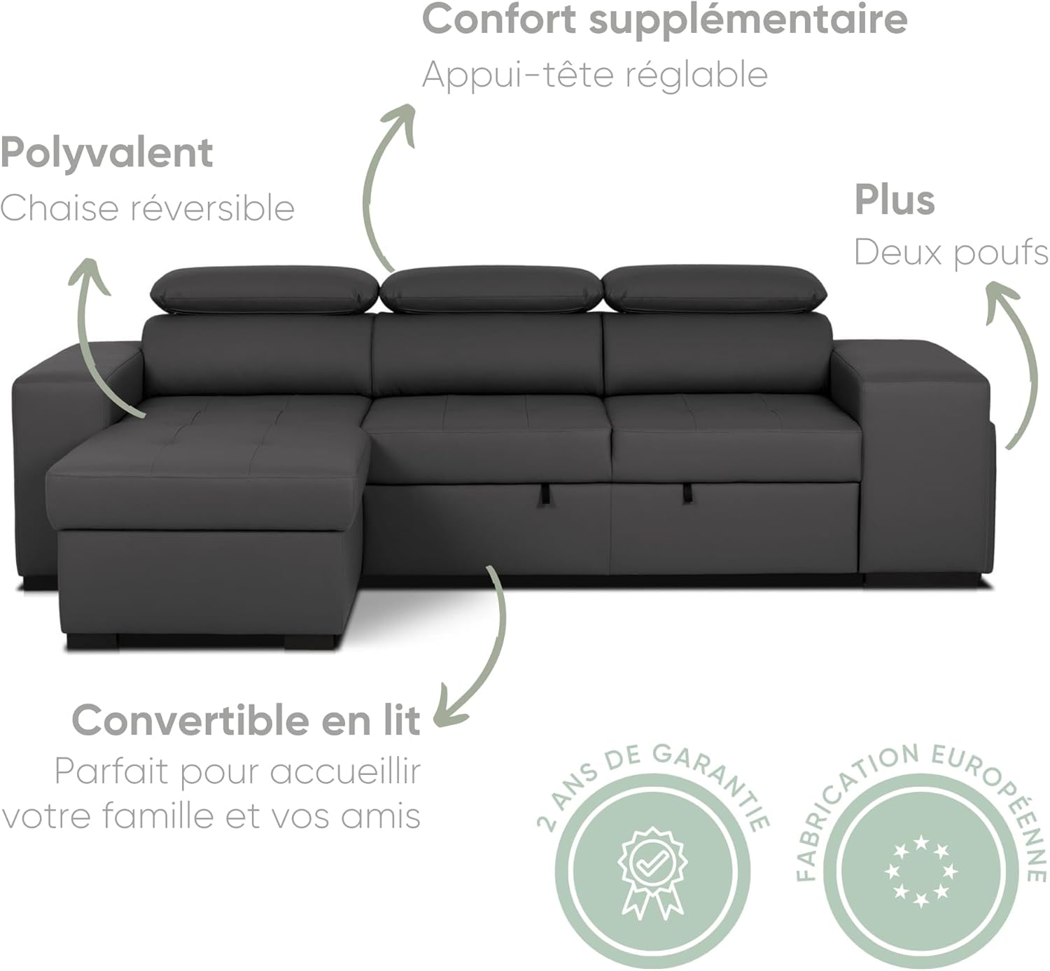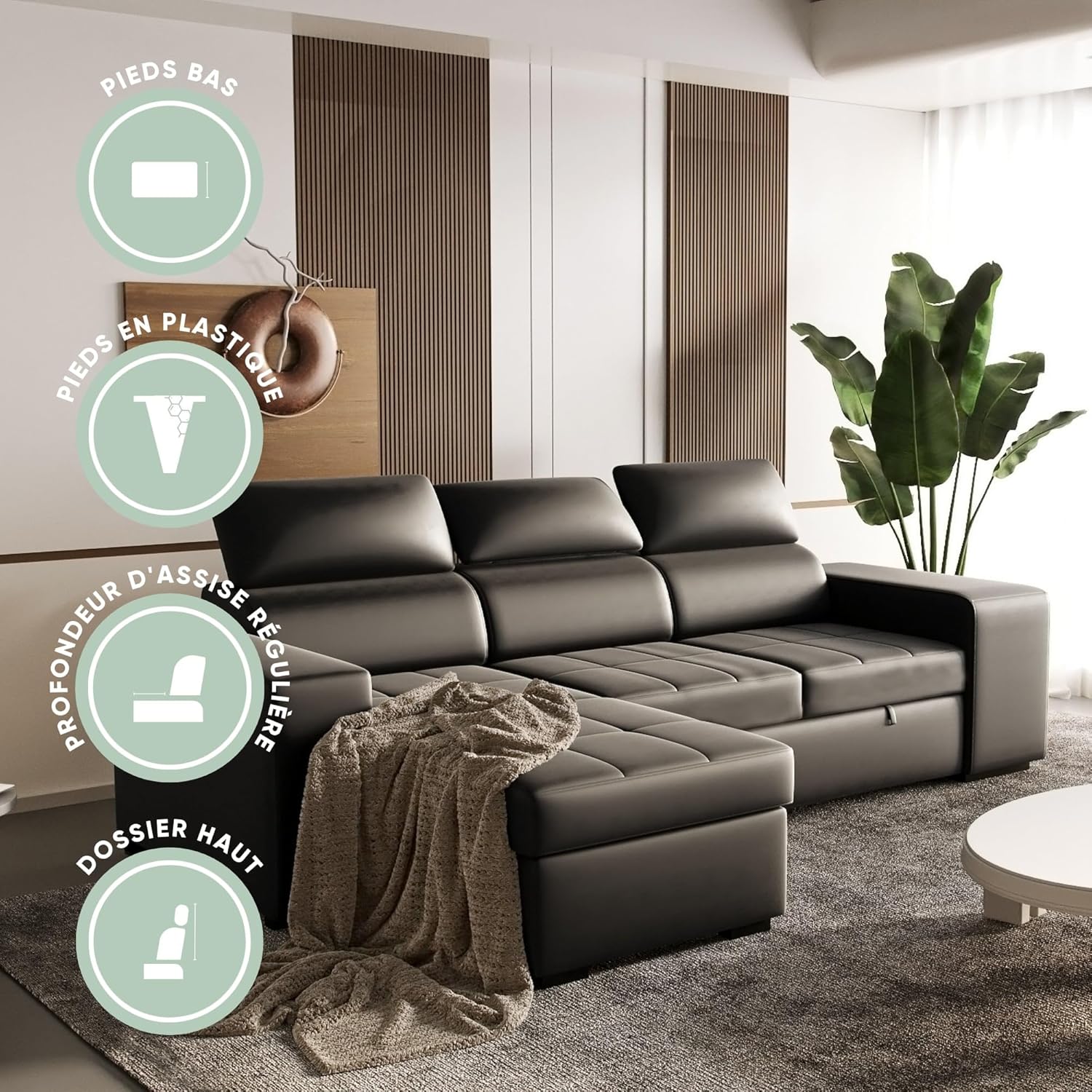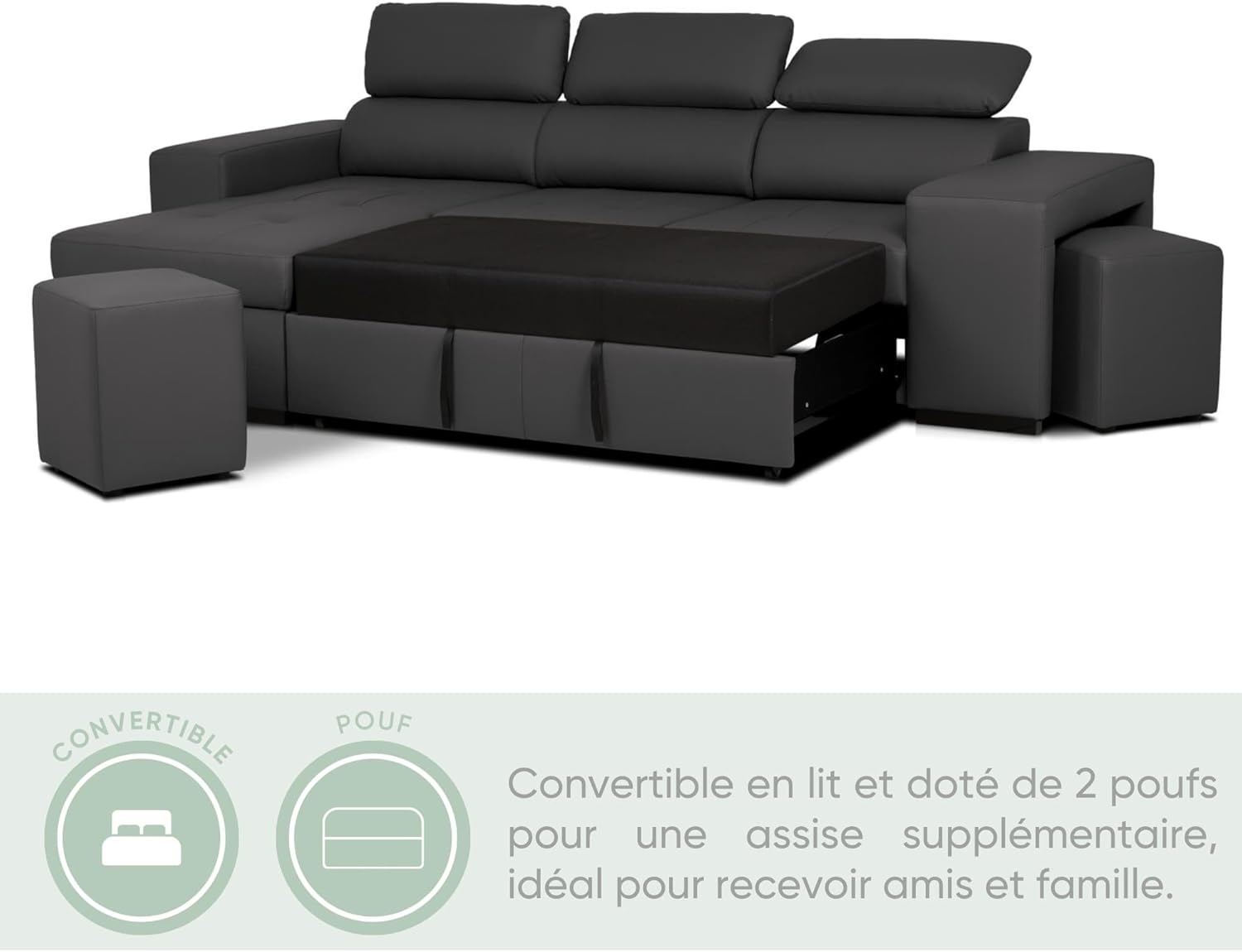 Spacious Multifunctional Sofa Bed: The John model perfectly blends comfort, style, and practicality in this four-seat corner sofa, suitable for everyday use and easy for entertaining guests. Flip-Up Chaise Longue with Storage: Can be placed on the left or right side to suit your space needs. Built-in hidden storage space for blankets, cushions, or textiles. Adjustable Headrests for Enhanced Comfort: The adjustable backrest allows you to adjust your posture, providing excellent neck support whether reading, watching TV, or relaxing. Includes Two Multifunctional Integrated Footstools: The footstools can be used as additional seating or as footrests. They can be easily stored under the sofa frame, cleverly utilizing space. Easy-Care Black Polyurethane Fabric: Durable and comfortable fabric designed for everyday use without sacrificing aesthetics. Black adds a touch of sophistication, blending perfectly with modern urban interior design. Delivery to Building Entrance (Optional Additional Service): The carrier will contact you to arrange a delivery date after your order is shipped. Assembly and installation are not included unless you have booked additional assembly and installation services. We offer a 2-year warranty for your peace of mind. Our cushions are currently shipping and will arrive soon. We are finalizing the details to ensure the product achieves the quality and comfort we want. The BUDWING John foldable corner sofa bed, 3/4 seat, chaise lounge, left/right corner, adjustable headrest, comes with 2 footstools, black, faux leather, suitable for living room d��cor. The John four-seater corner sofa bed is practical because of its foldable design (the chaise lounge can be placed on the left or right side) and can be easily transformed into a comfortable bed to ensure your guests get a good night's sleep. In addition, it comes with 2 extra footstools, providing 2 additional seats for entertaining more guests. Besides the 4 seats on the sofa, you can also use the 2 extra footstools to entertain your friends and visitors. When not in use, the footstools can be stored in the sofa itself, which is both aesthetically pleasing and space-saving. Product Features: Convertible to Bed: Yes; Sofa Width: 263 cm; Chaise Longue Width: 161 cm; Seat Depth: 91 cm; Sofa Height: 96 cm; Bed Dimensions: 198 x 127 cm; Chaise Longue Side (Front): Flip-up (left/right); Leg Material: Plastic; Fabric Material: 100% Polyurethane. Soft to the touch, easy to clean, and hydrolysis resistant. Materials: Pine, Plywood, Particleboard, oriented strand board (OSB). BUDWING is a brand under the Confort24 Group, your best choice for high-quality sofas and mattresses.