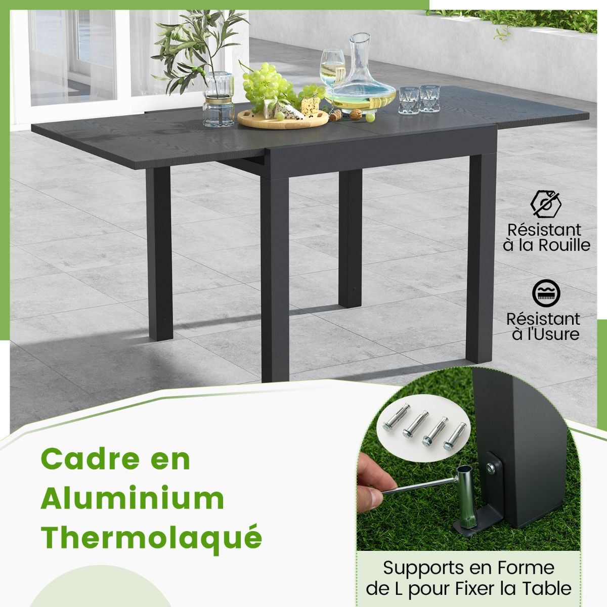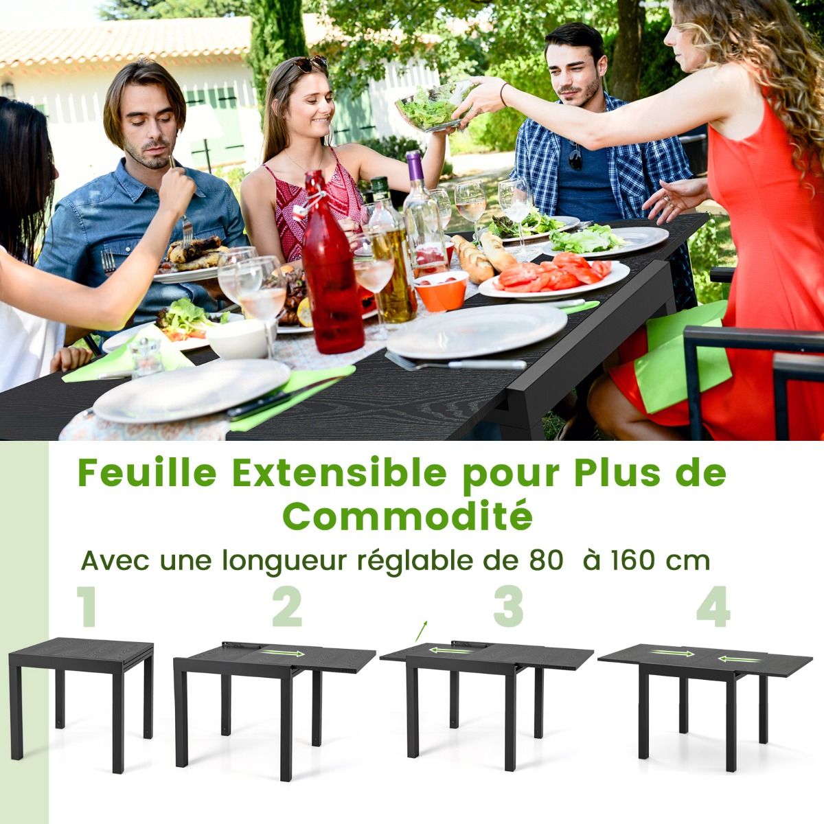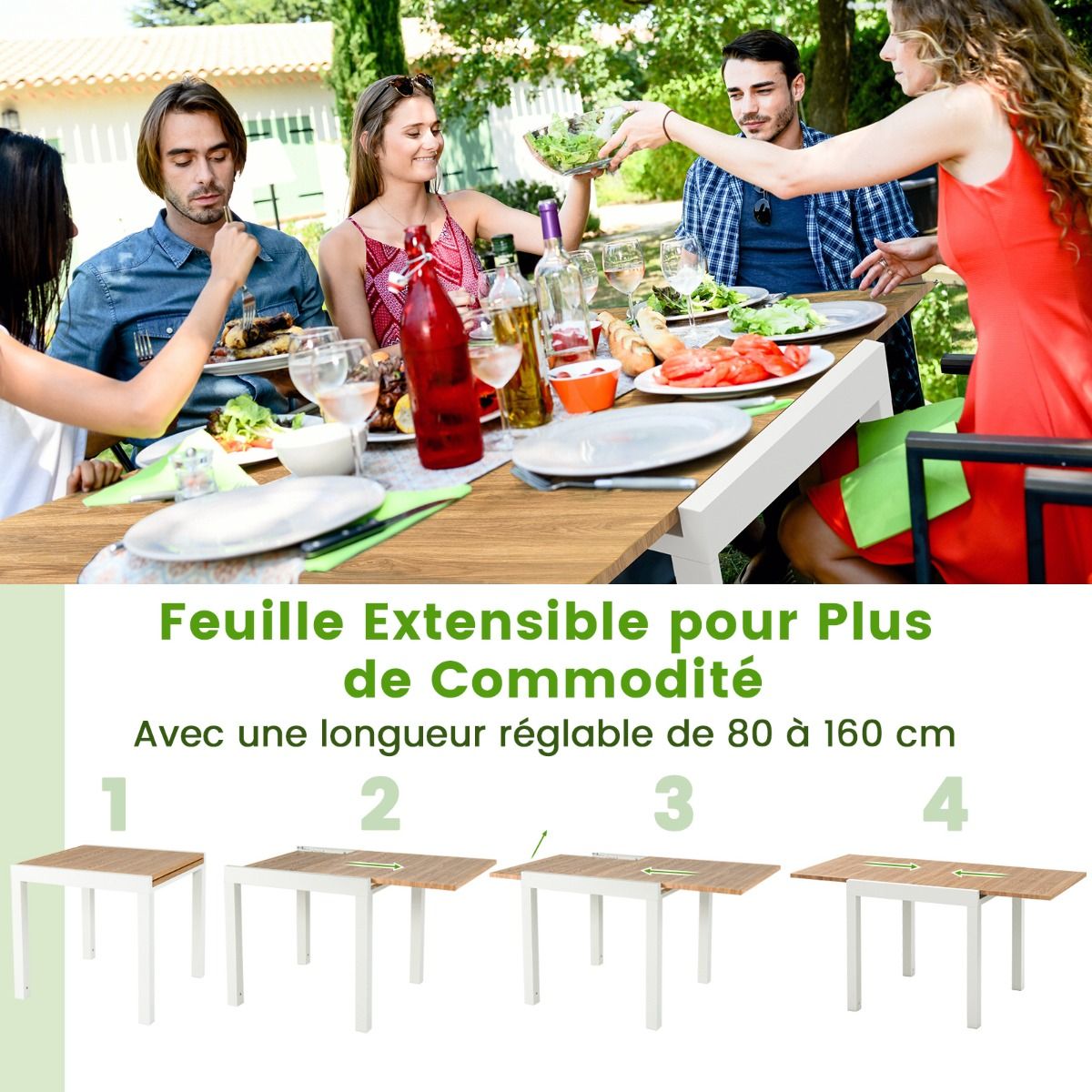 This multi-functional extendable patio dining table will elevate your outdoor dining experience! The cleverly designed table extends from 80cm to 160cm in length, easily accommodating 4 to 6 guests. Constructed from rust-resistant and durable aluminum, the table boasts a robust and stable structure for long-lasting use. Furthermore, the L-shaped support further enhances stability, firmly securing the table in place. This elegant and functional extendable table is ideal for both indoor and outdoor spaces. Product Features: Extendable Dining TableThis aluminum dining table is adjustable in length, extending from 80cm to 160cm, accommodating 4 to 6 people. Its ingenious design allows it to quickly transform from a cozy dining space into a spacious gathering platform. Aluminum StructureThis extendable table is forged from high-quality aluminum, making it rust-resistant and durable, capable of supporting up to 105kg. Its powder-coated surface is specifically designed for long-term outdoor use. Enhanced Stability and SupportThis table features an L-shaped support frame for added stability. These supports securely hold the table in place, allowing you to dine with peace of mind. Stylish and PracticalThe elegant design and smooth wood grain surface add a touch of sophistication to your patio, patio, garden, and poolside. This rectangular dining table is not only practical but also a beautiful decorative piece that enhances the atmosphere of gatherings. Care and SizeThe smooth surface is easy to clean. Furthermore, it requires no tedious maintenance under normal circumstances. Overall Dimensions: 80 x 80 x 75 cm. Overall Dimensions (Extendable): 160 x 80 x 75 cm. Product Features: 160 cm extendable dining table, seats 4-6 people. Multifunctional dining table, length adjustable between 80 and 160 cm. Extendable design for greater convenience and different needs. Powder-coated aluminum alloy frame, durable and suitable for long-term outdoor use. Comes with bolts and L-shaped brackets for securing the table. The exquisite wood grain makes the table even more attractive. Ideal for patios, patios, gardens, poolside, and indoor spaces. Specifications: Color: Gray/Natural Wood; Material: Aluminum, Metal; Overall Dimensions: 80 x 80 x 75 cm (Length x Width x Height); Unfolded Dimensions: 160 x 80 x 75 cm (Length x Width x Height); Tabletop Load Capacity: 105 kg; Net Weight: 11.5 kg. Package Contents: 1 x Dining Table; 1 x Instruction Manual.