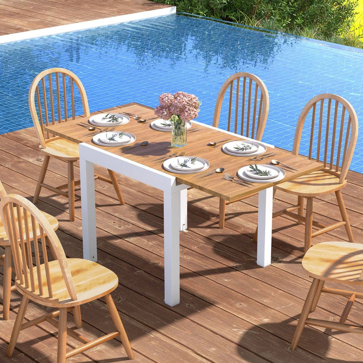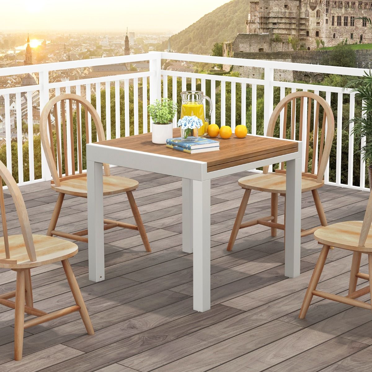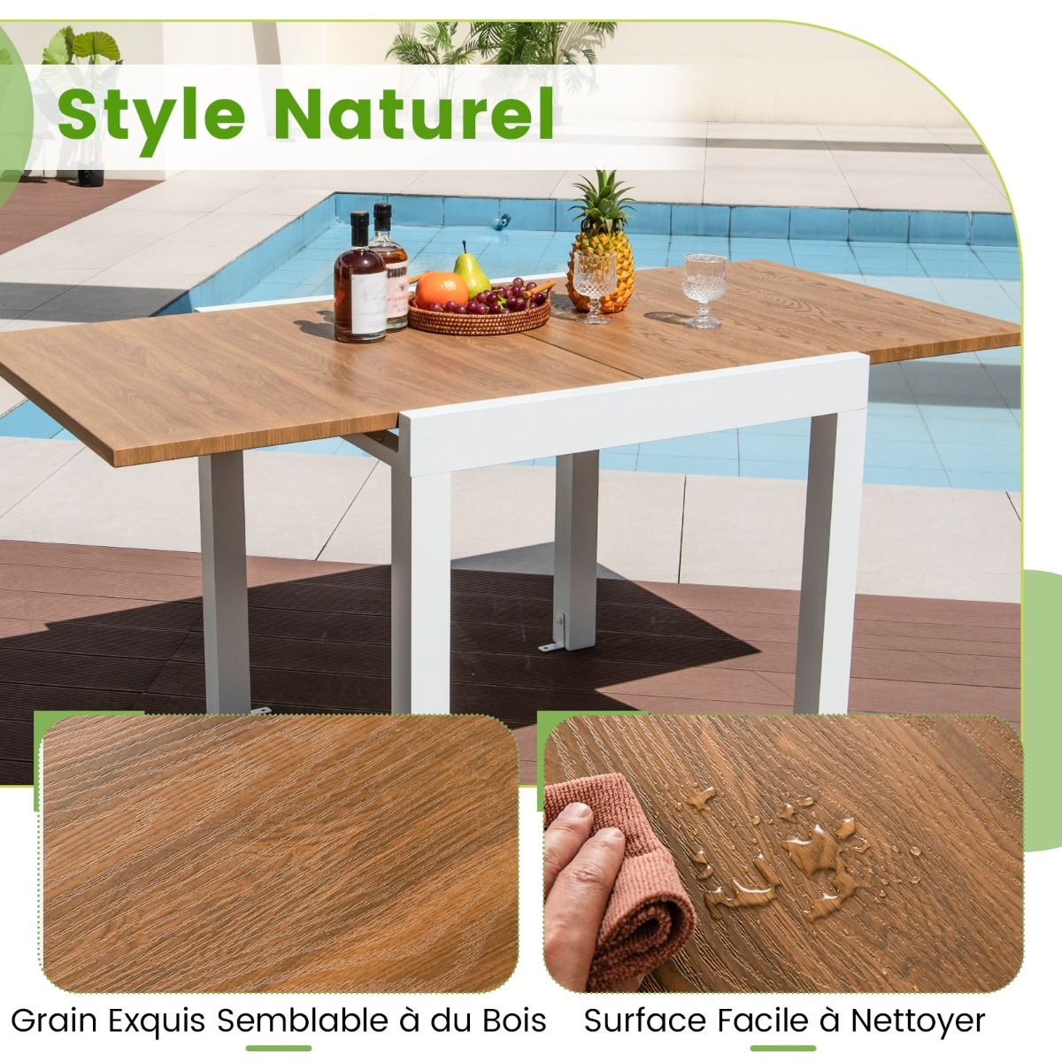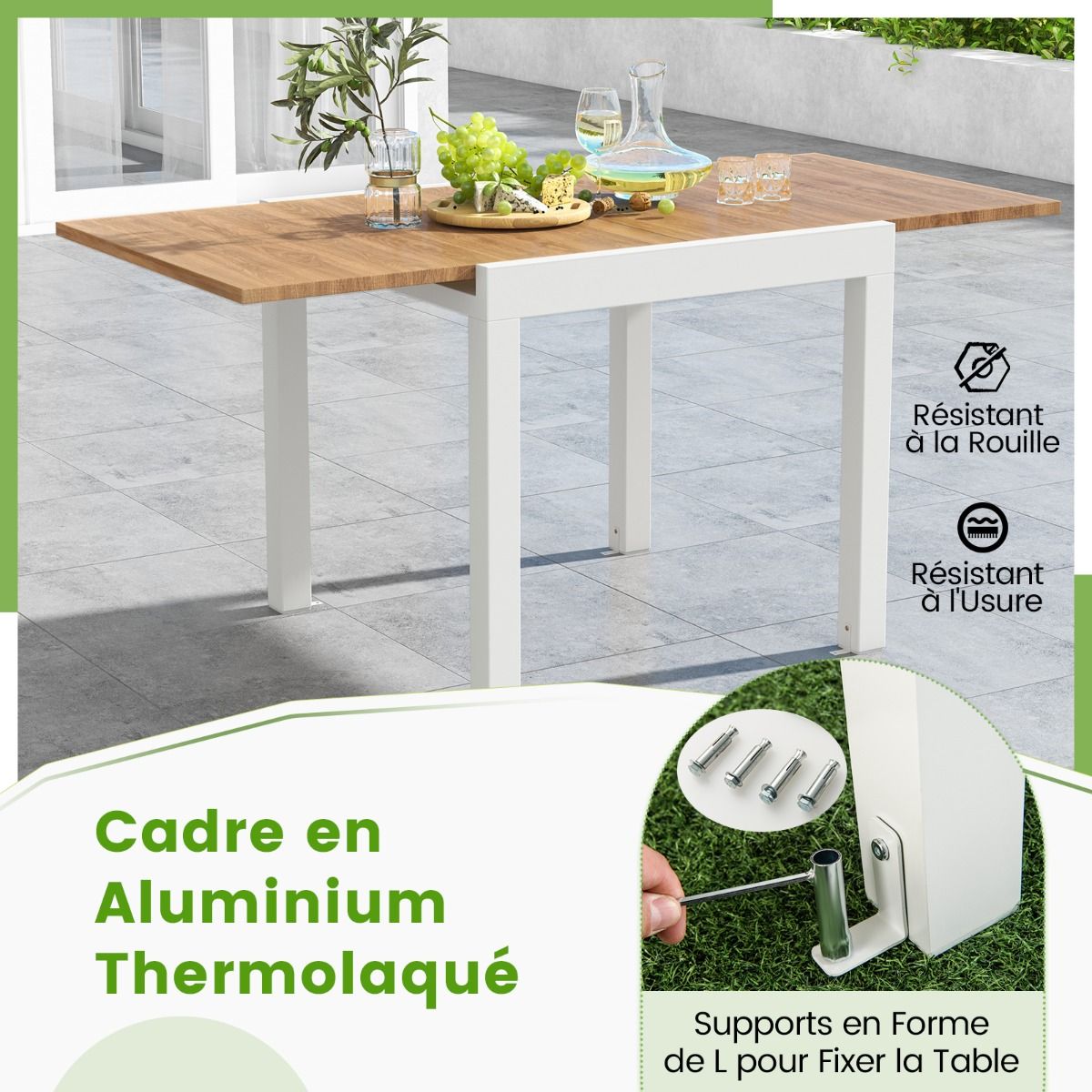 This multi-functional extendable patio dining table will elevate your outdoor dining experience! The cleverly designed table extends from 80cm to 160cm in length, easily accommodating 4 to 6 guests. Constructed from rust-resistant and durable aluminum, the table boasts a robust and stable structure for long-lasting use. Furthermore, the L-shaped support further enhances stability, firmly securing the table in place. This elegant and functional extendable table is ideal for both indoor and outdoor spaces. Product Features: Extendable Dining TableThis aluminum dining table is adjustable in length, extending from 80cm to 160cm, accommodating 4 to 6 people. Its ingenious design allows it to quickly transform from a cozy dining space into a spacious gathering platform. Aluminum StructureThis extendable table is forged from high-quality aluminum, making it rust-resistant and durable, capable of supporting up to 105kg. Its powder-coated surface is specifically designed for long-term outdoor use. Enhanced Stability and SupportThis table features an L-shaped support frame for added stability. These supports securely hold the table in place, allowing you to dine with peace of mind. Stylish and PracticalThe elegant design and smooth wood grain surface add a touch of sophistication to your patio, patio, garden, and poolside. This rectangular dining table is not only practical but also a beautiful decorative piece that enhances the atmosphere of gatherings. Care and SizeThe smooth surface is easy to clean. Furthermore, it requires no tedious maintenance under normal circumstances. Overall Dimensions: 80 x 80 x 75 cm. Overall Dimensions (Extendable): 160 x 80 x 75 cm. Product Features: 160 cm extendable dining table, seats 4-6 people. Multifunctional dining table, length adjustable between 80 and 160 cm. Extendable design for greater convenience and different needs. Powder-coated aluminum alloy frame, durable and suitable for long-term outdoor use. Comes with bolts and L-shaped brackets for securing the table. The exquisite wood grain makes the table even more attractive. Ideal for patios, patios, gardens, poolside, and indoor spaces. Specifications: Color: Gray/Natural Wood; Material: Aluminum, Metal; Overall Dimensions: 80 x 80 x 75 cm (Length x Width x Height); Unfolded Dimensions: 160 x 80 x 75 cm (Length x Width x Height); Tabletop Load Capacity: 105 kg; Net Weight: 11.5 kg. Package Contents: 1 x Dining Table; 1 x Instruction Manual.