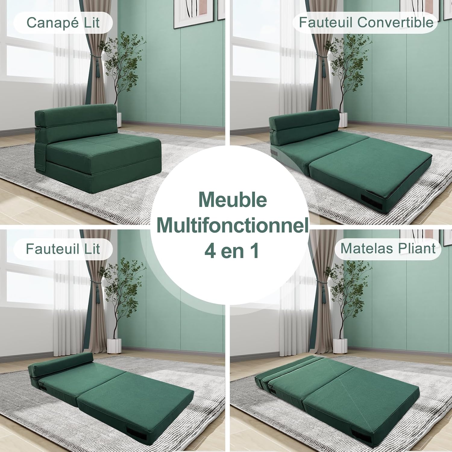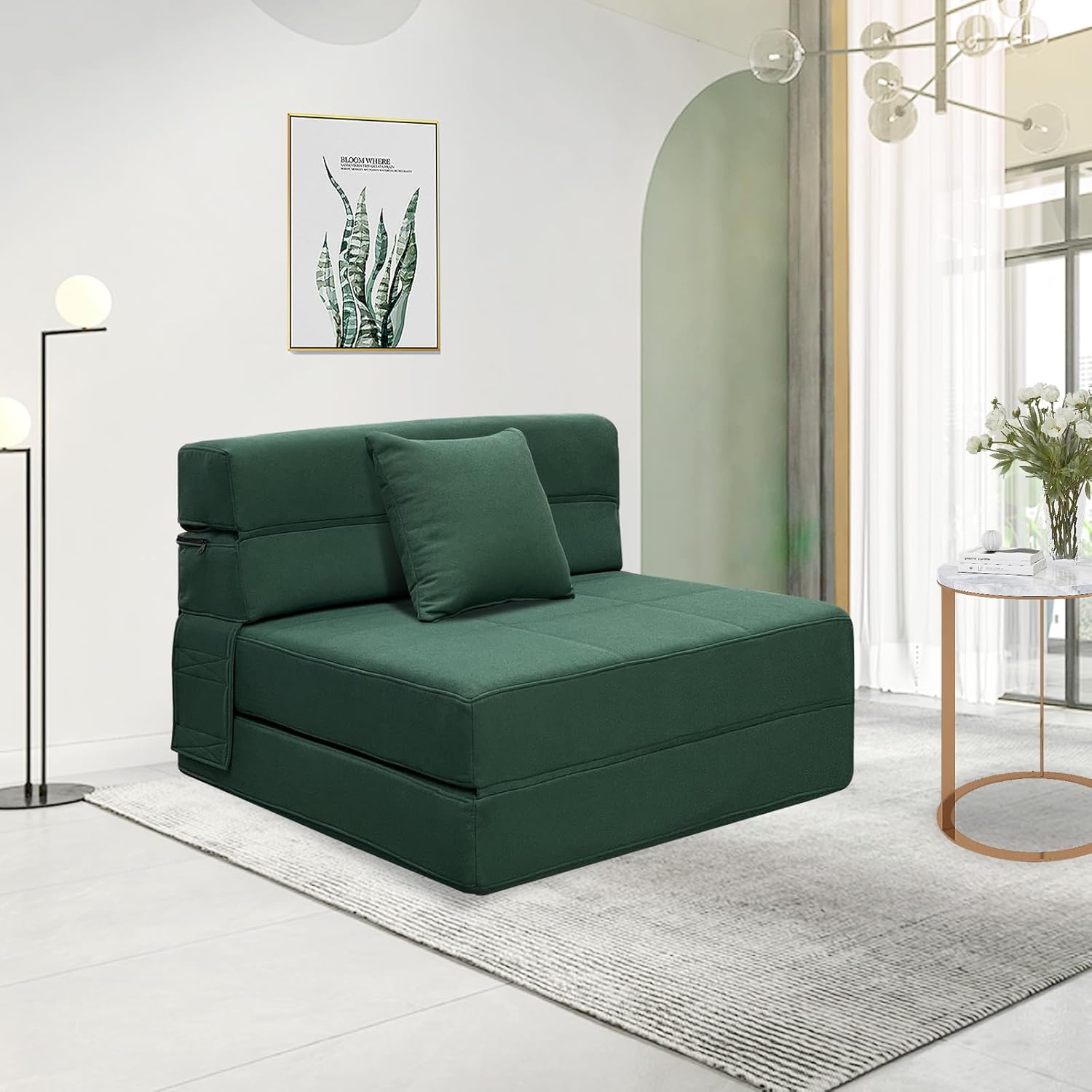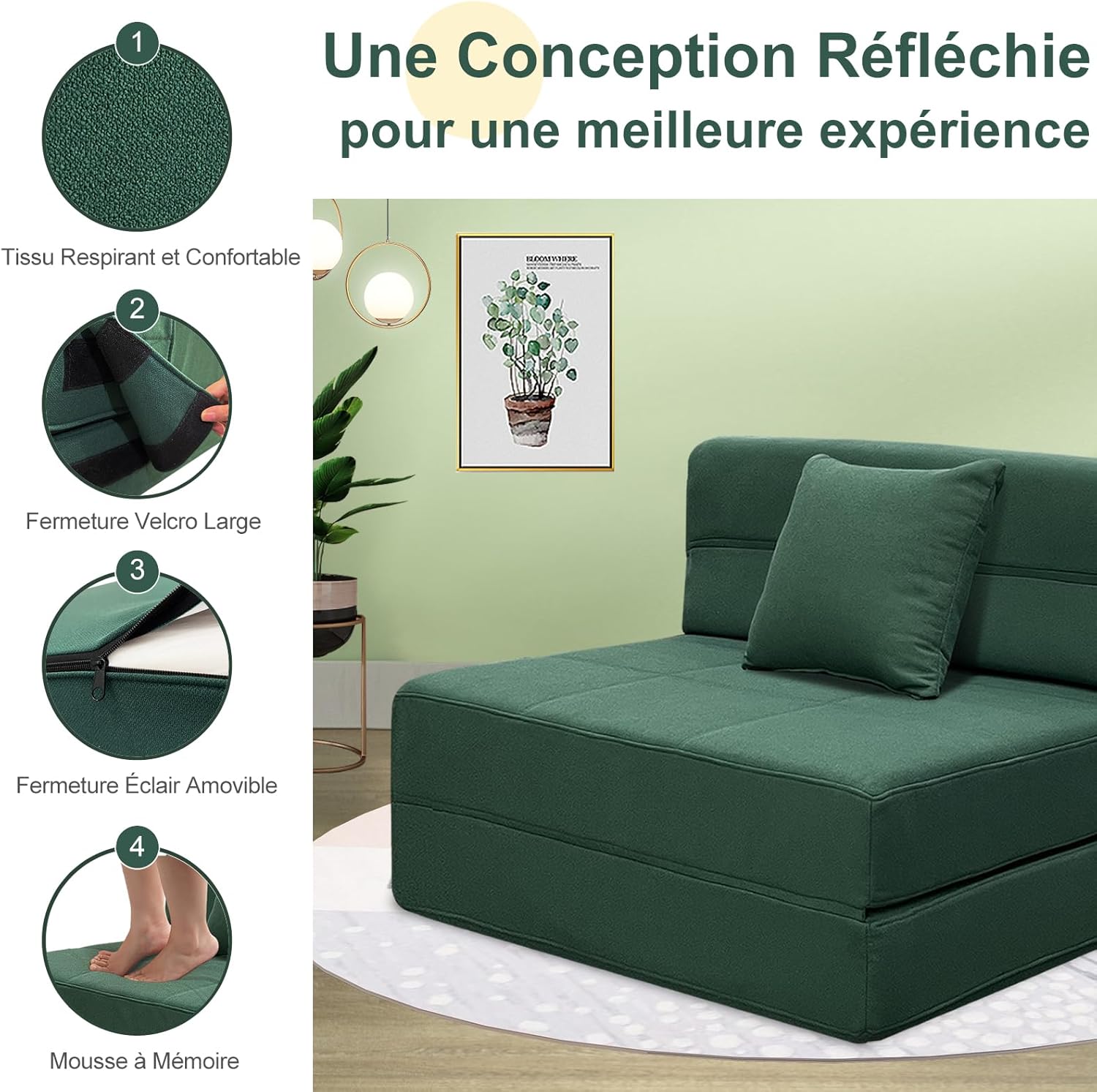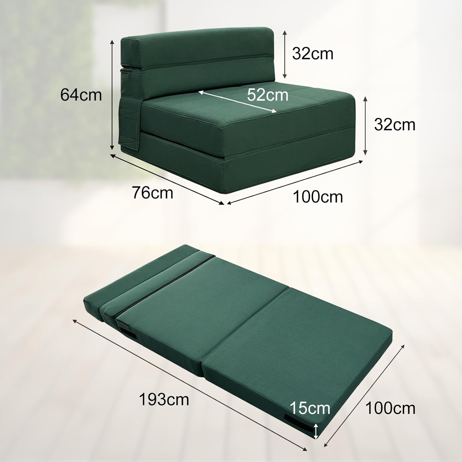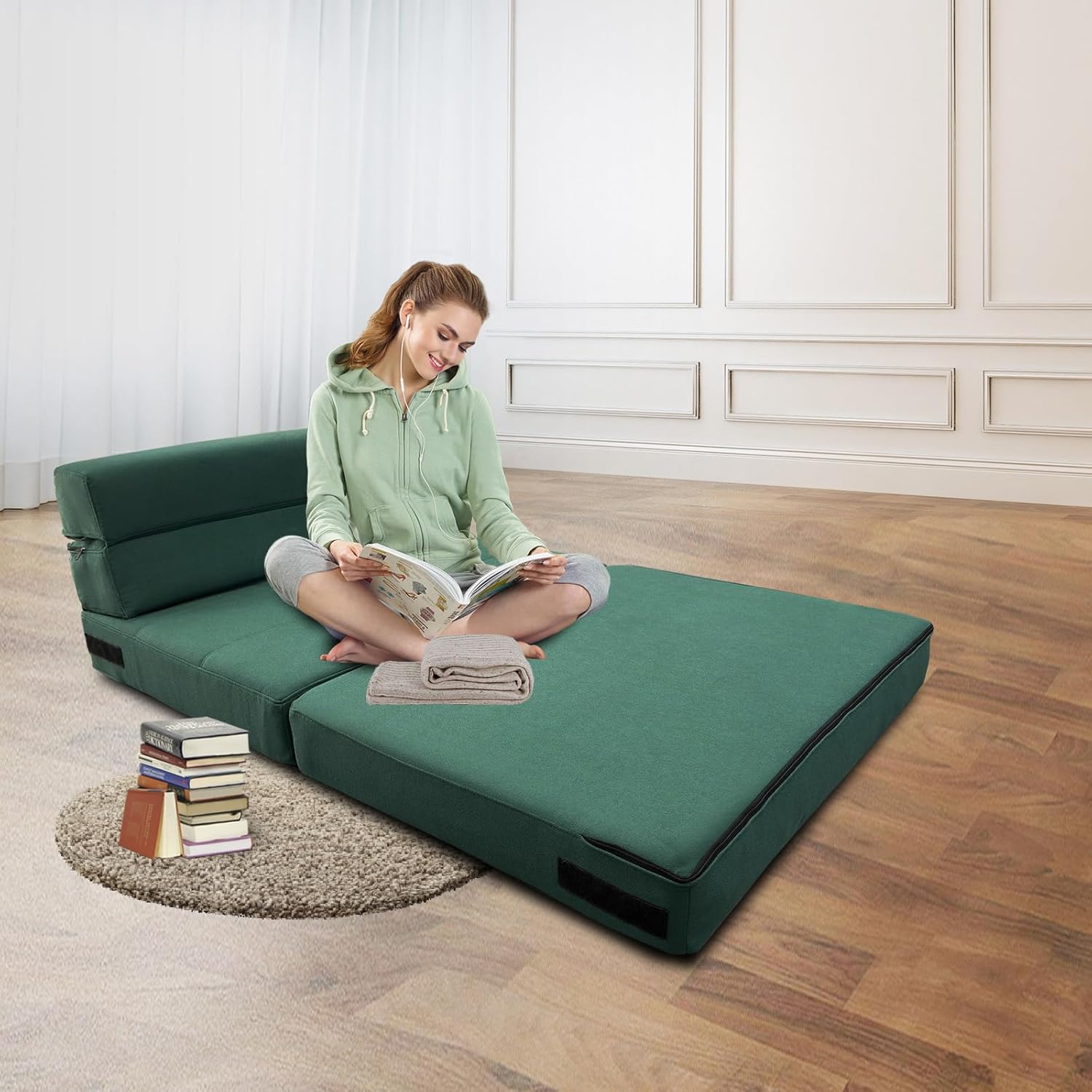 Floor-standing Sofa - High-Quality Fabric and Foam: The breathable dark green fabric is durable, stylish, and suitable for various furniture styles. This three-seater sofa bed uses high-density memory foam, which is comfortable, soft, and provides excellent support to help relieve pressure. You can enjoy a soft and comfortable experience for a long time. Ergonomic Design for Your Body's Comfort: This folding sofa bed perfectly conforms to your body's curves, and the included cushions provide better support for your lower back. Therefore, you will not feel tired even when sitting or lying on it for a long time. Secure Velcro and Zipper: Widened Velcro on both sides securely fixes the backrest to the seat cushion, making it more stable. In addition, this folding mattress comes with a zippered cover that can be easily removed and washed at any time. Folding Mattress - Multi-functional Folding Mattress: This folding mattress can be easily converted into a floor-standing sofa, bench, mattress, and stool to meet your various needs in different occasions. This lightweight folding mattress is easy to move, fold, store, and transport. Folding Foam Mattress - Space Saving: Our sofa bed features a multi-functional design with simple and smooth lines, providing a comfortable experience, and can be easily converted from a sofa bed into a bed for guests/friends. Ideal for spaces with limited capacity, such as living rooms, guest rooms, apartments, dormitories, game rooms, lofts, bedrooms, RVs, campgrounds, terraces, and campervans. We offer the most stylish home designs for you at the best prices, with the strictest quality control and fast delivery service. The folding square chair provides more seating space. Perfect for small apartments, dormitories, living rooms, and game rooms. This folding sofa is compact, lightweight, and easy to transport.