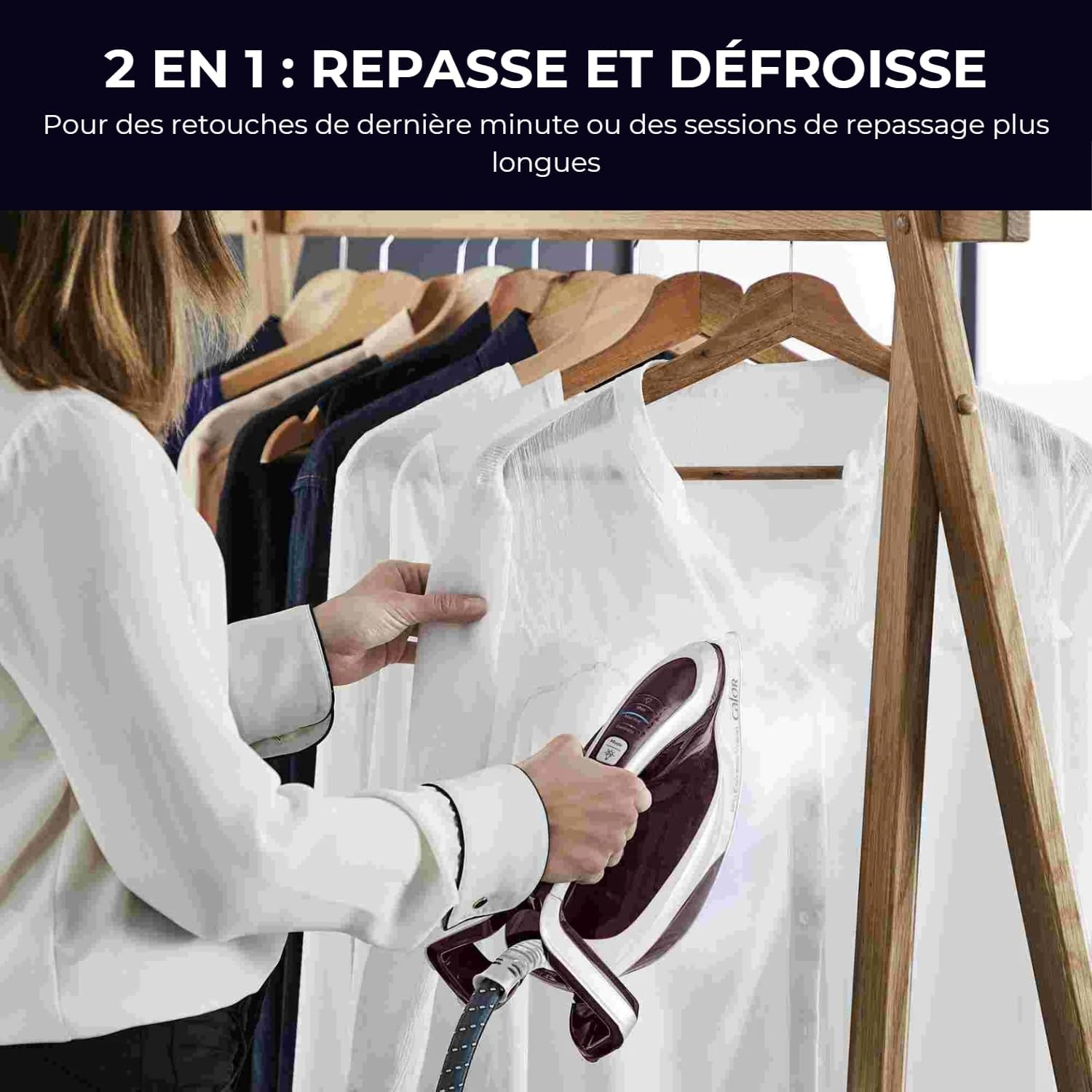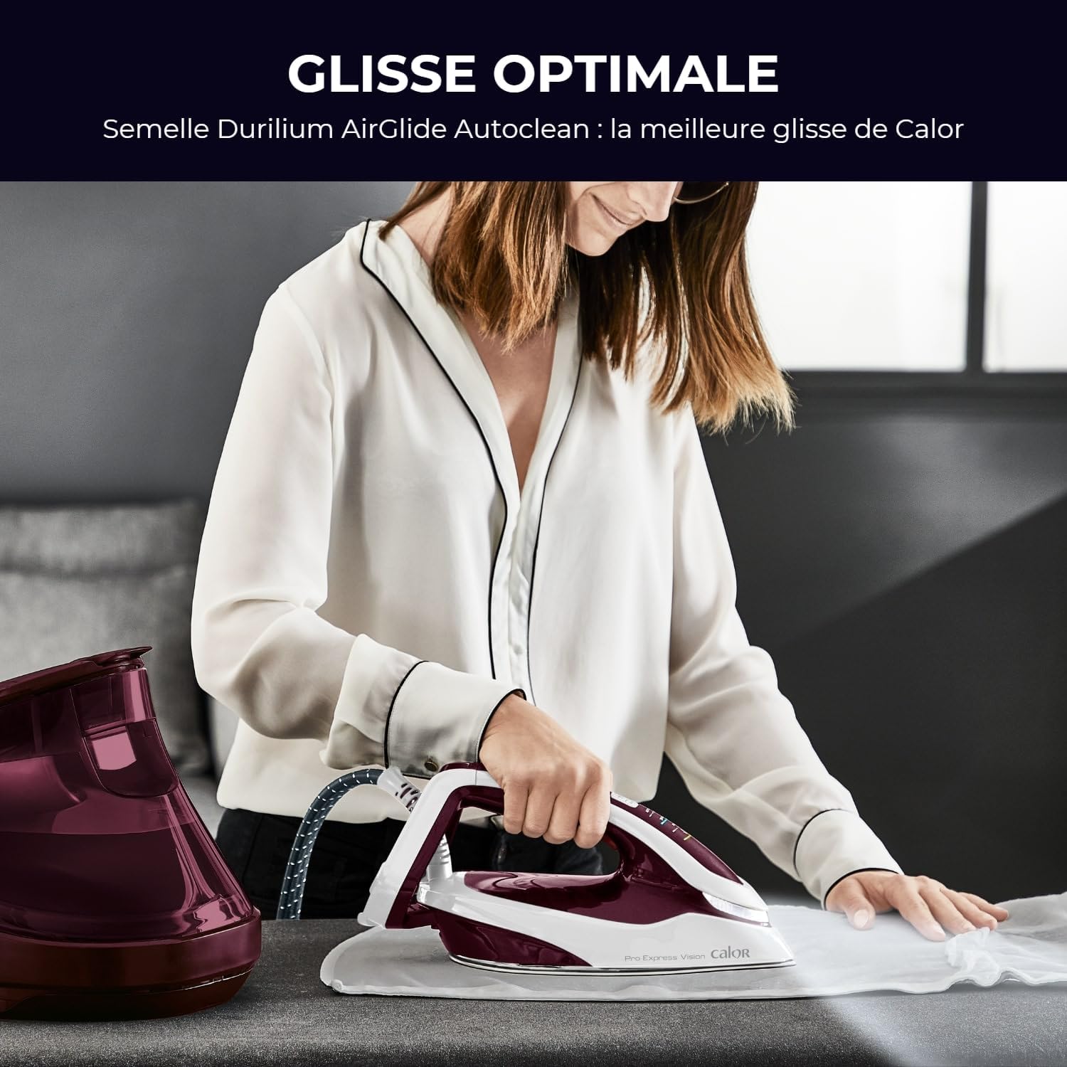 Intelligent LED Indicator: The LED light on the top of the iron automatically illuminates when the iron is in a horizontal position, ensuring consistent ironing results regardless of your location. Powerful Steam: The ultra-powerful steam generator delivers a continuous steam output of up to 180 grams per minute, with a powerful steam jet reaching 680 grams per minute, easily smoothing stubborn wrinkles. Steam pressure reaches up to 8.3 bar. Multifunctional: A 2-in-1 ironing function combines ironing and steam ironing, meeting your needs for quick or long-term ironing, helping you easily create perfect styles. Anti-scaling System: Patented limescale collector ensures durability and extends the life of the steam generator. 15-year repairable warranty, 2-year guarantee. Drip-proof Protection: The drip-proof system prevents water stains on clothes. Convenient Design: Steam settings can be adjusted directly on the handle. Quiet Technology: Quiet technology reduces steam generator noise by half, providing a more comfortable ironing experience [**compared to the GV92 series from the same manufacturer]. Smooth Experience: The Durilium AirGlide Autoclean soleplate keeps the fabric clean, delivering the smoothest ironing experience Calor can provide. Made in France: This Pro Express Vision steam generator is produced in Calor's factory in Pont-H��v��c, Is��re, France. The Calor Pro Express Vision steam generator combines powerful steam with intelligent design, allowing you to iron clothes with ease and achieve perfect results every time. The intelligent LED vision system, equipped with lighting, ensures a more comfortable ironing experience, allowing you to clearly see the ironing process from anywhere in your home.