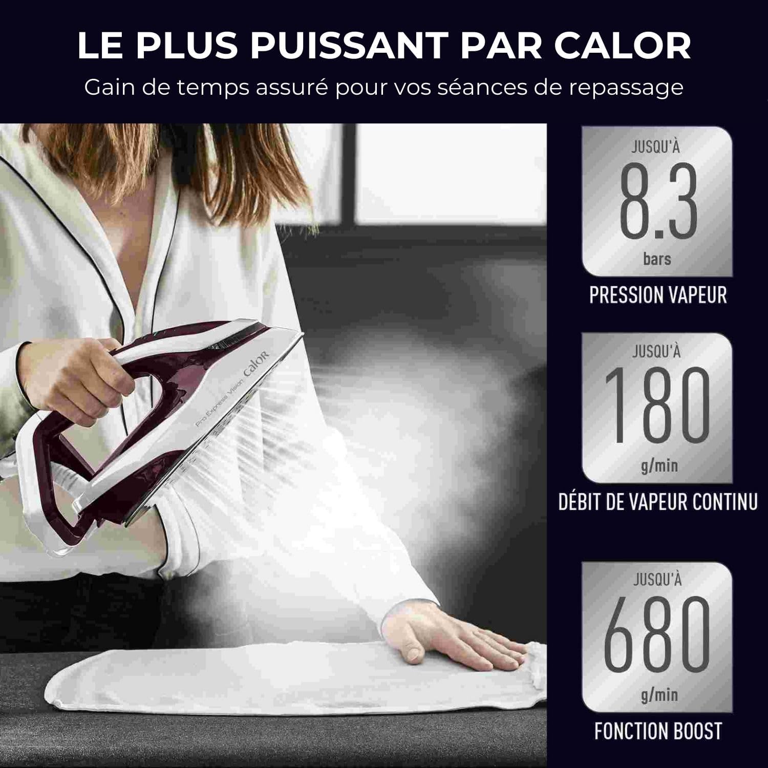 • Calor Pro Express Vision Steam Generator Iron, Smart LED Light on the Iron, 8.3 Bar Pressure, Ultra-Powerful, 180 g/min Steam Output, 680 g/min Steam Boost, Anti-scale, Made in France GV9810C0