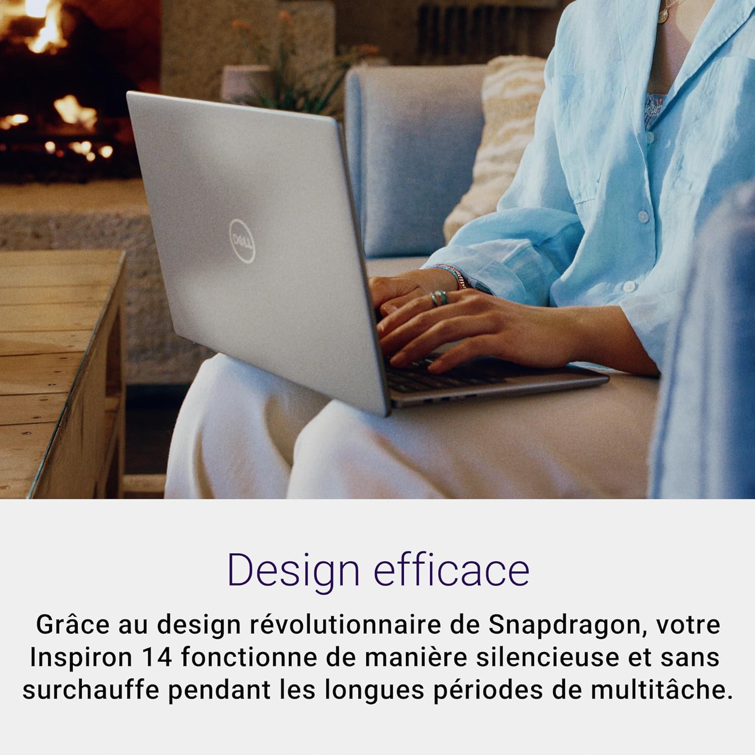 14-inch FHD+ (1920x1200) 16:10 aspect ratio screen, 300 nits brightness Full HD+ resolution and a 16:10 aspect ratio optimize workflow, reduce scrolling, and let you enjoy vibrant, vivid images and sharp, clear visuals. The screen brightness reaches up to 300 nits, ensuring clear visibility even in various lighting conditions. Snapdragon X Plus octa-core processor with built-in AI for superior performance The Snapdragon X Plus processor, equipped with AI technology, delivers a smooth and responsive experience, efficiently handling multitasking while reducing power consumption, perfectly meeting the needs of extended daily use. 16GB high-speed LPDDR5X memory and 512GB SSD for smooth multitasking Ultra-high-speed LPDDR5X memory allows you to run multiple applications simultaneously without lag, while the 512GB PCIe SSD ensures fast boot times and secure storage for your large files, including photos, videos, and professional documents. Ultra-thin and lightweight design (only 17.9 mm thick) with long battery life this laptop is so thin and light that you can take it anywhere. Long battery life lets you work, watch videos, or create all day without worrying about charging. Advanced connectivity with ultra-fast Wi-Fi 7 and enhanced security with a fingerprint reader and FHD infrared camera quickly connect to low-latency wireless networks for smooth browsing, uninterrupted video calls, and buffer-free streaming. The integrated fingerprint reader and infrared camera provide secure login via facial recognition, further enhancing security. Quiet operation and advanced thermal management ensure stable performance thanks to the Snapdragon processor's thermal optimization design, the Inspiron 14 stays quiet and cool even when handling heavy tasks or running multiple applications simultaneously. Dell Inspiron 14 Laptop, FHD+ Display, Qualcomm Snapdragon Processor, 16 GB LPDDR5X RAM, 512 GB SSD, Qualcomm Adreno GPU, Windows 11 Home - Titan Gray, 1-Year Warranty, NBD OS