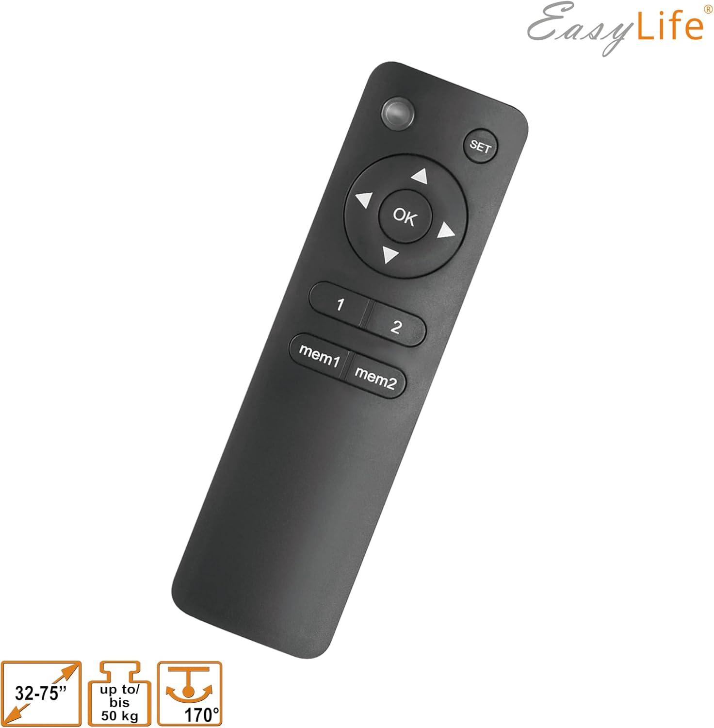 Superior Design: Powerful yet ultra-quiet motor (< 55 dB), equipped with 2 memory positions and an integrated anti-collision protection system; ultra-thin design, only 56 mm from the wall, ambidextrous installation. Attention to Detail: Integrated cable management system, sleek appearance; adjustable rail system for flexible installation of 32 to 75-inch screens, maximum load capacity of 50 kg. Versatile: VESA compliant, 200x200 to 600x400 mm, flexible rotation from 0Spend to 170Spend, ideal for TVs, monitors, smart whiteboards, or multimedia displays. Key Features: Ultra-quiet motor, integrated anti-collision protection system; wide rotation range from 0Spend to 170Spend; ultra-thin design for wall or shelf installation. Media/TV Stand Package Includes: 1 EasyLife Rotating Wall-Mounted TV Mount (with motor, color optional), 1 remote control, 1 set of wall-mounting accessories (including drilling template), 1 set of VESA TV mounting accessories, and 1 assembly instruction manual. Our screen mounts are suitable for any location where you need a TV but are unsure how to position it due to space constraints. The quad and tripod mounts are ideal for schools and meeting rooms as they are portable and require no complicated assembly. The built-in anti-tipping protection is especially suitable for classrooms. For home users, we offer a variety of rotating wall-mounted and ceiling-mounted mounts, allowing you to adjust the position and folding angle of your device as needed. EasyLife is committed to providing excellent after-sales service. Our experts are familiar with every detail of our products and will be happy to assist you even after your purchase. All our products undergo rigorous testing to ensure the best support and most reliable quality for our customers. As a German company, we offer top-notch German quality. A New Definition of Elegance: The EasyLife motorized TV wall mount combines style, functionality, and convenience. Its matte finish allows it to blend elegantly into any interior design, while the wireless remote with memory function makes operation effortless. They optimize space, deliver a high-quality entertainment experience, and maintain a minimalist style in your home. Available in black (ELWH-M1S) and white (ELWH-M1W). The EasyLife ELWH-M1S and ELWH-M1W TV wall mounts perfectly combine modern design with innovative technology. Free up space in your living room and enjoy a minimalist aesthetic. With their simple operation and high-quality surface finish, they will become a highlight in any room. The motor operates extremely quietly (<55 dB), producing virtually no noise. You can operate it using the included remote control, whose long-range control provides ultimate convenience. Quickly adjust the TV to your desired position using just two preset positions! 1. Which device is suitable? 2. What is its rotation speed? 3. Installation control 4. Is this wall mount suitable? 5. Determine the VESA standard. VESA standard: 200x200 to 600x400. Maximum size: 75 inches. Applicable Equipment: Curved/LED/LCD/QLED/OLED/plasma screens, multimedia displays, smart whiteboards, etc. Maximum Load Capacity: 50 kg. Motor Noise: <55 dB. Power Supply: AC100-240V 50/60Hz (power adapter included). Control Method: Remote Control