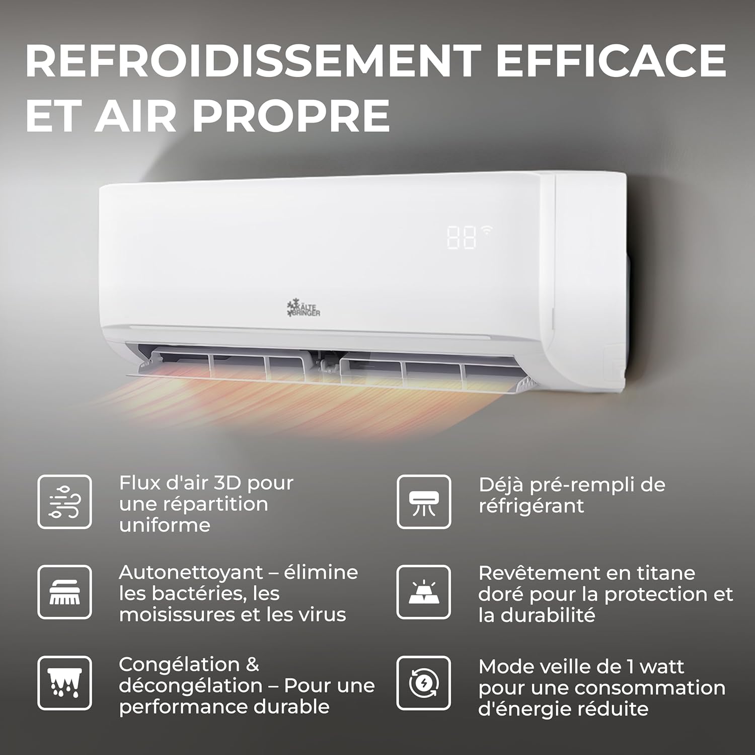 Energy-efficient split-type air conditioner: Utilizes DC full inverter technology, achieving up to 50% energy savings. Cooling A++, Heating A+. Made of TitanGold material for durability. Germany's No.1 brand: Kaltebringer Best Air Conditioning Brand (Focus Money 2026, Issue 28). Three-time winner of the NTV Lifestyle and Living Award (2023-2025). Powerful inverter technology: Split-type air conditioner, highly efficient cooling and heating, stable temperature, and low energy consumption. Wi-Fi air conditioner: Controllable via App (iOS, Android), Alexa, and Google Assistant. Remotely adjust temperature, timer, and mode. R32 complete set: Includes 5 meters of insulated piping and pre-charged R32 refrigerant for easy installation. Meets 2025 standards. Ideal for homes and offices. 12000 BTU (3.5 kW) 9000 BTU (2.6 kW) 12000 BTU Quick Connect 18000 BTU (5.3 kW) 18000 BTU Quick Connect 18000 BTU Split Air Conditioner 27000 BTU Split Air Conditioner Customer Reviews Important Note: Installation of the air conditioning system can only be carried out by companies certified to comply with European F-Gas Regulation 2026 573. Signing the purchase contract indicates your confirmation of compliance with this regulation. Refrigerant leaks contribute to climate change. When a leak occurs, refrigerants with low Global Warming Potential (GWP) have a smaller impact on global warming than refrigerants with high GWP. The refrigerant used in this system has a GWP of 675. Therefore, the global warming impact of a 1 kg leak of this type of refrigerant will be 675 times that of a 1 kg CO2 leak over a hundred years. Do not modify the refrigeration circuit or disassemble the equipment without authorization always contact a qualified person for operation. Find the right air conditioner for you.