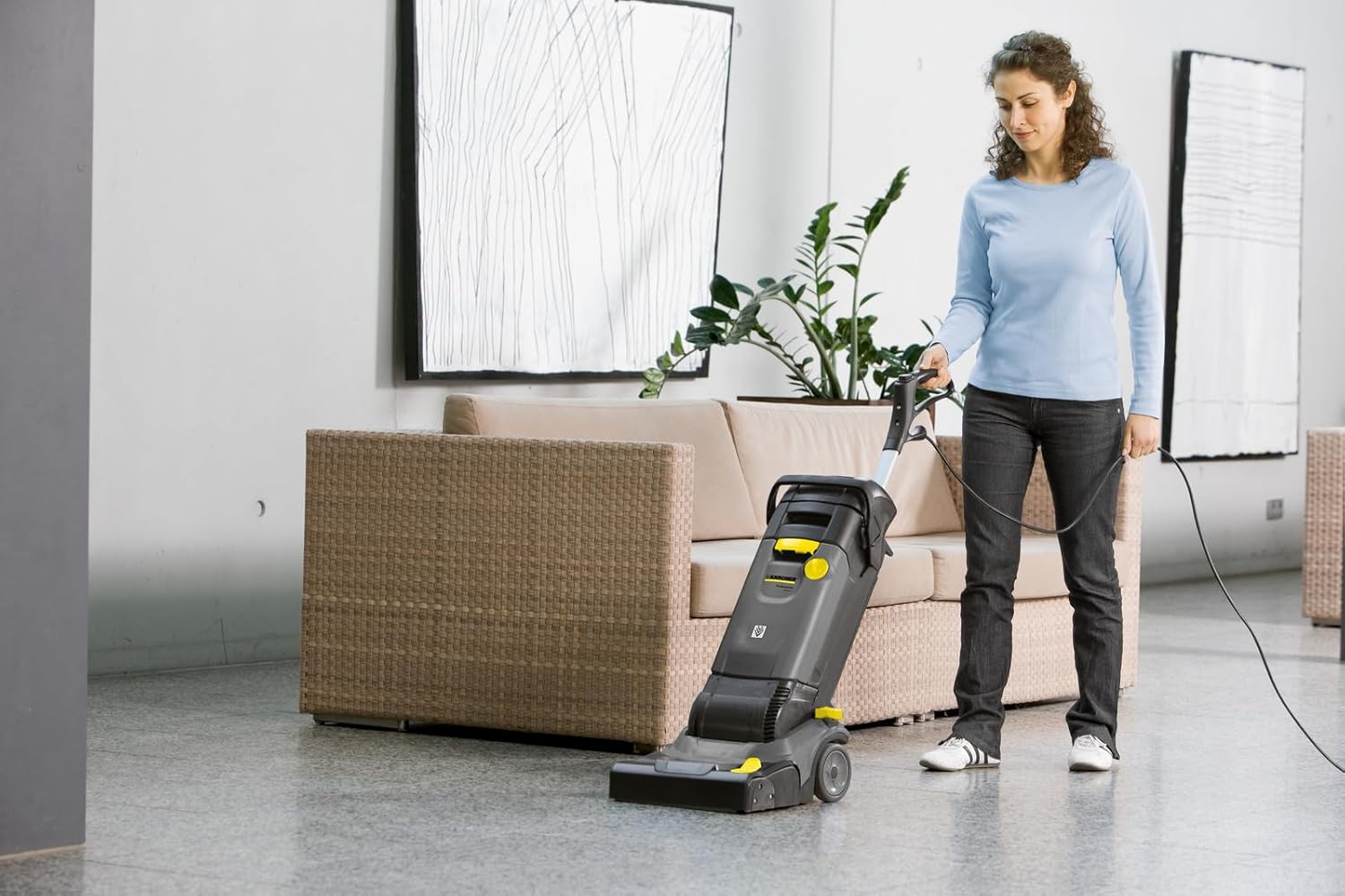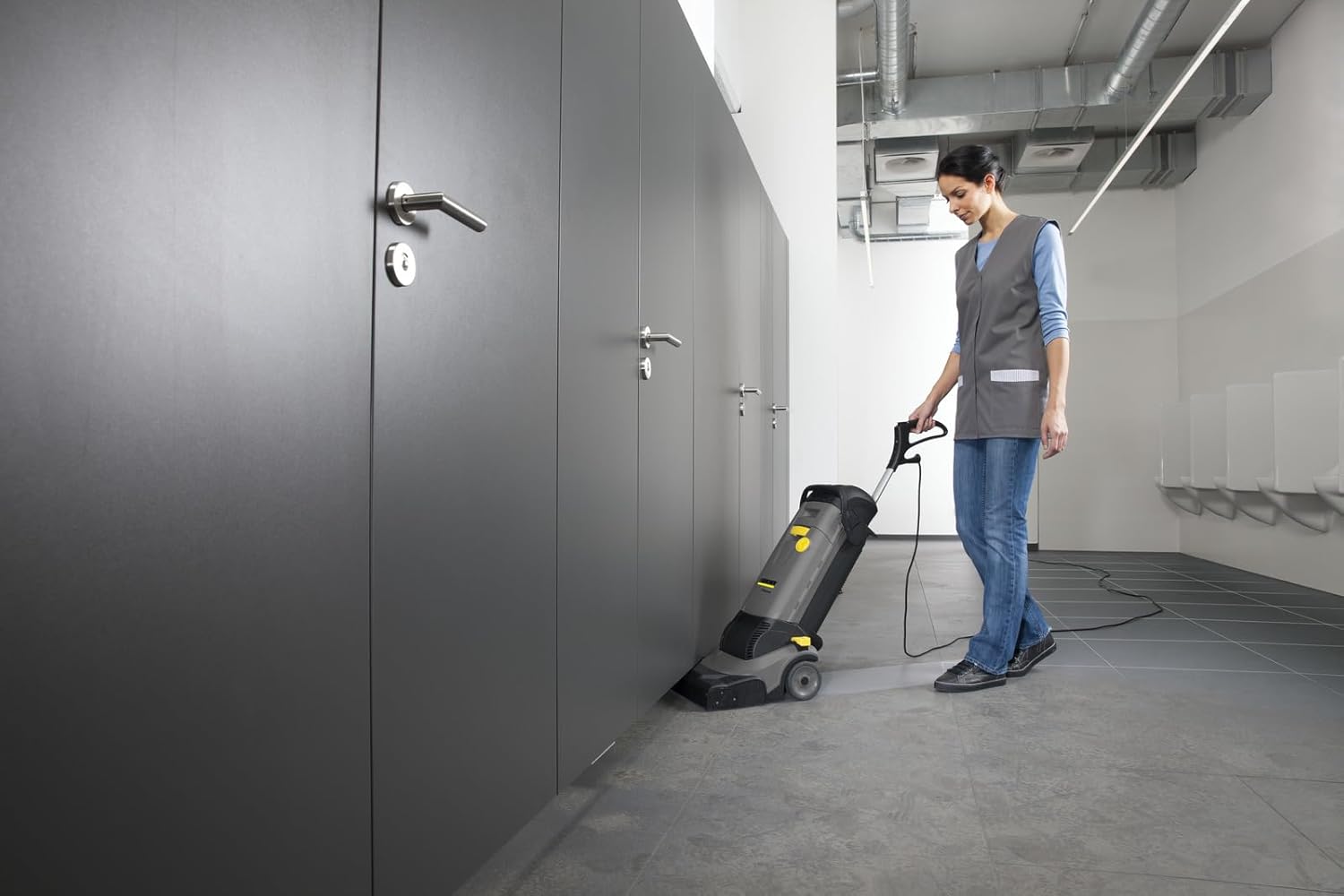 Highly Effective Cleaning: The high-speed rotating cylindrical brush head delivers 10 times more pressure than manual cleaning effortlessly cleaning even textured surfaces or seams. Quick Drying: The flexible suction lip dries the floor, making it immediately walkable. The vacuum function can be turned off if needed. Easy to Use: The wheels ensure the machine moves forward automatically without pushing, making it easy and effortless to use. Removable Water Tank: The cleaning water tank and wastewater tank can be removed separately or together for easy refilling and emptying. Product Includes: BR 30 4 C and cylindrical brush head. The Karcher BR 30 4 C is a compact floor scrubber, an innovative and efficient alternative for cleaning hard floors ranging from 20 to 200 square meters. After cleaning, the floor dries instantly, is non-slip, and walkable again. It is ideal for cleaning small shops, restaurants, service stations, supermarkets, restrooms, hotels, snack bars, or as a supplement to existing floor scrubbers. Thanks to its unique design, this machine is as easy and convenient to operate as a vacuum cleaner. Compared to traditional mopping, it boasts ten times the pressure, resulting in significantly enhanced cleaning power. This is thanks to its roller speed of approximately 1500 rpm. It can vacuum in both directions. For stubborn stains, the wand can be raised to extend the contact time between the cleaning solution and the dirt. The BR 30 4 C comes with a cylindrical brush head.