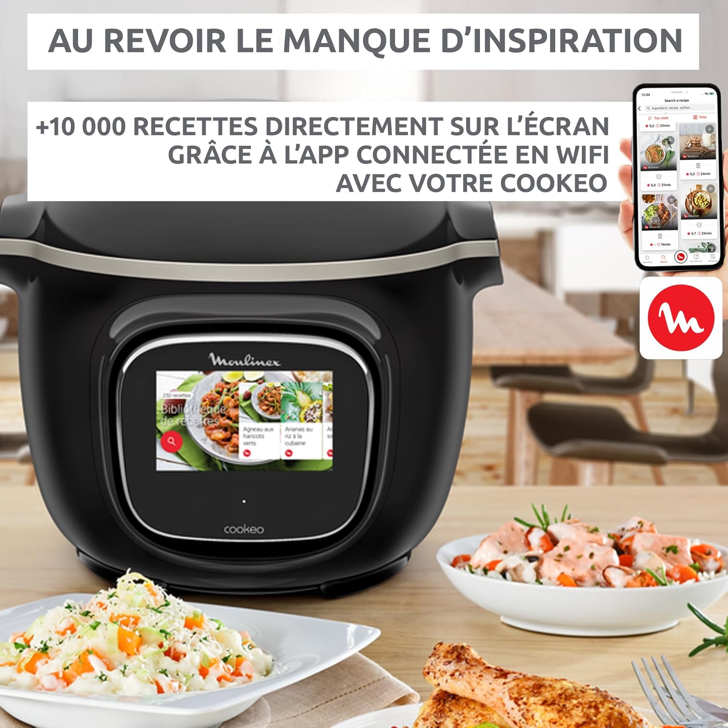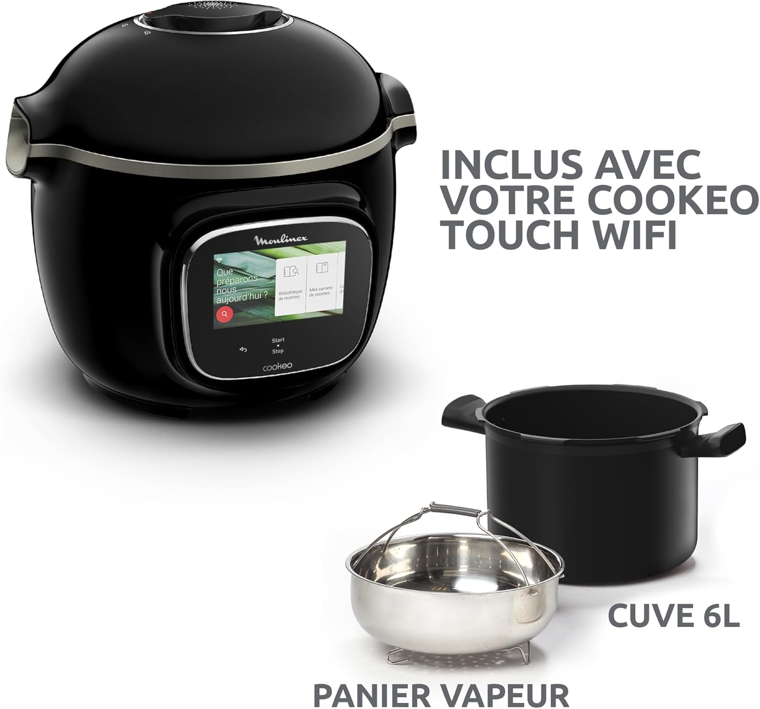 Unlimited Inspiration: Access a vast library of free recipes via Wi-Fi and easily cook everyday meals. Easy Cooking: Step-by-step instructions with pictures and videos on a large, tiltable touchscreen help you perfectly execute recipes. Quick Cooking: Explore over 100 recipes that can be completed in under 10 minutes, with 13 cooking modes including Ultra-Fast Pressure Cooking (Quick Cook), Steam (Vegetables), Slow Cook (Rice), Grill or Slow Cook (Meat, Stew), and Heating. Find the Perfect Recipe: Search for recipes based on what you have in your fridge, or use the on-screen filters. 15-Year Warranty at Affordable Prices: With 6,200 service locations worldwide, we offer a 15-year warranty at affordable prices. Contribute to Environmental Conservation and Reduce Waste, Saving Time: Effortless: Cookeo manages your cooking, automatically reducing your stress. Exclusive free app*: Get more inspiration, create your own recipes, remotely monitor your cooking process, and share tips with the community (*App Store for iPad 3/iPad mini, iPhone 4S and later; Google Play for Android 4.3 and later). Large 6-liter capacity: Cooks meals for up to 6 people. Includes: Dishwasher-safe non-stick inner pot and steaming basket. Add new features to your Cookeo: Add a crispy texture to your dishes with the EXTRA CRISP accessory (sold separately). The Moulinex Cookeo Touch wifi smart connected pressure cooker makes cooking easy, fast, and inspiring. Finding inspiration and cooking has never been easier. Its large touchscreen offers a vast library of recipes, guiding you step-by-step with pictures and videos, and automatically sets cooking times to ensure perfect results every time. Save time with hundreds of recipes that can be completed in 10 minutes, a simplified search function to help you find the perfect recipe, and even recipes using ingredients already in your refrigerator!