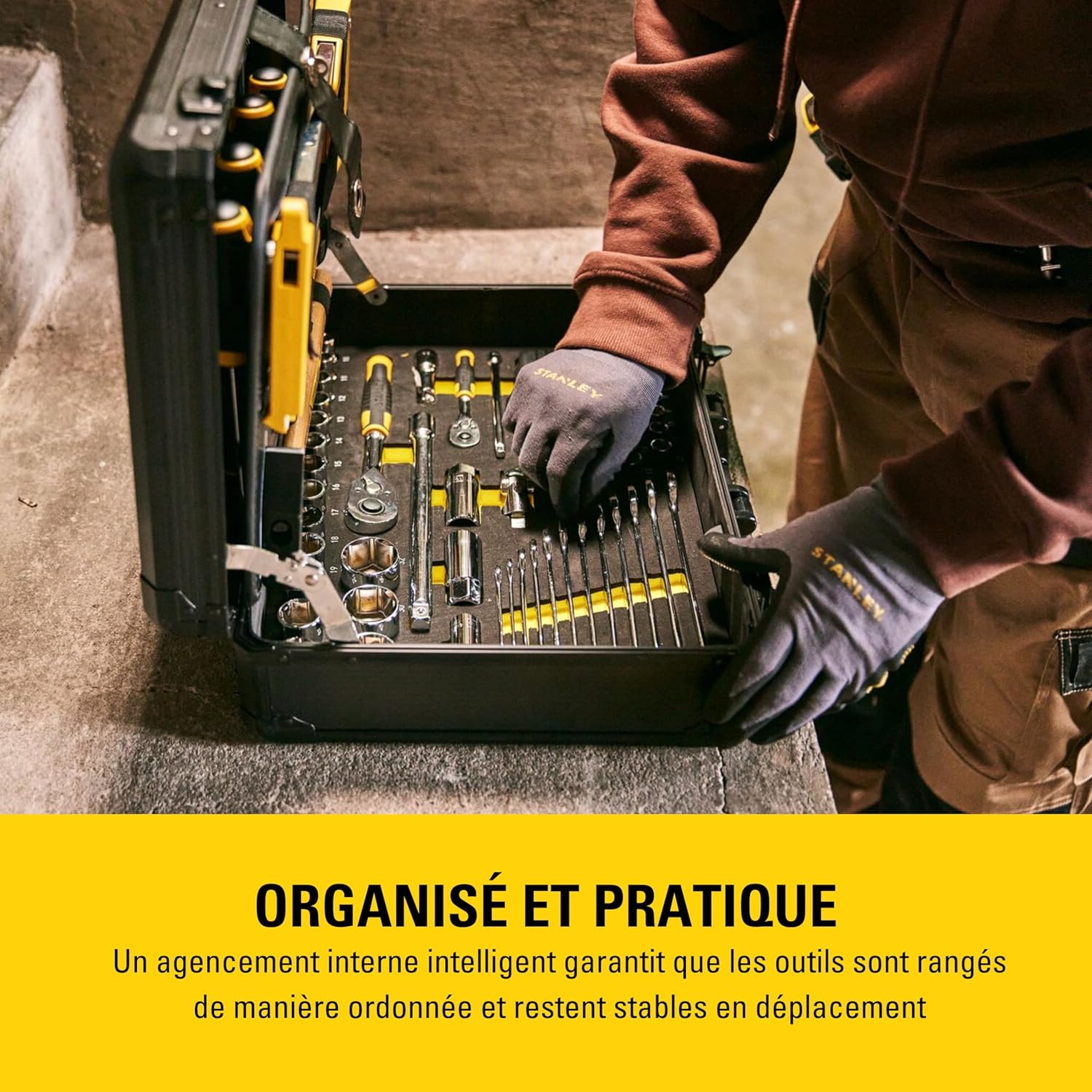 A fully functional and versatile workbench: 4 easily accessible compartments containing essential tools. Practical: Secure tool storage with elastic and Velcro pockets - Carefully designed compartments and elastic and Velcro pockets for convenient tool storage. Compact and ergonomic design: Dual-material handles - Protective foam between compartments and at the bottom to secure ratchet wrenches/sockets/wrenches - 4 feet for added stability. Easy access: The central panel has two opening positions with metal hinges and a safety strap for easy tool access. Robust and durable: Aluminum body with lining - Metal hinges with locking mechanism - Metal latches - Reinforced corners. A fully functional and versatile workbench: 4 easily accessible compartments containing essential tools. First layer: 1 pair of 250mm multi-purpose pliers; 1 pair of 150mm diagonal pliers; 1 pair of 150mm long semi-circular pliers; 1 pair of 150mm combination pliers; 1 pair of multi-purpose cutting pliers; 1 pair of 250mm adjustable wrench; 1 6-compartment toolbox. Second layer: 1 pair of 25cm magnetic dual-material torpedo level; 1 roll of 5m x 19mm dual-material Tailong tape measure; 8 screwdrivers: bit holders - PH1-PH2 - PZ1-PZ2 - mechanical screwdrivers 6.5x150-5.5x100-3x75, 1 test screwdriver; 9 Allen wrenches (1.5-2-2.5-3-4-5-6-8-10). Level 3: 1 hacksaw; 1 pen-shaped flashlight (batteries not included); 1 pair of 18mm pliers. 1 300g wood-handled hammer, grade 4; 1 72-tooth 1/4-inch ratchet wrench; 10 1/4-inch sockets (6-point): 5.5 6 7 8 9 10 11 12 13 14 mm; 2 1/4-inch extension bars: 75 mm 150 mm; 1 1/4-inch bit holder; 1 1/4-inch universal joint; 1 72-tooth 1/2-inch ratchet wrench; 16 1/2-inch (6-point) sockets: 10 11 12 13 14 15 16 17 18 19 21 22 24 27 30 32 mm; 2 1/2-inch extension bars: 75 mm 250 mm; 1 x 1/2 inch universal joint; 3 x 1/2 inch spark plug sockets: 16 19 21 mm; 12 combination wrenches: 8 9 10 11 12 13 14 15 16 17 18 19 mm; a set of 1/4 inch (25 mm) screwdriver bits, totaling 61 pieces, housed in a durable pre-molded foam box: aluminum casing, lined interior - metal hinges with locking mechanism - metal buckles - reinforced corners. Maximum protection and comfort: dual-material handles for a better grip - protective foam between compartments - pre-cut foam in the bottom of the box for storing ratchet wrenches/sockets/wrenches - four feet for added stability during use.