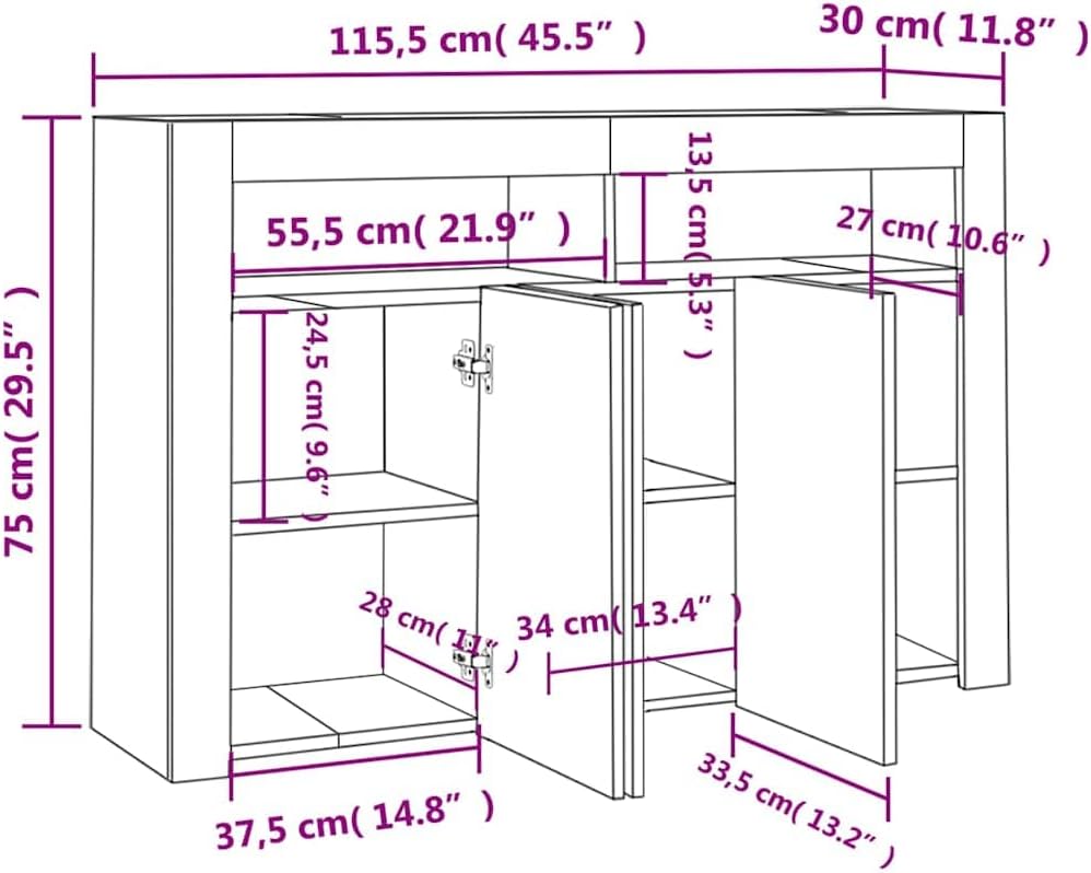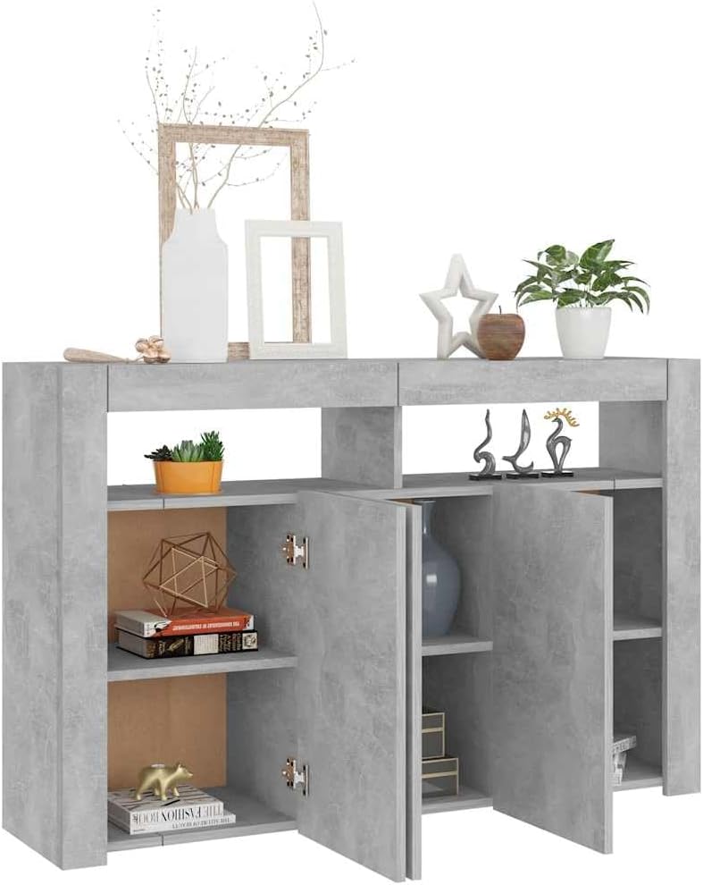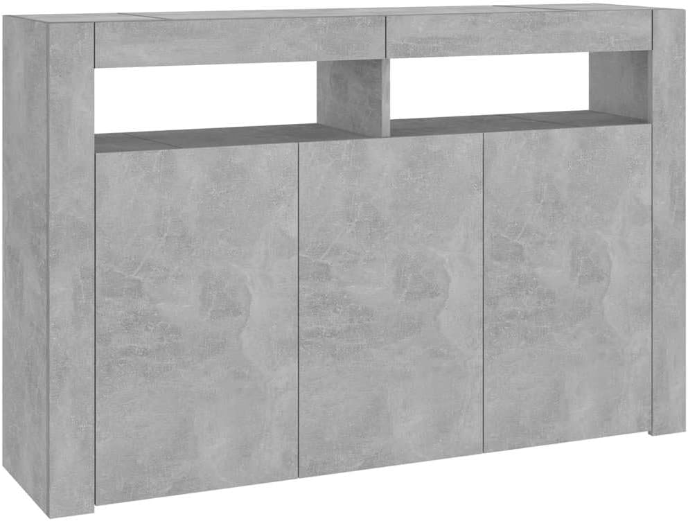 This sideboard with LED lights boasts a simple yet practical and beautiful design, making it an ideal choice for your home! Durable Material: Made of high-quality engineered wood, it features a smooth surface, is sturdy and durable, highly stable, and moisture-resistant. RGB LED Lights: The sideboard is equipped with vibrant RGB LED lights. Multiple customizable menus allow you to easily change the light color and even set an automatic mode. These LED lights not only enhance the modern feel of the sideboard but also add to its stylish appeal. Ample Storage Space: The cabinet provides ample storage space, allowing you to neatly organize and easily access everyday items. Display Function: The sturdy countertop of this entryway cabinet is perfect for displaying decorative items, picture frames, or potted plants. This sideboard with LED lights, with its practicality, is sure to become an ideal choice for your room. The sideboard has a robust and durable structure. It also provides ample storage space for books, media equipment, and other items. The sturdy countertop is perfect for displaying decorative items, picture frames, or potted plants. This cabinet is equipped with RGB LED lights, allowing you to change the light color through different menus and supporting automatic color adjustment. The LED lights accentuate a modern feel, creating a stylish and trendy atmosphere. Note: This product has a USB port, but a certified 5V USB power adapter is not included. Colors: Black/White/White/Sonoma Oak/Cement Grey/White and Sonoma Oak/Gloss White/Gloss Black/Gloss Grey/Smoked Oak/Sonoma Grey/Brown Oak. Material: Particleboard. Assembly required.
